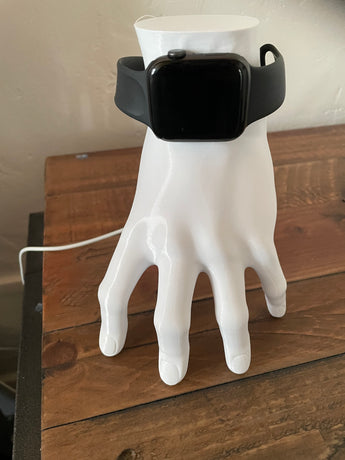 Schlichtes und stilvolles Uhrenarmband für eine Apple Watch, gestaltet wie eine Hand. Das kabellose Ladegerät kann in der Hand platziert werden und für den Zusammenbau ist kein Kleber erforderlich. Mit dieser Halterung bekommt Ihre Apple Watch einen schönen und praktischen Platz auf Ihrem Nachttisch, Schreibtisch oder wo auch immer Sie sie haben möchten.