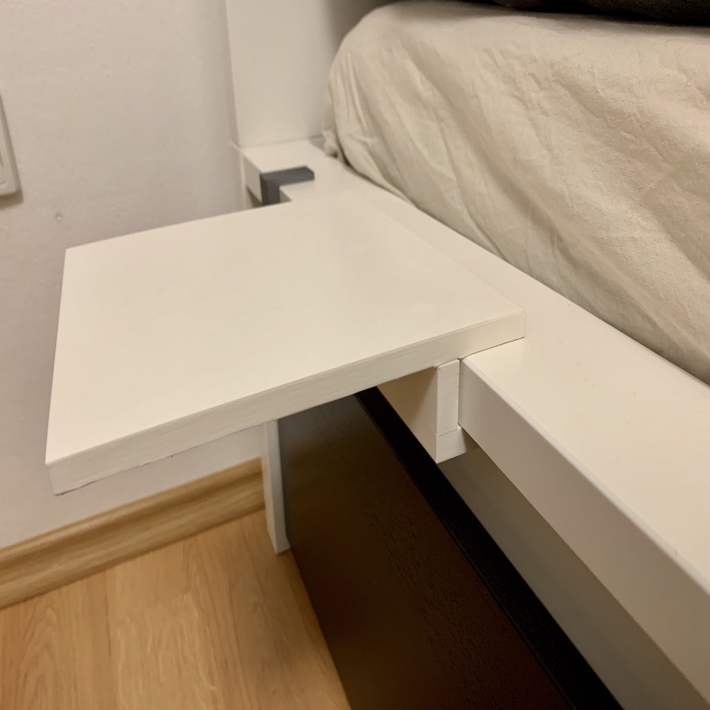 Dies ist ein kleiner Tisch für Ihr Telefon oder was auch immer Sie vom Bett aus erreichen möchten. Es passt zum IKEA MALM-Bett und es sind keine Schrauben oder Kleber für die Möbel erforderlich. Es sollte perfekt passen (es sind jedoch einige Löcher für Schrauben vorbereitet, wenn Sie möchten).