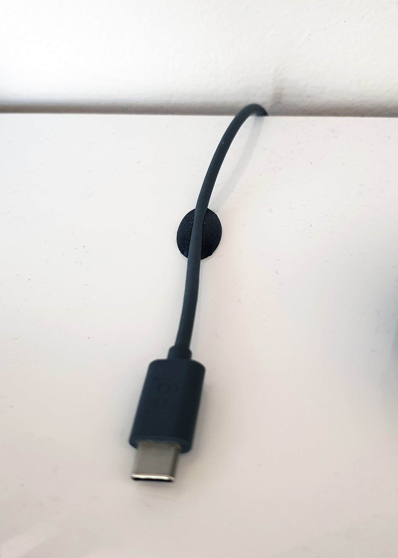 Einfacher Kabelhalter für den Schreibtisch. Befestigen Sie die Halterung mit dünnem doppelseitigem Klebeband am Schreibtisch.