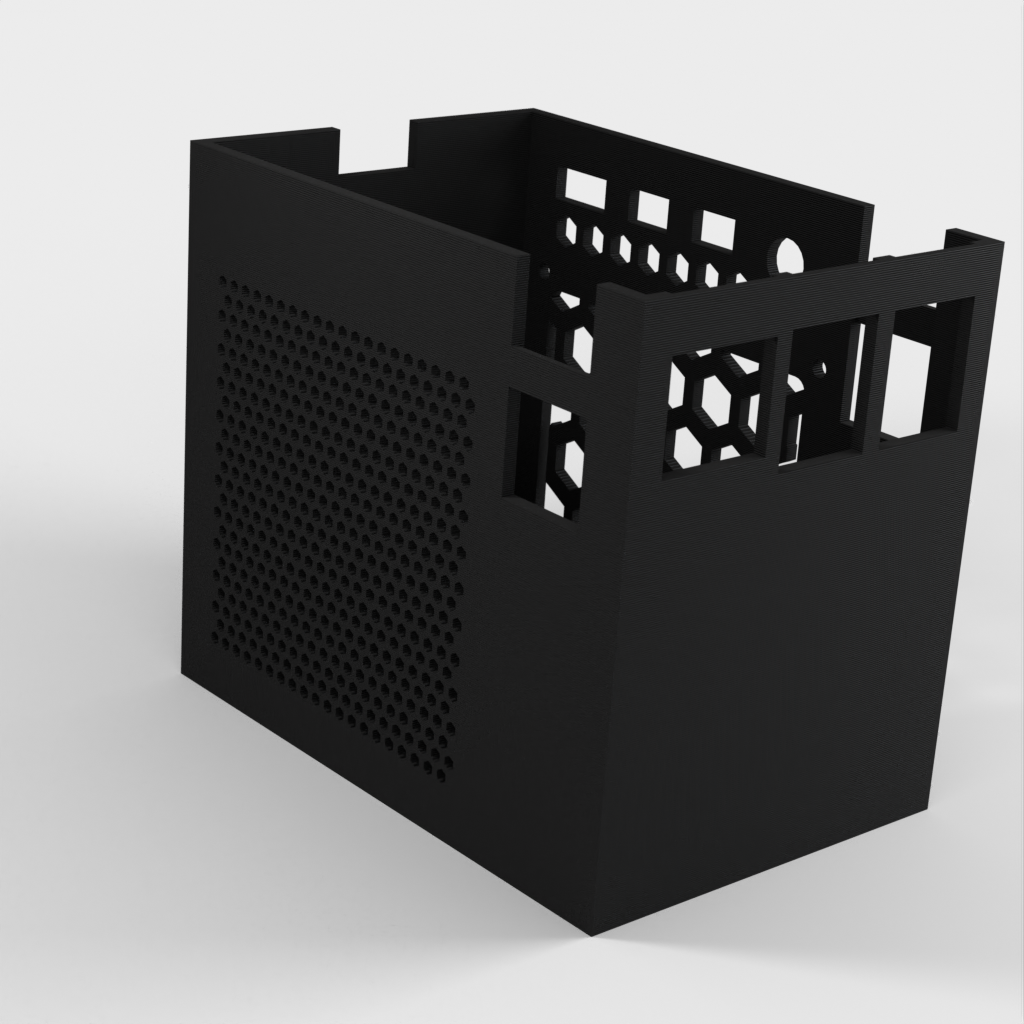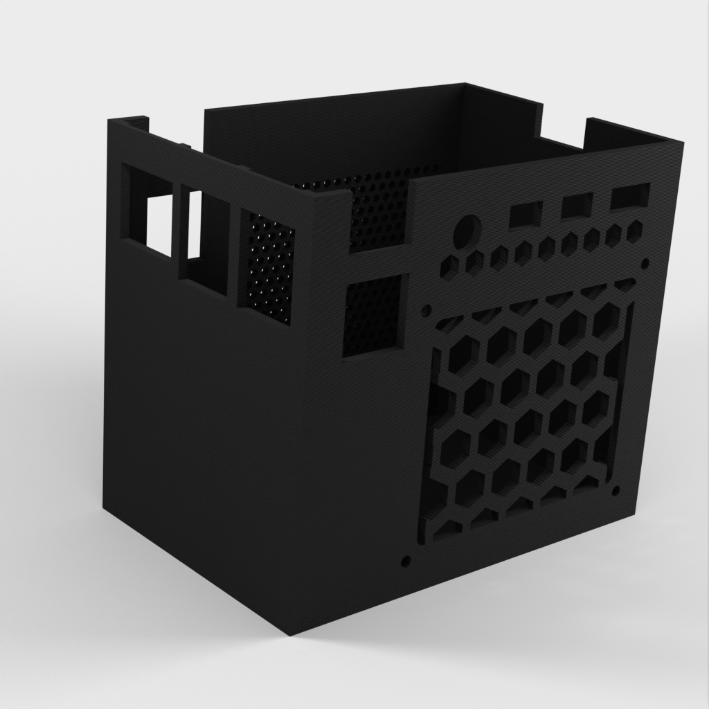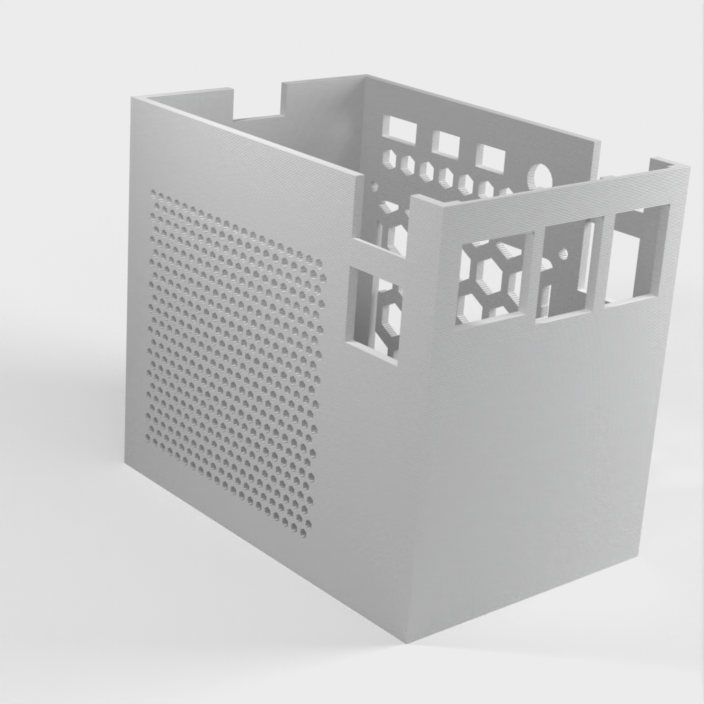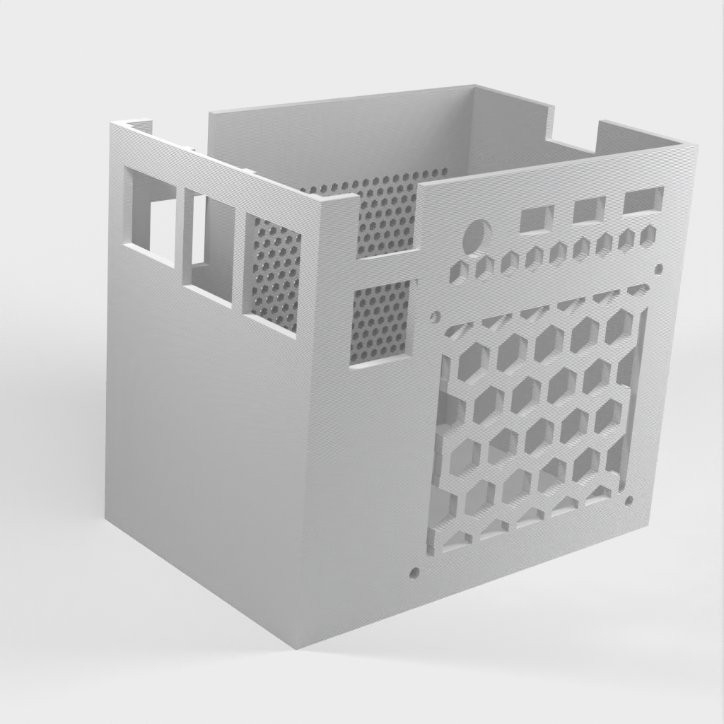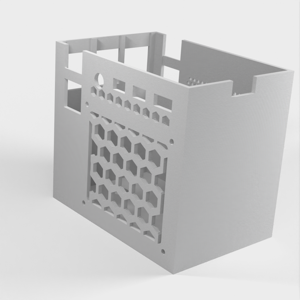 Dies ist ein minimalistisches Gehäuse für den Raspberry Pi 4, in das ein Ice Tower-Kühler passt. Das obere Design der Box hat auf der Rückseite größere Sechsecke, die das Bedrucken erleichtern. Nach dem Drucken können diese Sechsecke entfernt werden, um dem Gehäuse ein schöneres Aussehen zu verleihen, indem die Acrylplatte, die mit dem Ice Tower-Kühler geliefert wird, an der Seite des Gehäuses montiert wird. Die Clips und der Boden der Box wurden angepasst, um besser zu passen und mehr Durchmesser von Gummifüßen zu unterstützen.