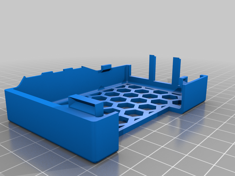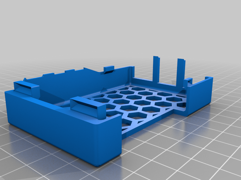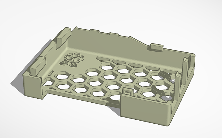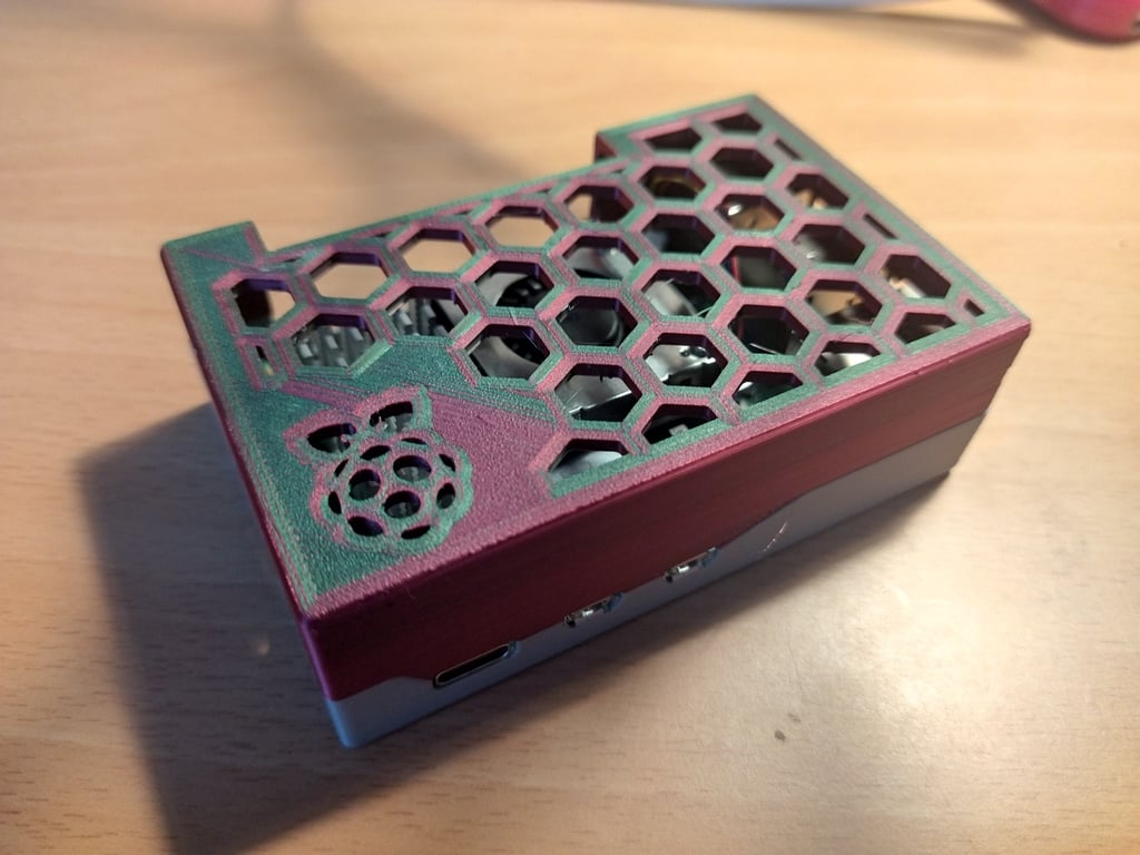 Ein Raspberry Pi 5-Gehäuse mit freiliegenden GPIO-Pins und sechseckigen Löchern für bessere Kühleigenschaften. Wenn Sie einen Kühlkörper und einen offiziellen Lüfter ähnlich dem auf dem Bild haben, sind Sie mit „Pins-Top-Hexed-With-Logo-HeatSink-Cutoff.stl“ besser dran.