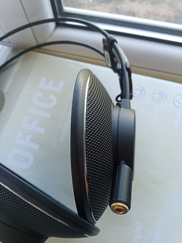 Der Bügel ist passgenau; die Bohrung für die Kabelführung ist elliptisch (2,3 x 3,3 mm), die Bohrung für den Klinkenstecker hat einen Durchmesser von 8,2 mm. Um eine optimale Passform zu gewährleisten, können geringfügige Anpassungen am Original-Kopfhörergehäuse erforderlich sein.