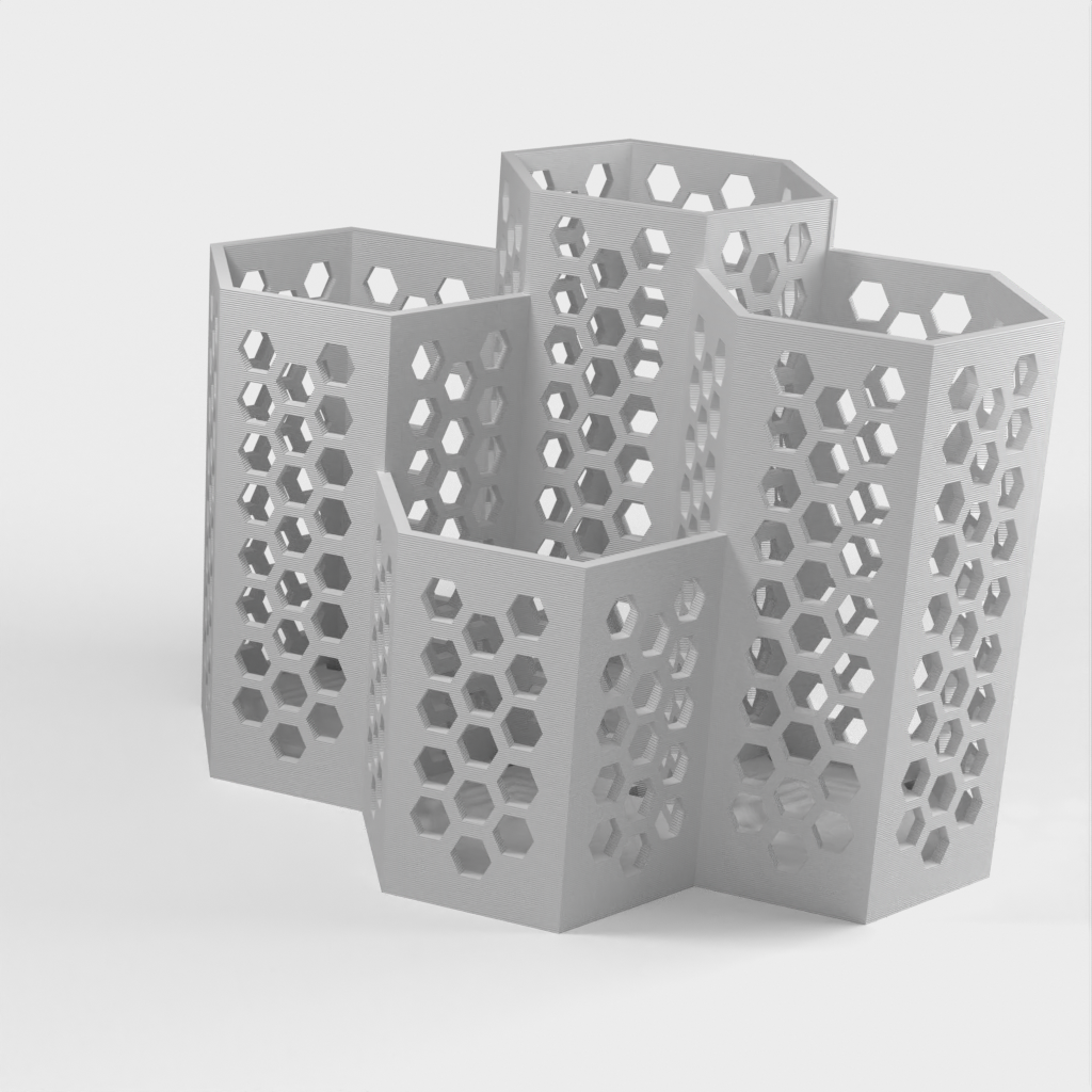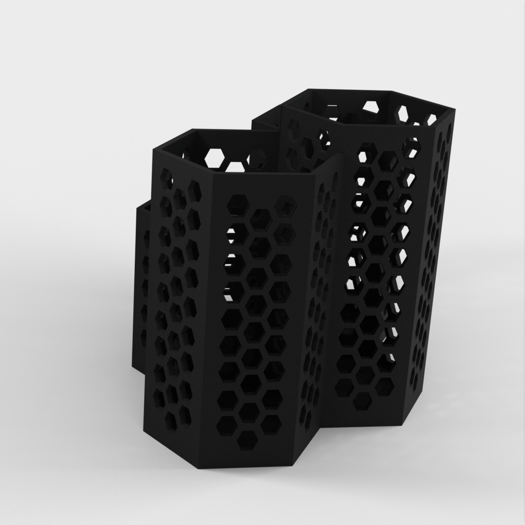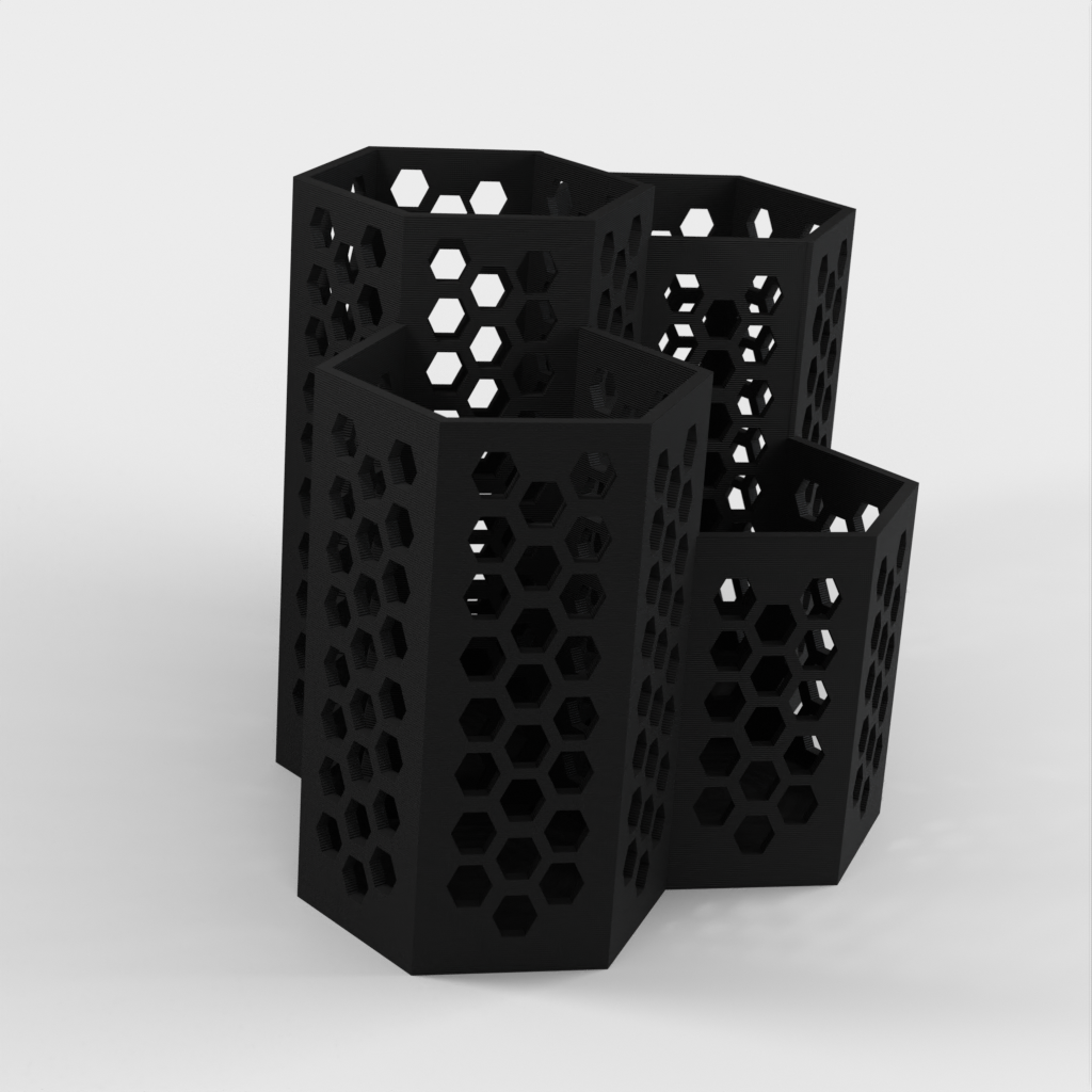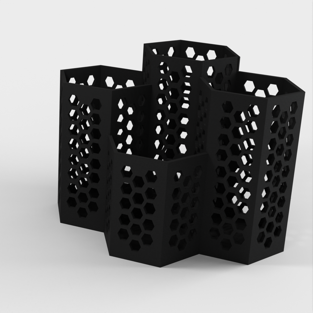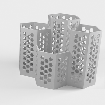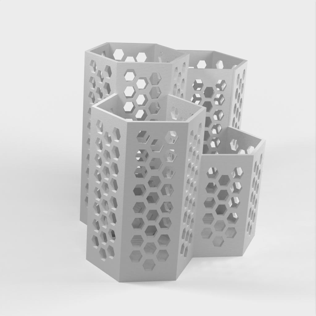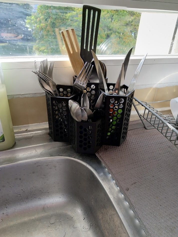 Ein praktischer Besteckabtropfer, aufgeteilt in vier Boxen: eine für kleine Löffel, eine für Gabeln, eine für Messer und eine größere Box für größere Löffel und andere Küchenutensilien. Kleine Löcher im Boden erleichtern das Abfließen des Wassers.