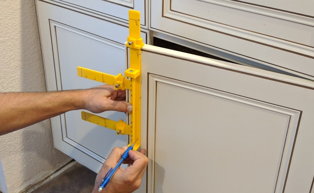 Schablone zum einfachen und genauen Platzieren von Löchern für Schrankgriffe. Die Schablone ist verstellbar und kann für Griffabstände von 3", 3,5", 3,75", 4", 4,5", 5", 5,5", 6", 6,5", 7", 7,5" bzw. 16 cm verwendet werden. Mit Schiebefunktion für präzise Einstellung. Kann sowohl für 8-32- als auch für 1/4-Zoll-Maschinenschrauben verwendet werden.