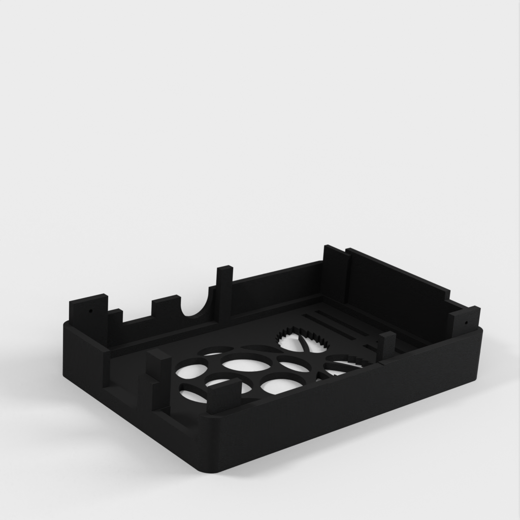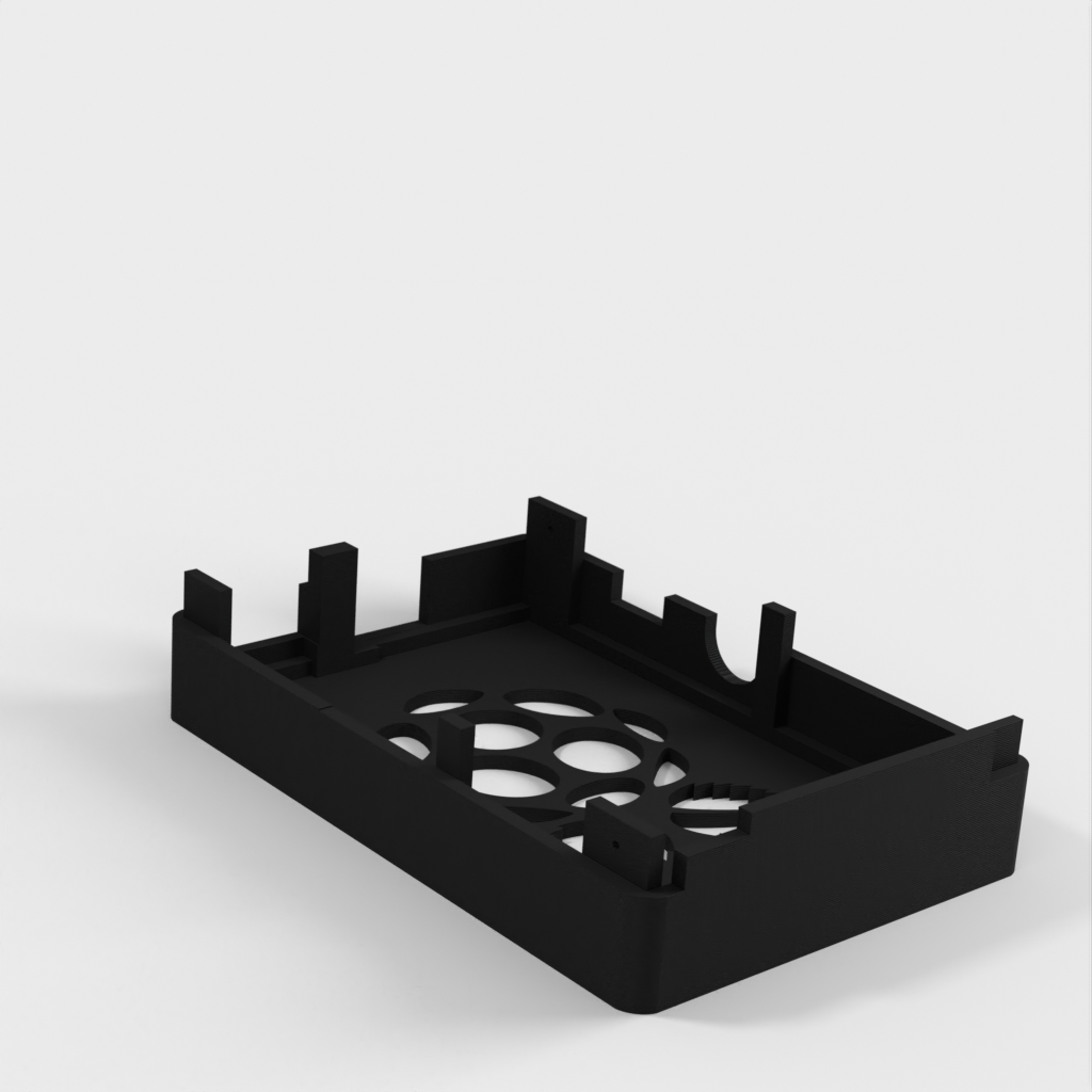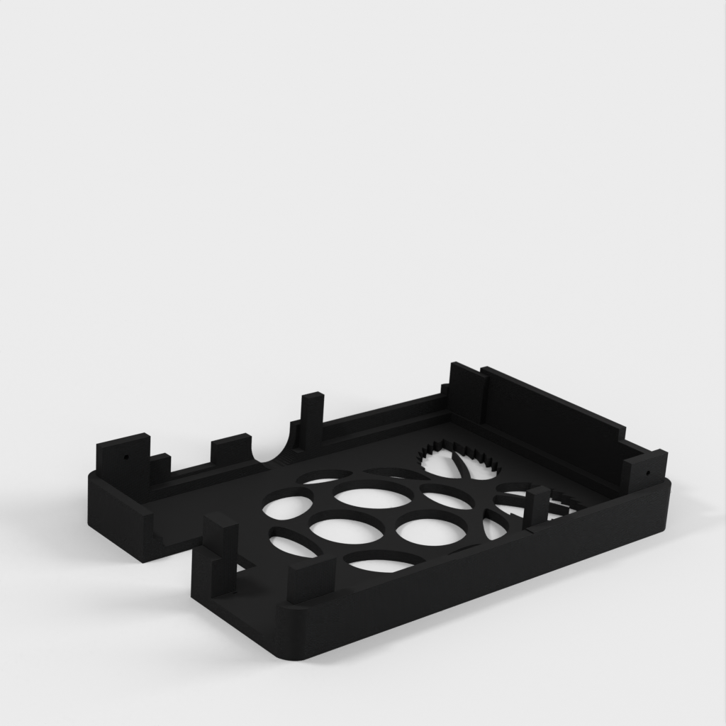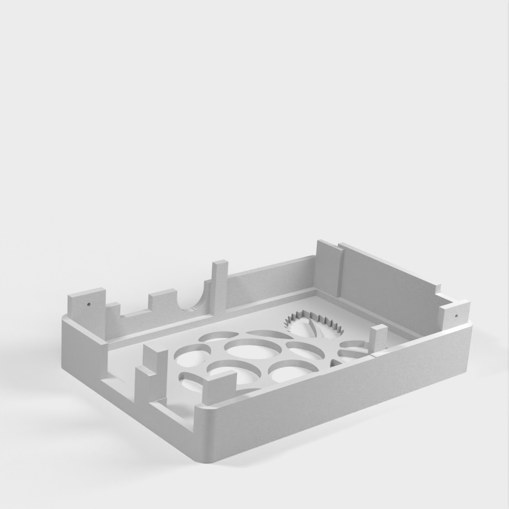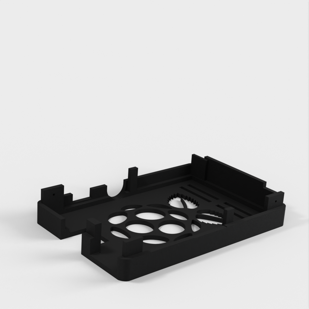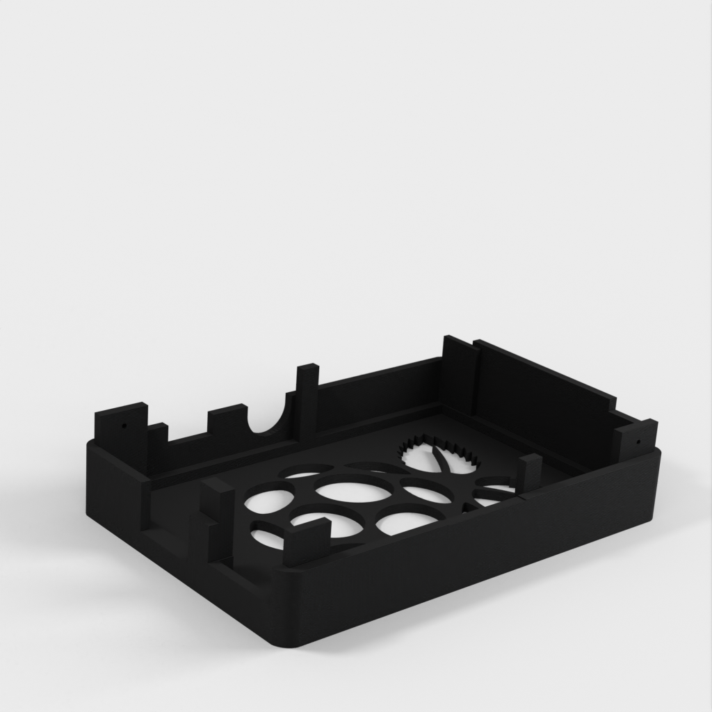 Dies ist ein Fall für den Raspberry Pi, einen Computer im Kreditkartenformat. Das Gehäuse ist mit mehreren Ebenen konzipiert und bietet Platz für Komponenten und GPIO-Anschlüsse. Indem wir bei den Löchern für die Komponenten einen kleinen Spielraum lassen, stellen wir sicher, dass diese immer passen. Es gibt auch die Option eines offenen Logos und eines Leiterplattenhalters.