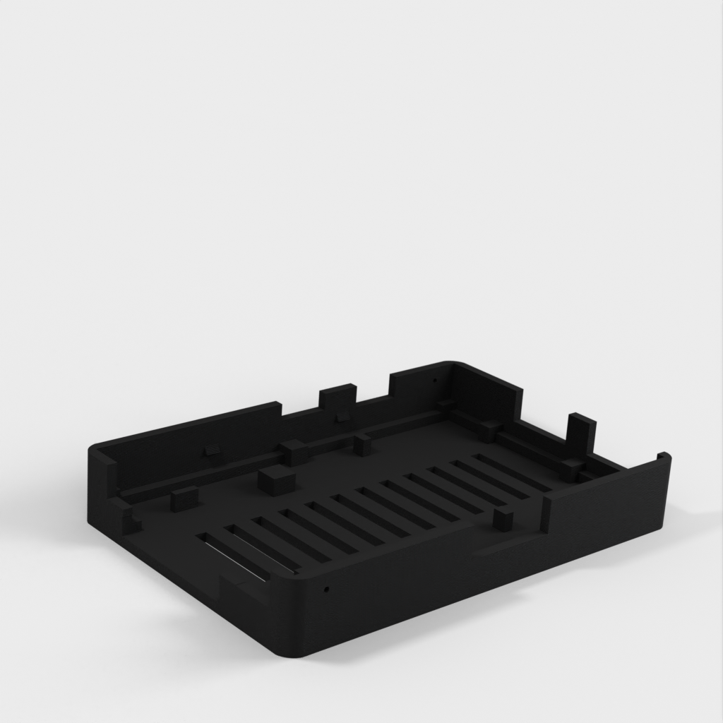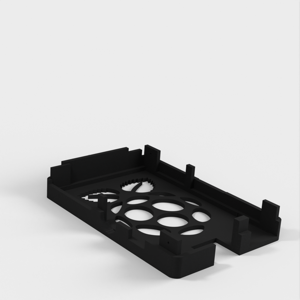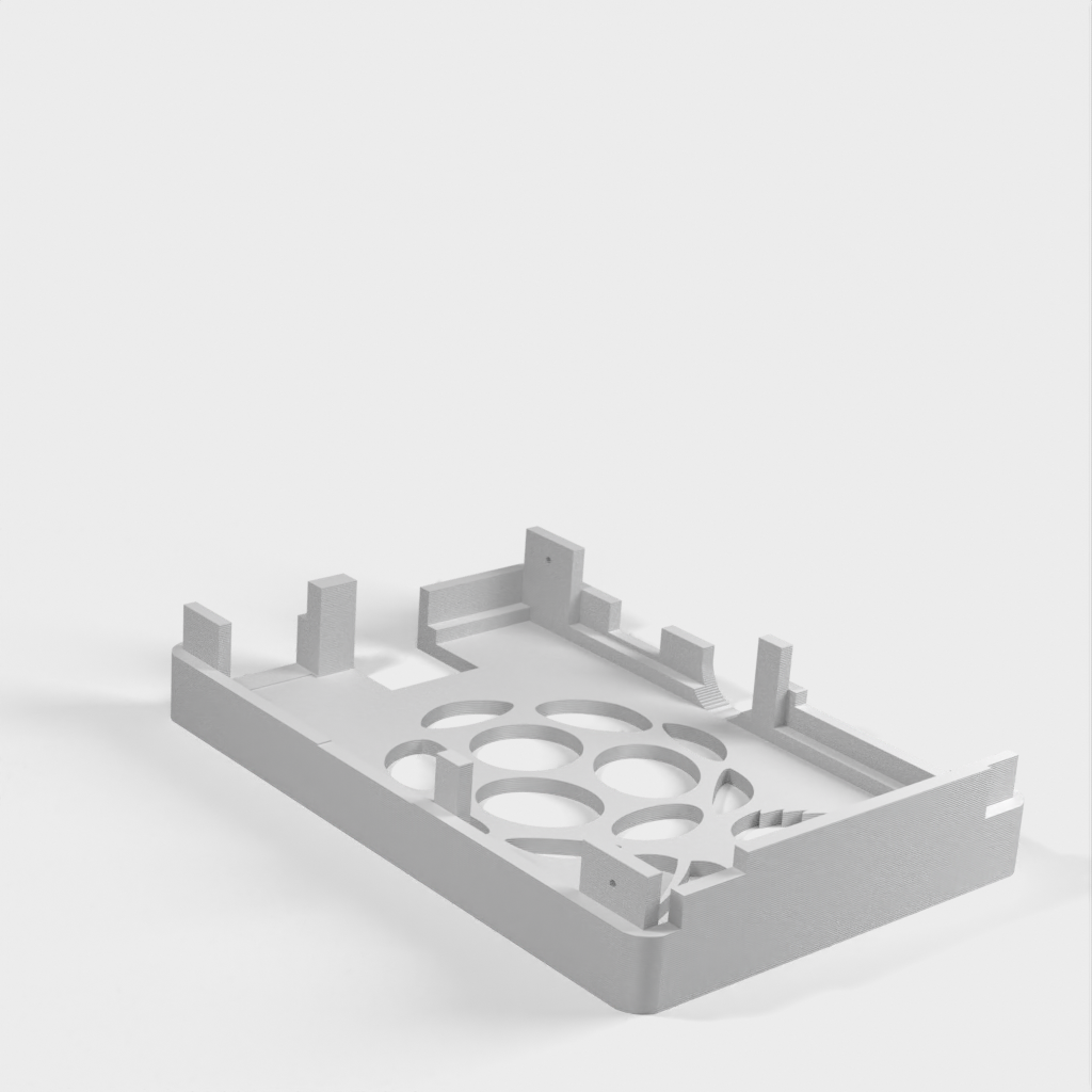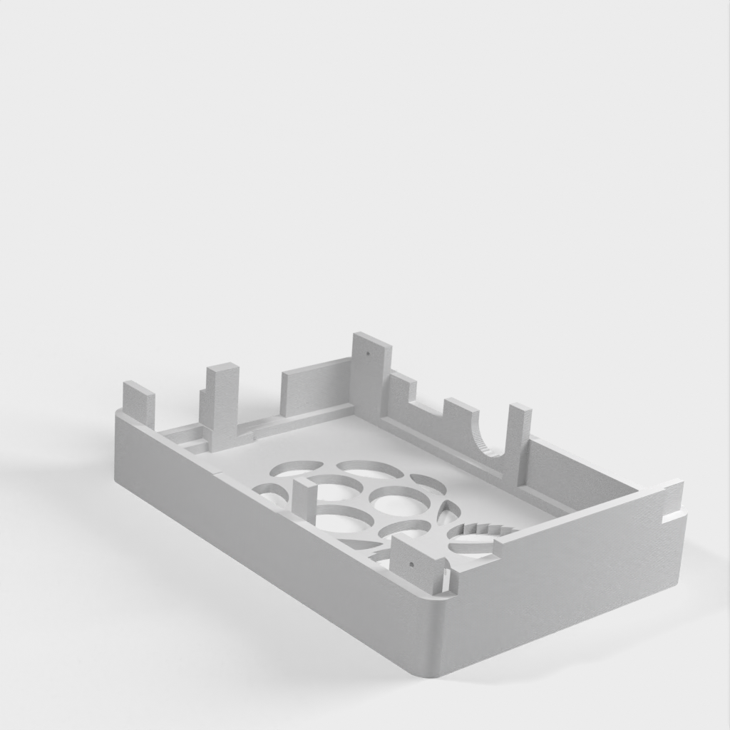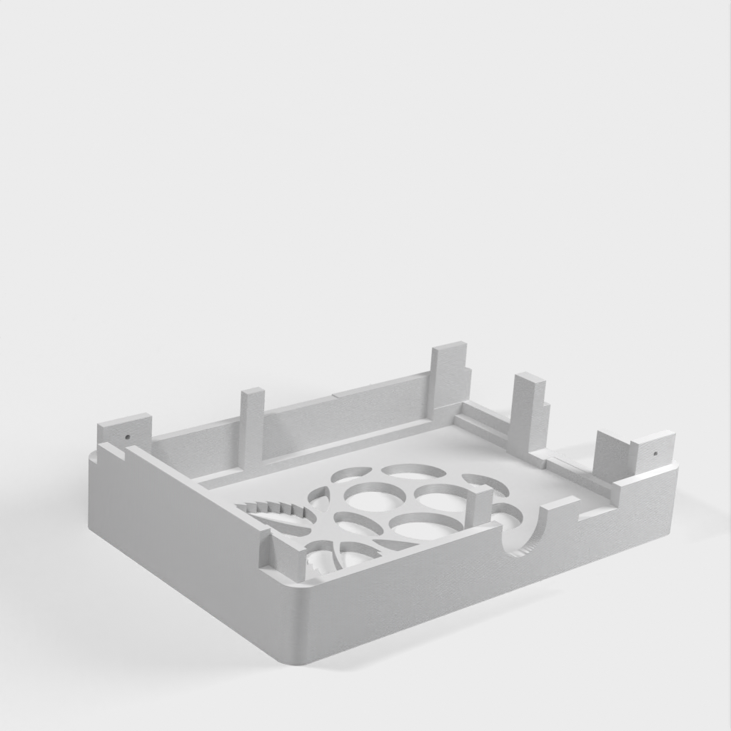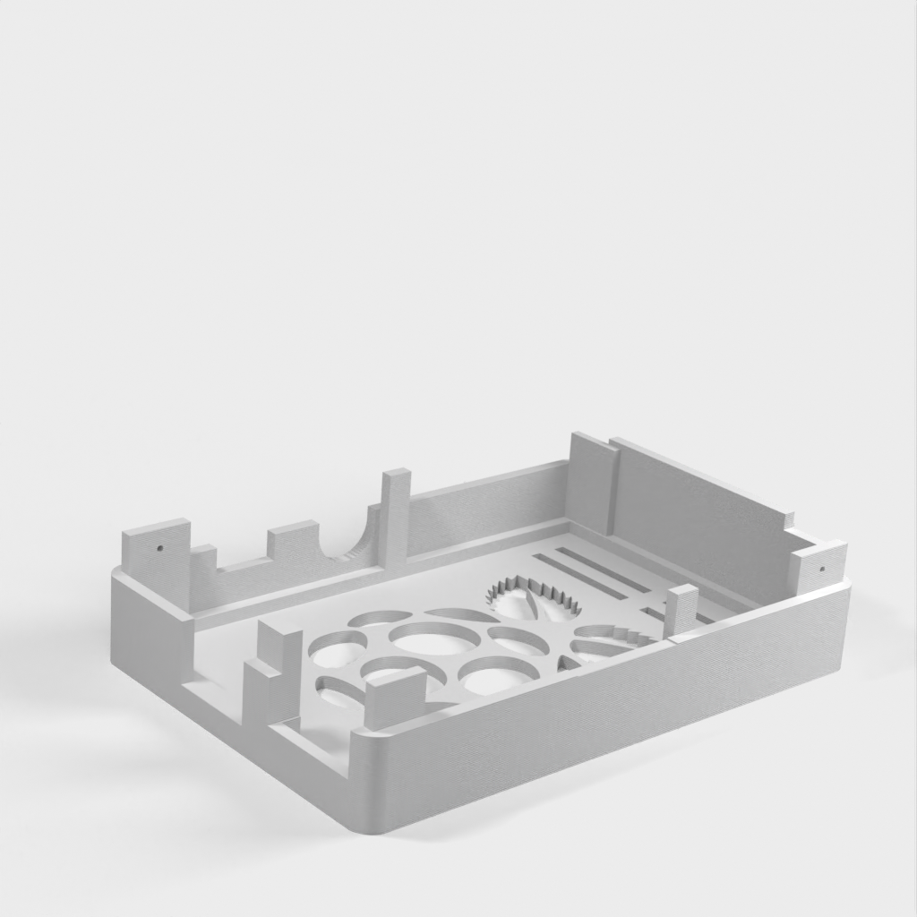 Dies ist ein Fall für den Raspberry Pi, einen Computer im Kreditkartenformat. Das Gehäuse ist mit mehreren Ebenen konzipiert und bietet Platz für Komponenten und GPIO-Anschlüsse. Indem wir bei den Löchern für die Komponenten einen kleinen Spielraum lassen, stellen wir sicher, dass diese immer passen. Es gibt auch die Option eines offenen Logos und eines Leiterplattenhalters.