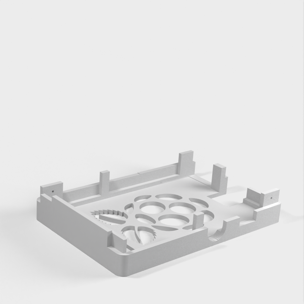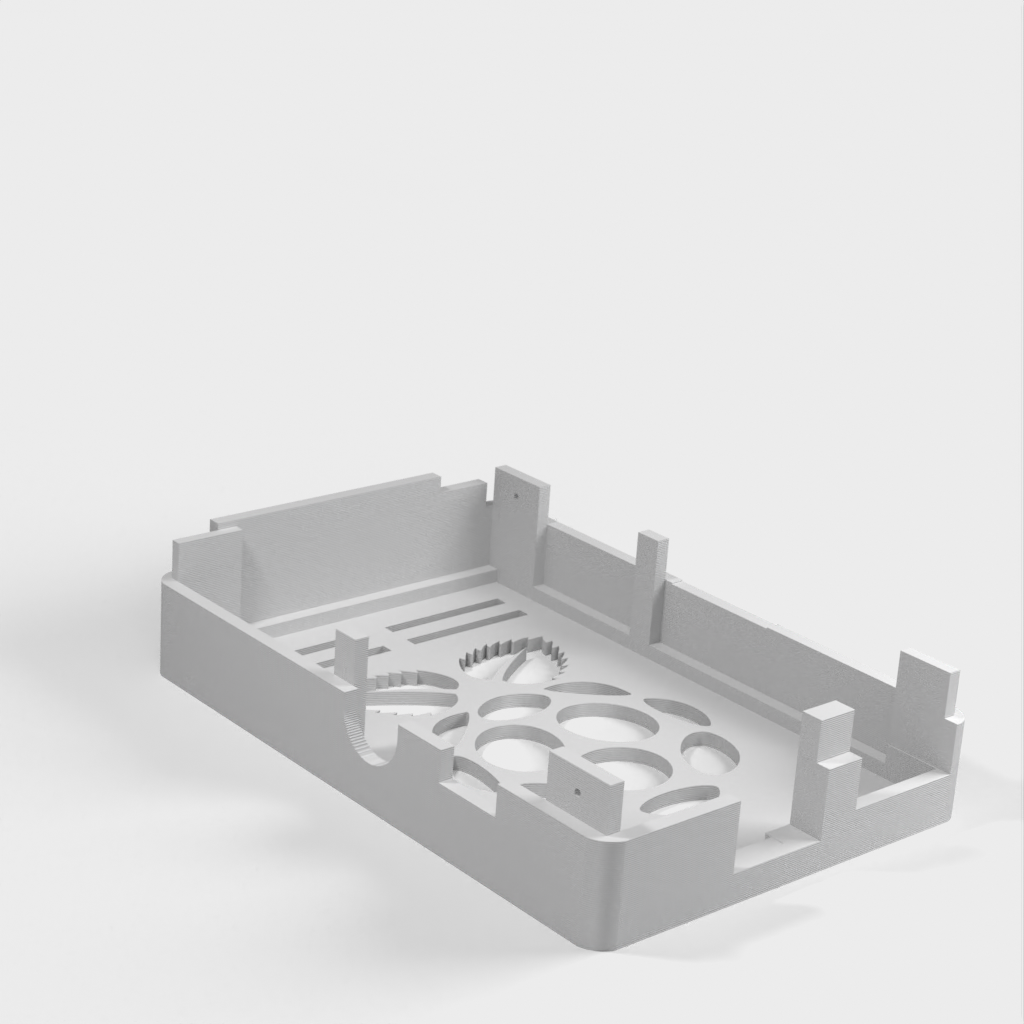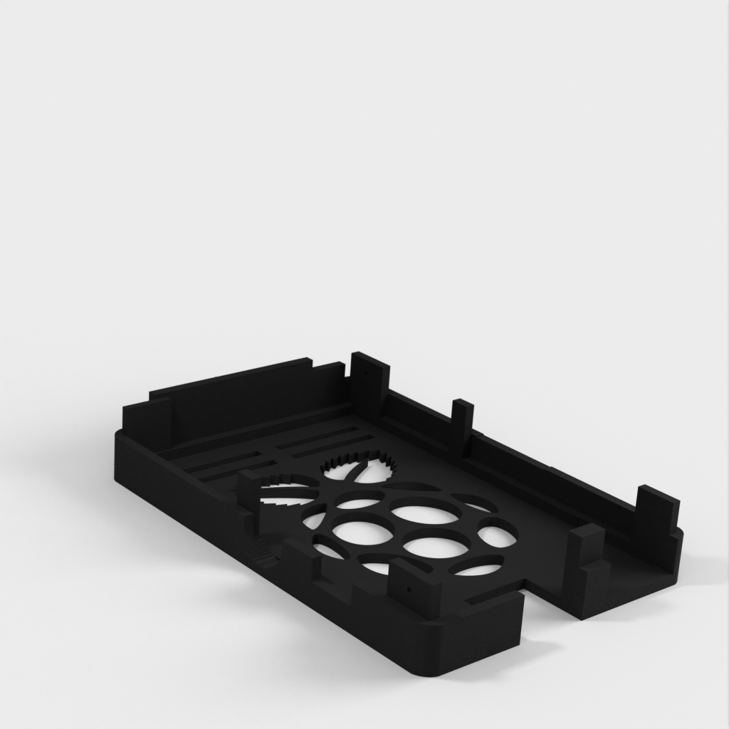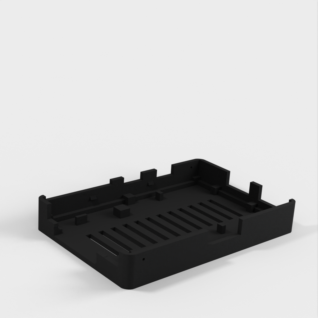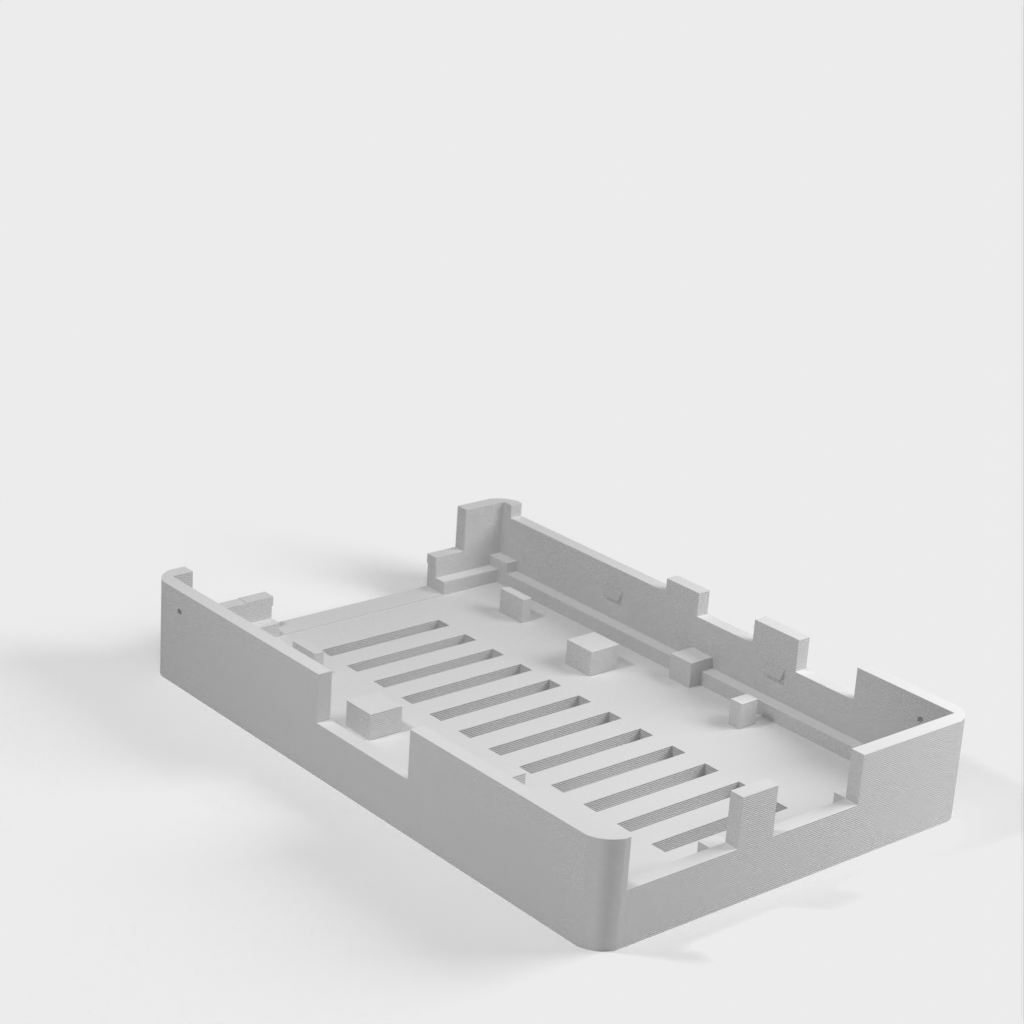 Dies ist ein Fall für den Raspberry Pi, einen Computer im Kreditkartenformat. Das Gehäuse ist mit mehreren Ebenen konzipiert und bietet Platz für Komponenten und GPIO-Anschlüsse. Indem wir bei den Löchern für die Komponenten einen kleinen Spielraum lassen, stellen wir sicher, dass diese immer passen. Es gibt auch die Option eines offenen Logos und eines Leiterplattenhalters.