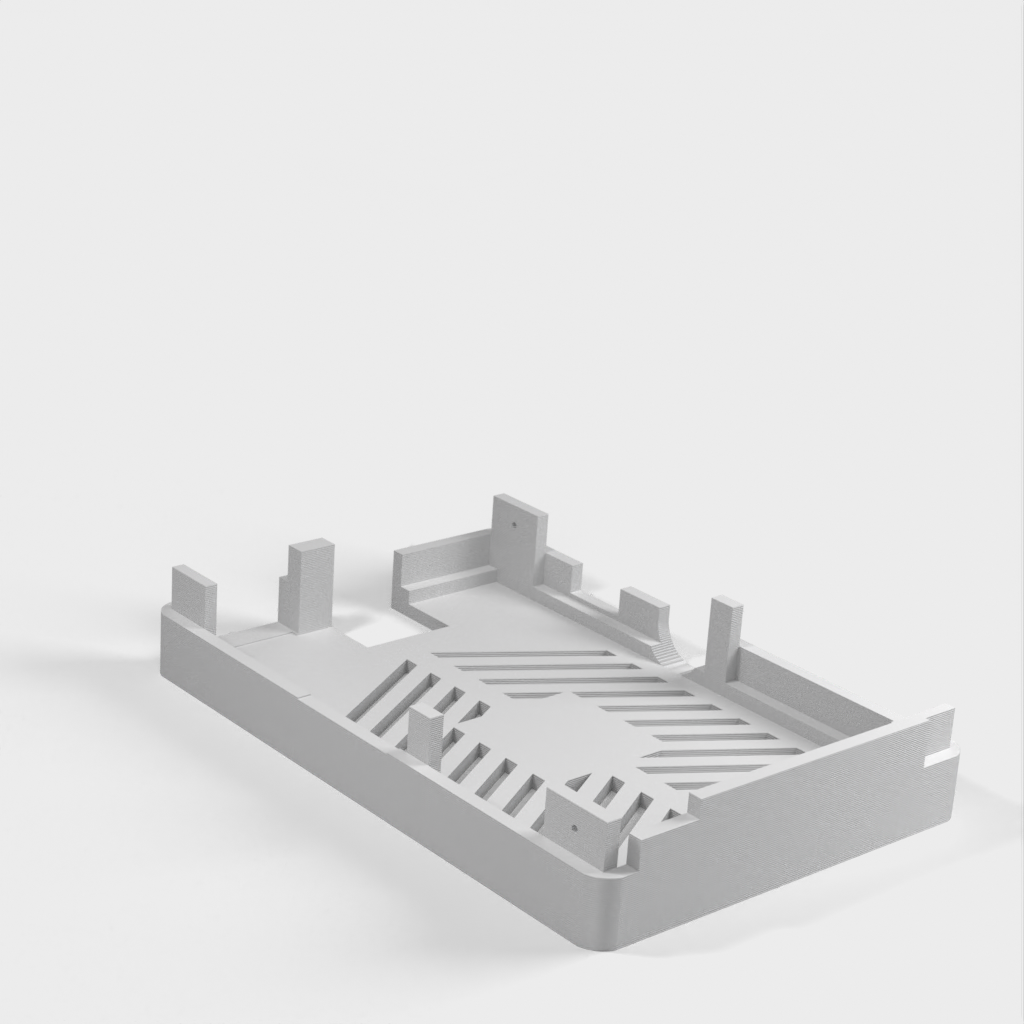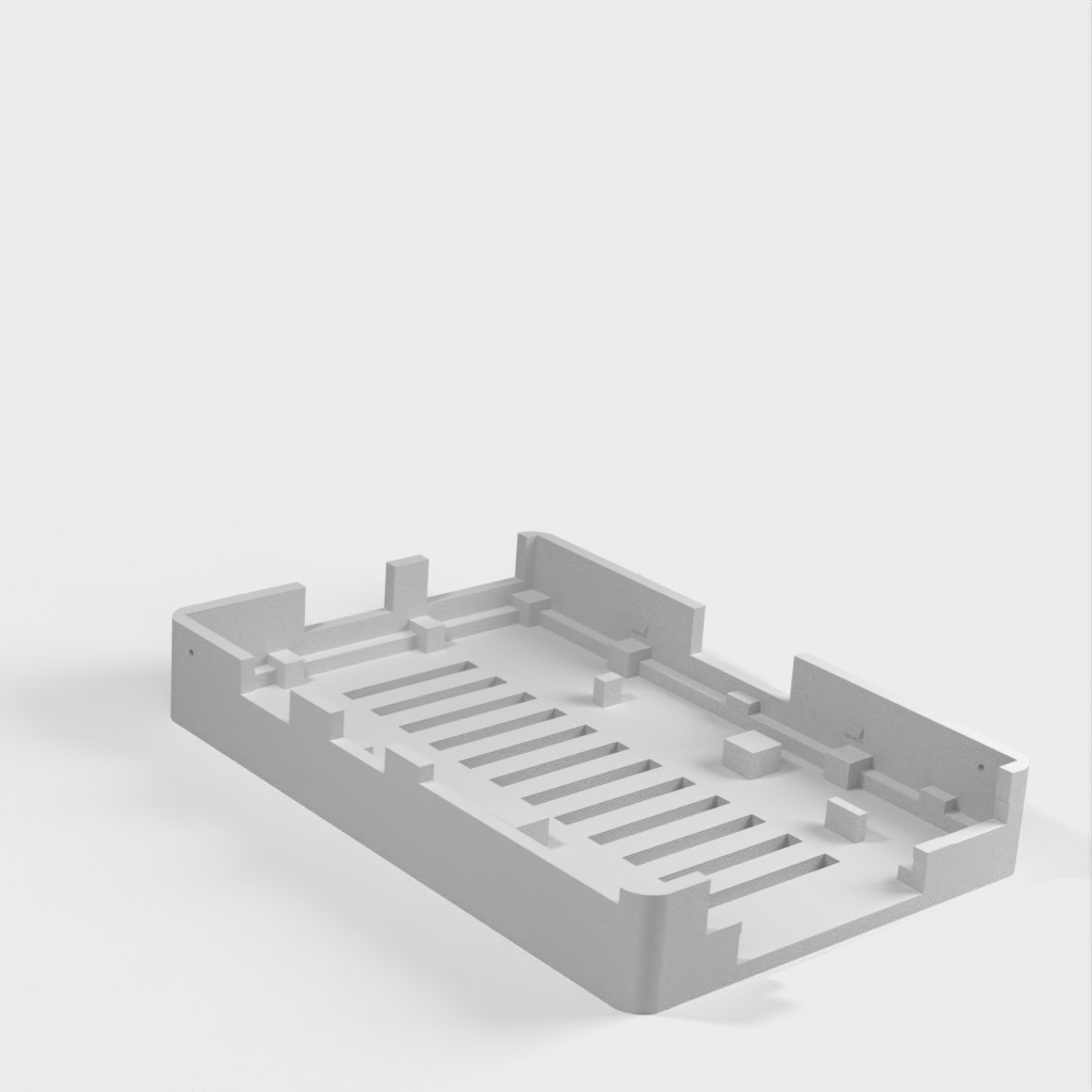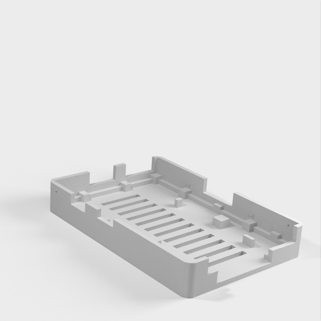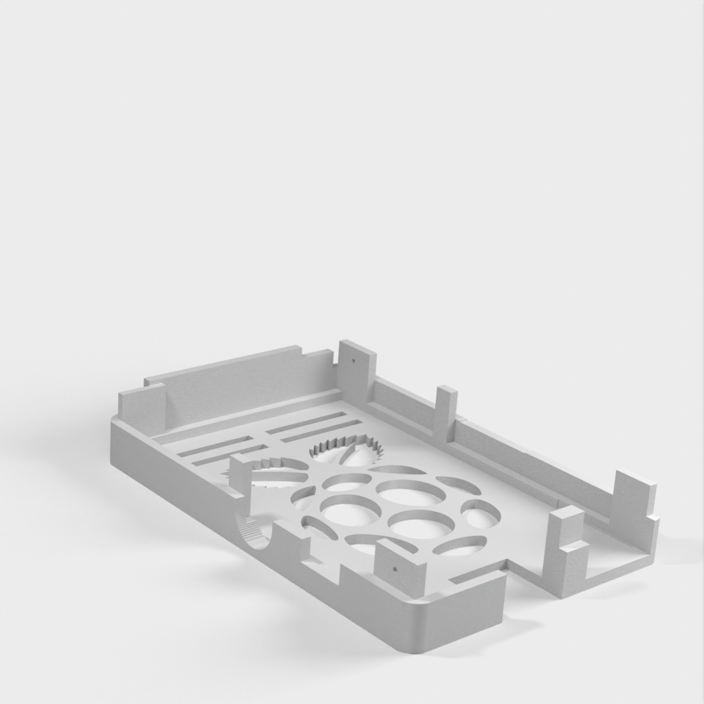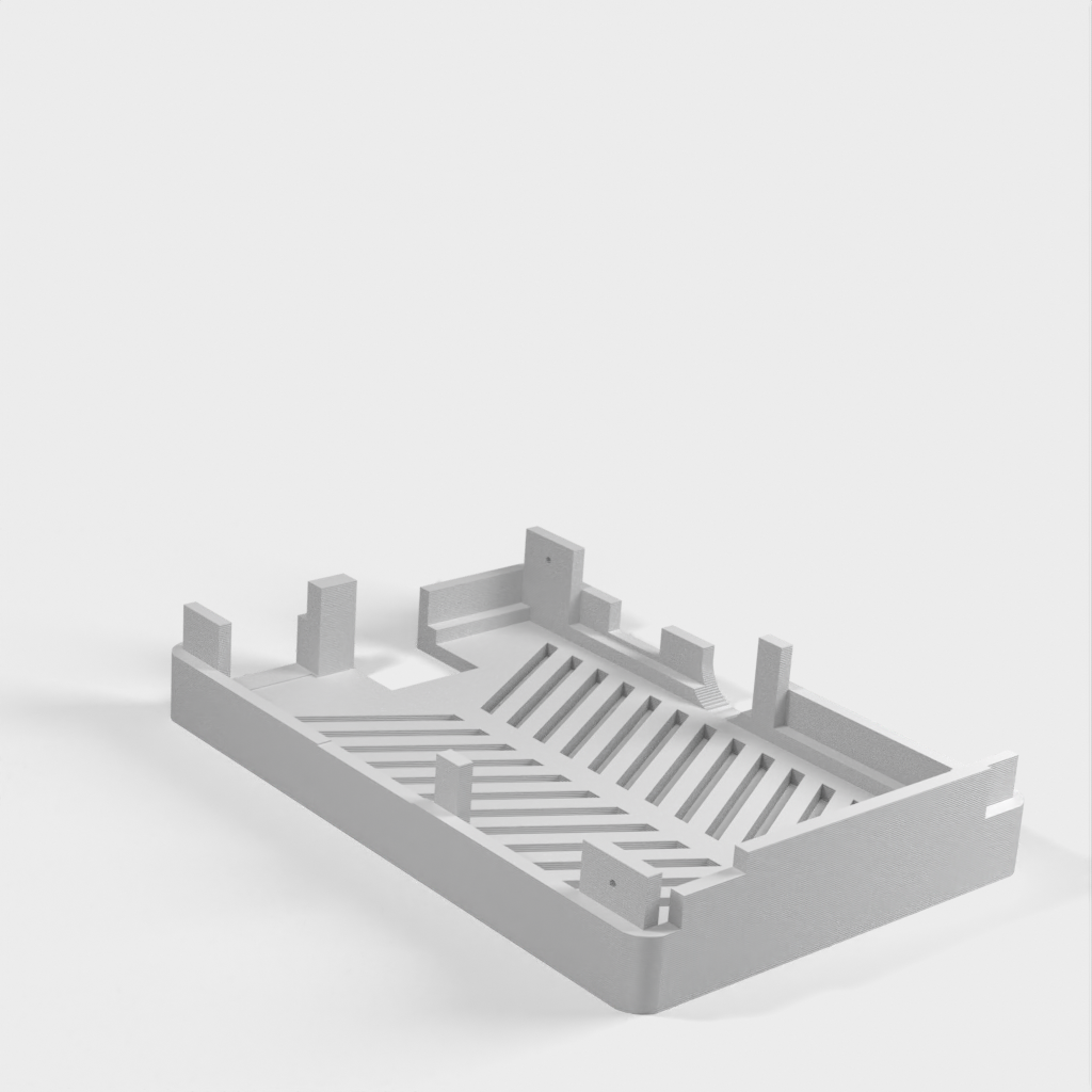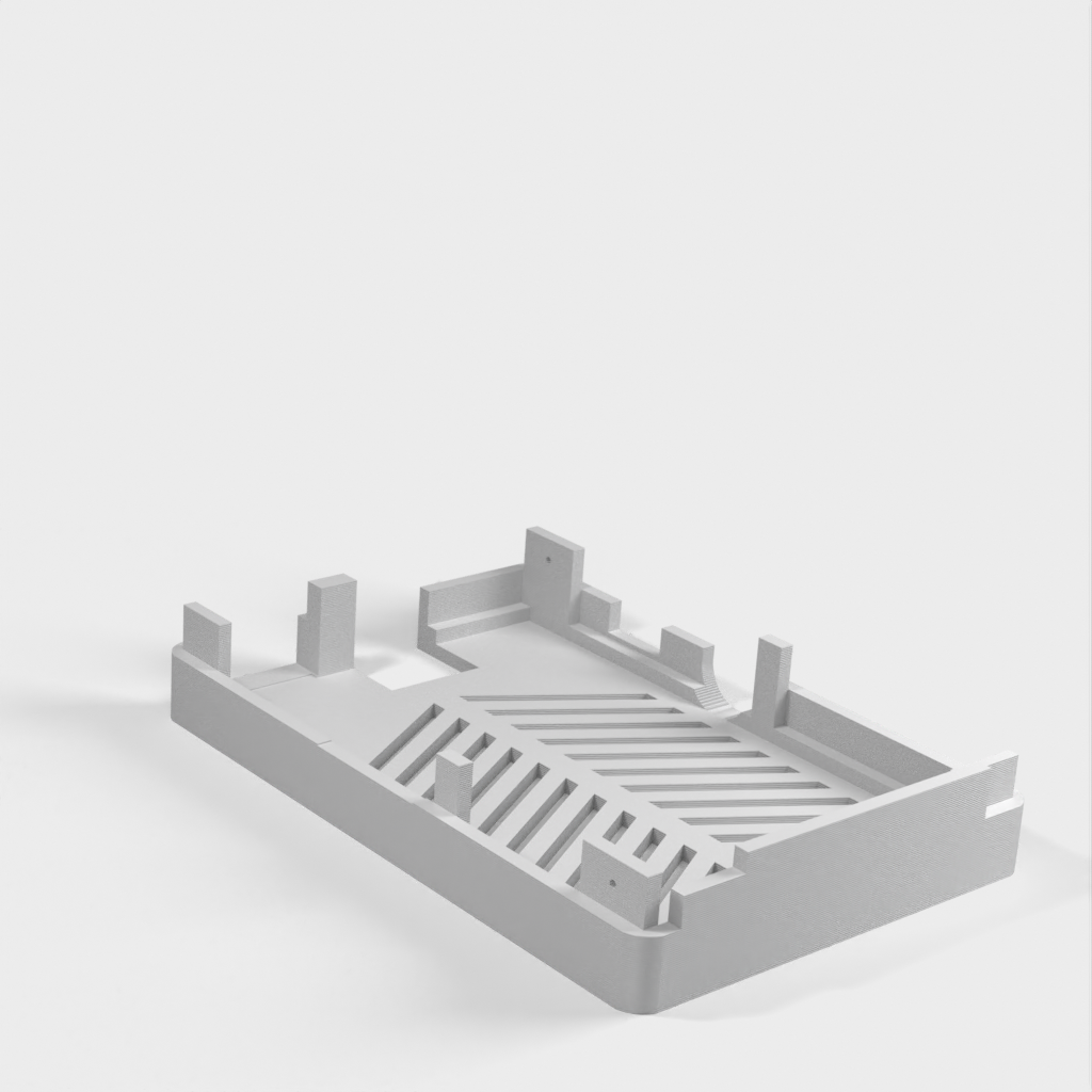 Dies ist ein Fall für den Raspberry Pi, einen Computer im Kreditkartenformat. Das Gehäuse ist mit mehreren Ebenen konzipiert und bietet Platz für Komponenten und GPIO-Anschlüsse. Indem wir bei den Löchern für die Komponenten einen kleinen Spielraum lassen, stellen wir sicher, dass diese immer passen. Es gibt auch die Option eines offenen Logos und eines Leiterplattenhalters.