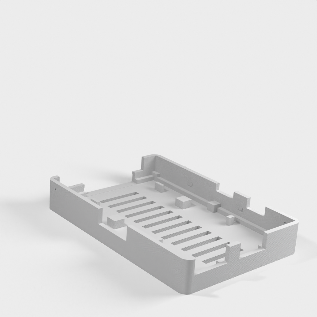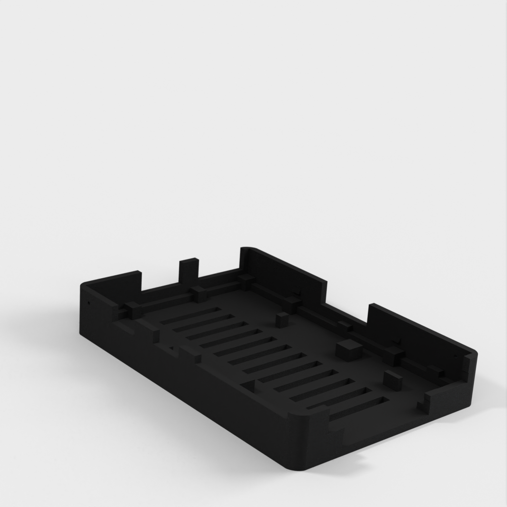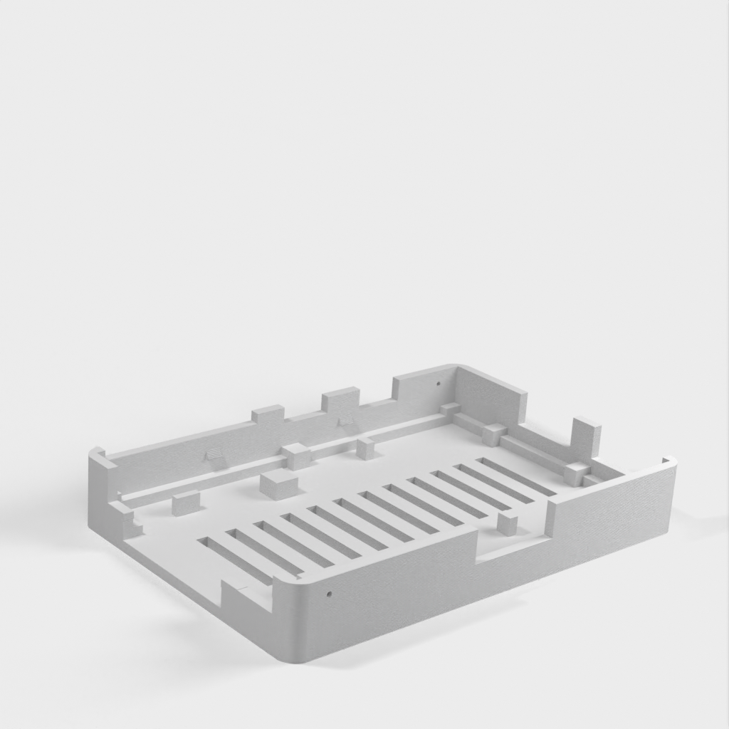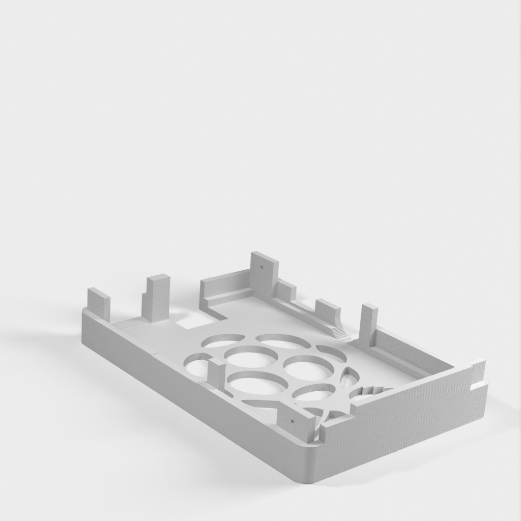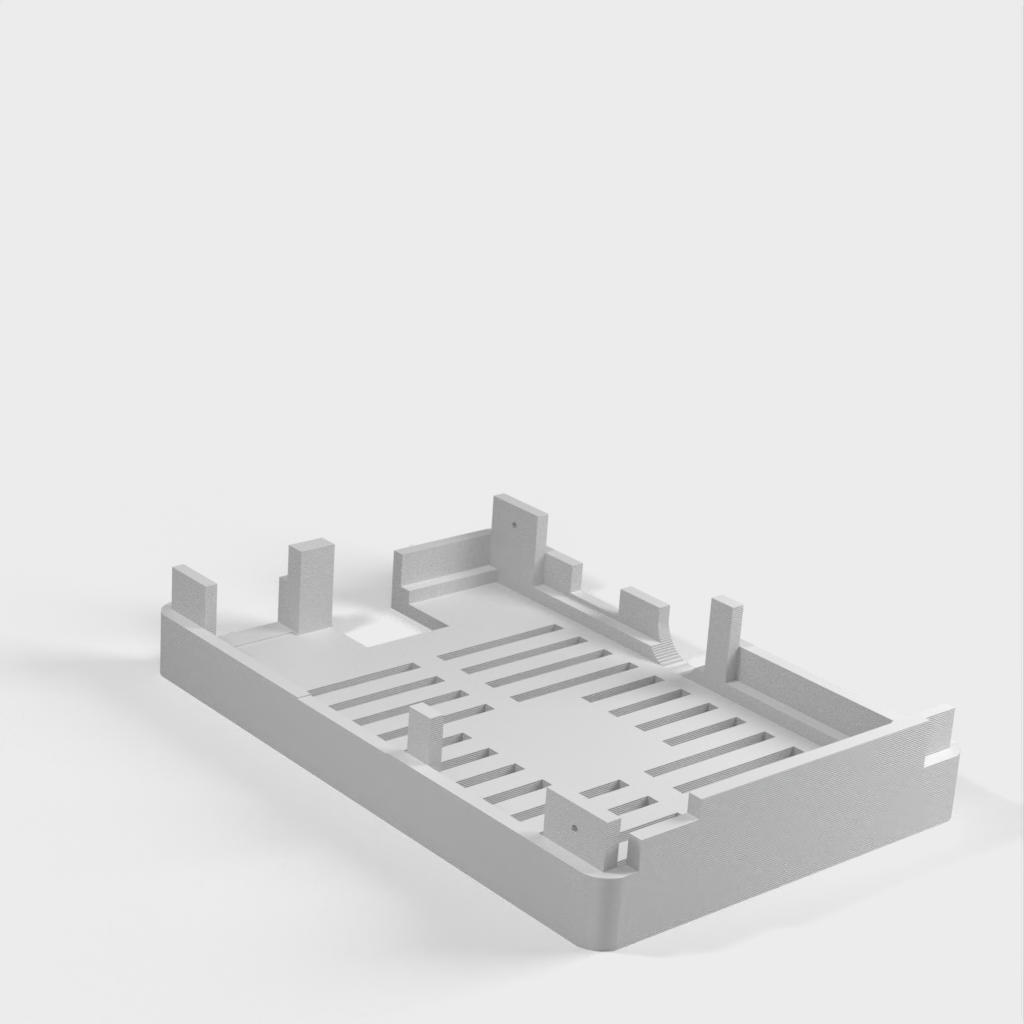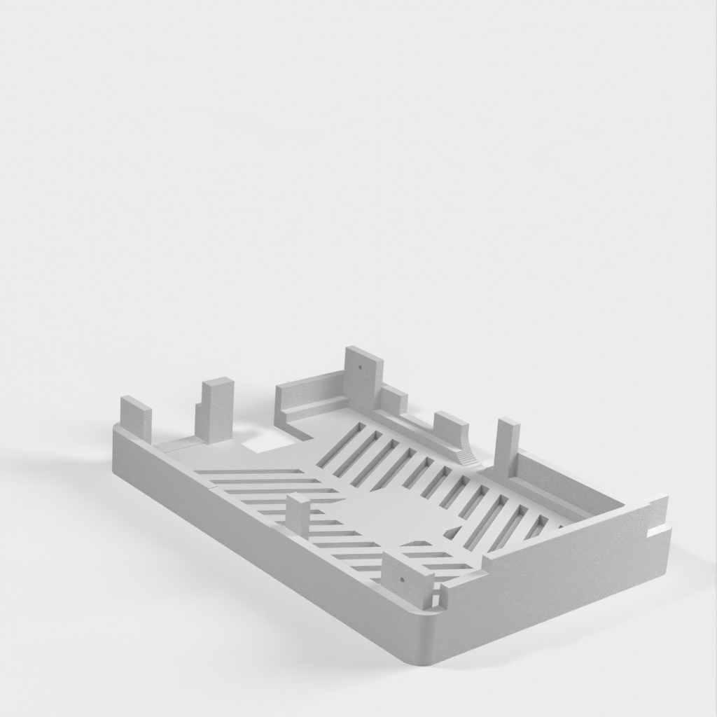 Dies ist ein Fall für den Raspberry Pi, einen Computer im Kreditkartenformat. Das Gehäuse ist mit mehreren Ebenen konzipiert und bietet Platz für Komponenten und GPIO-Anschlüsse. Indem wir bei den Löchern für die Komponenten einen kleinen Spielraum lassen, stellen wir sicher, dass diese immer passen. Es gibt auch die Option eines offenen Logos und eines Leiterplattenhalters.