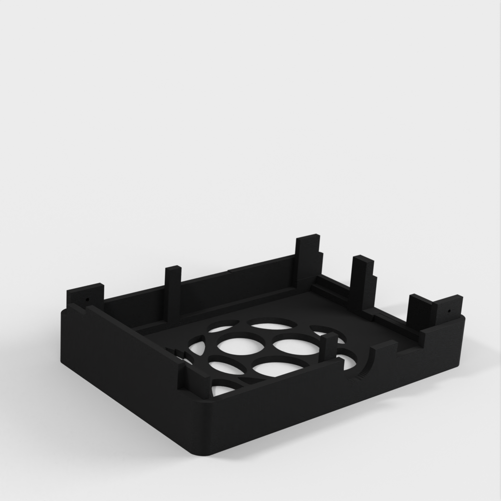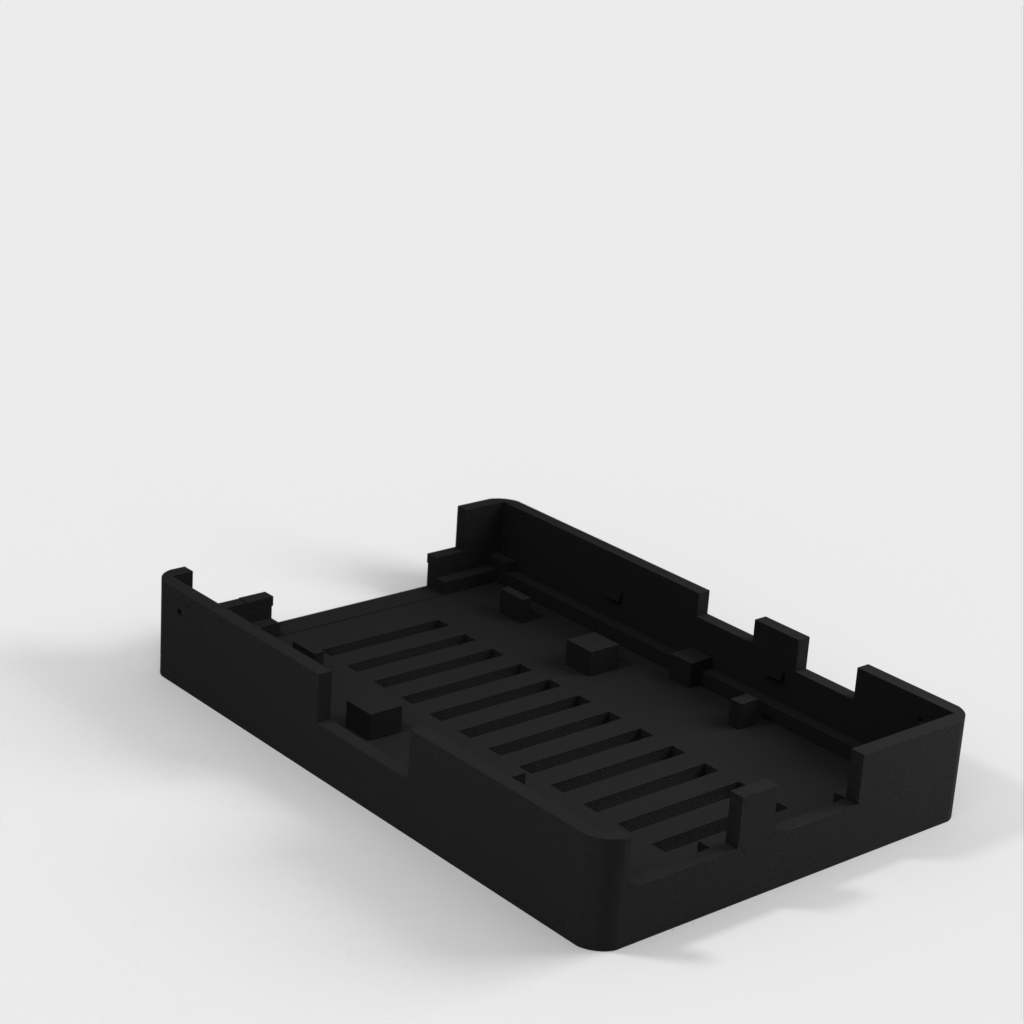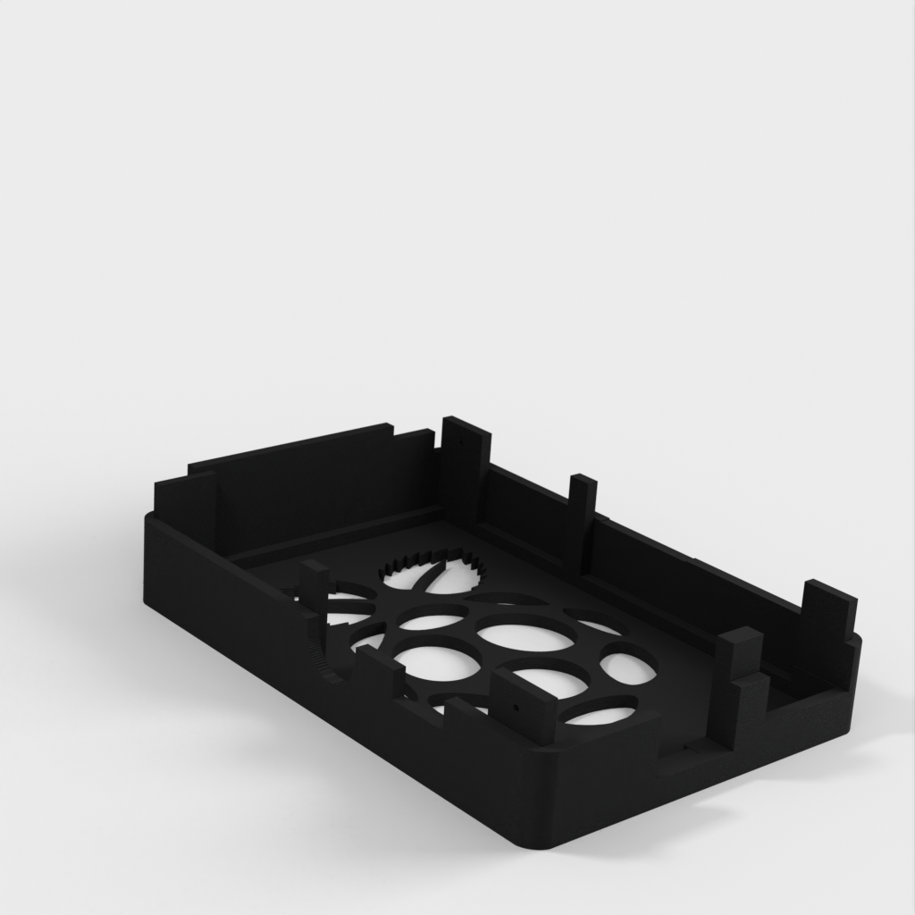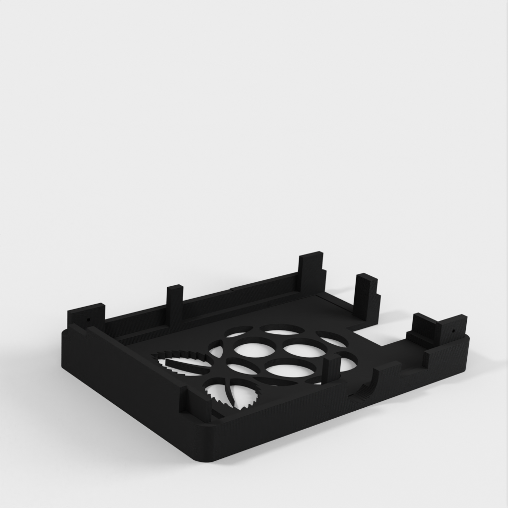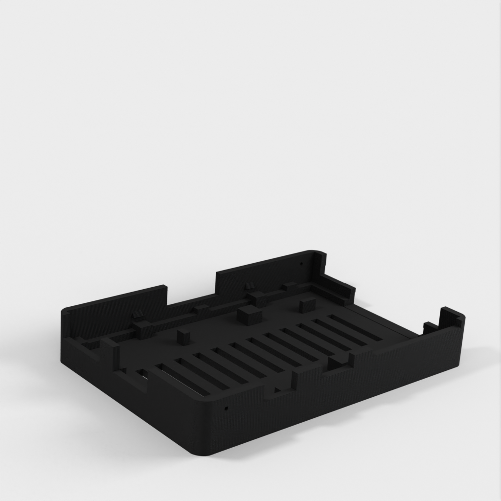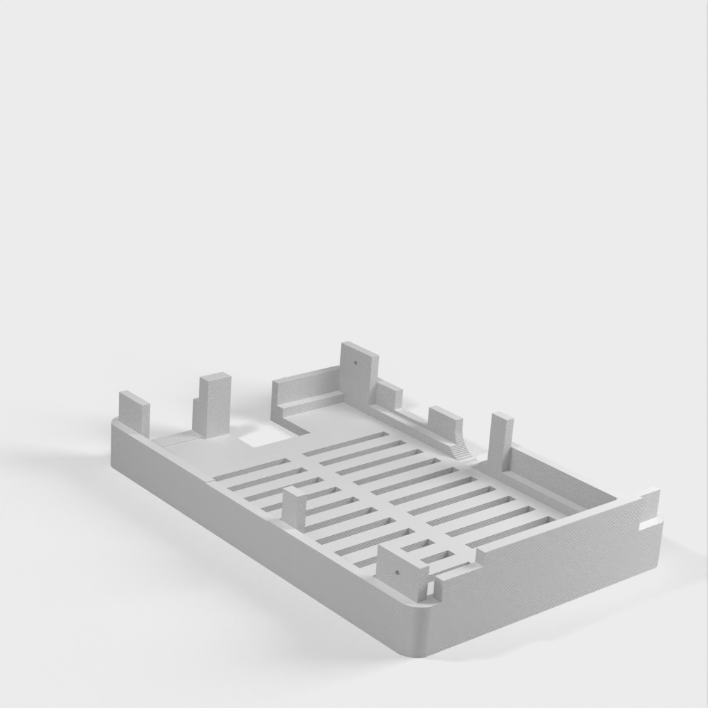 Dies ist ein Fall für den Raspberry Pi, einen Computer im Kreditkartenformat. Das Gehäuse ist mit mehreren Ebenen konzipiert und bietet Platz für Komponenten und GPIO-Anschlüsse. Indem wir bei den Löchern für die Komponenten einen kleinen Spielraum lassen, stellen wir sicher, dass diese immer passen. Es gibt auch die Option eines offenen Logos und eines Leiterplattenhalters.