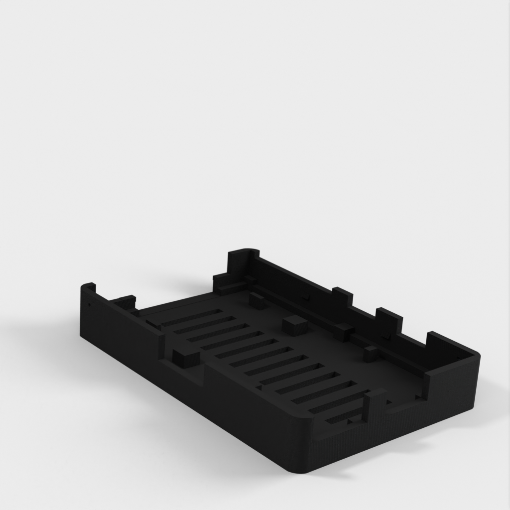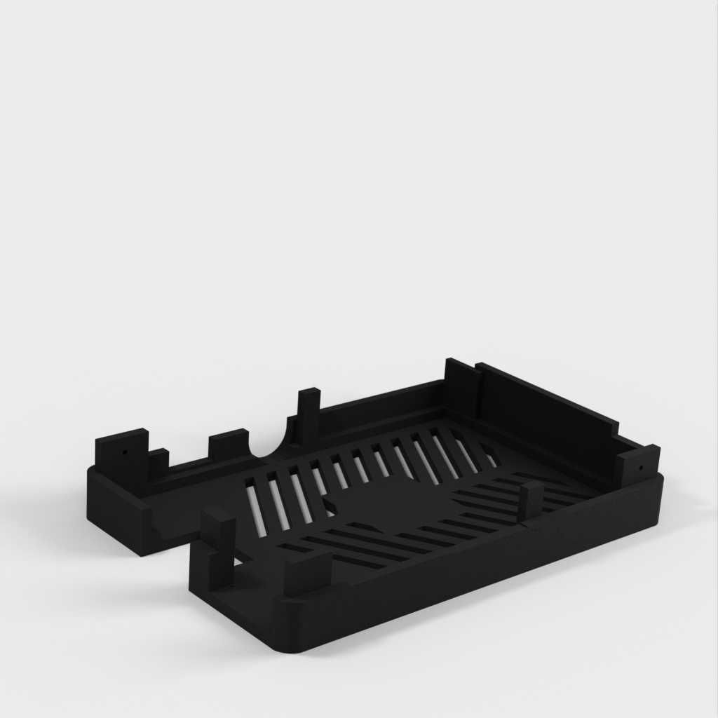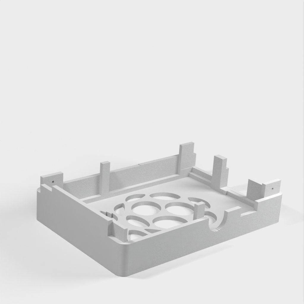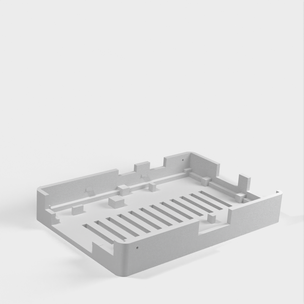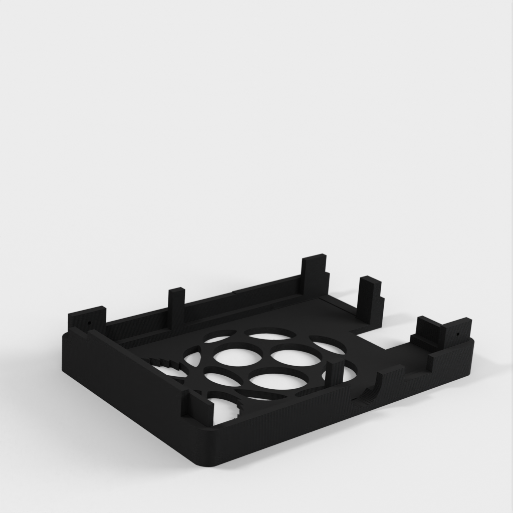 Dies ist ein Fall für den Raspberry Pi, einen Computer im Kreditkartenformat. Das Gehäuse ist mit mehreren Ebenen konzipiert und bietet Platz für Komponenten und GPIO-Anschlüsse. Indem wir bei den Löchern für die Komponenten einen kleinen Spielraum lassen, stellen wir sicher, dass diese immer passen. Es gibt auch die Option eines offenen Logos und eines Leiterplattenhalters.