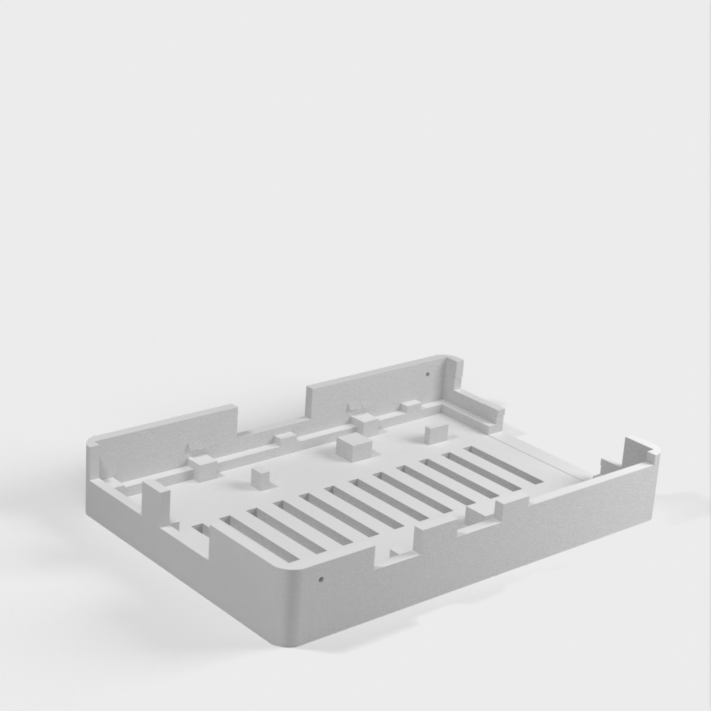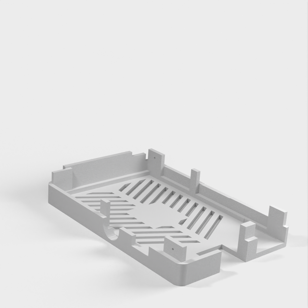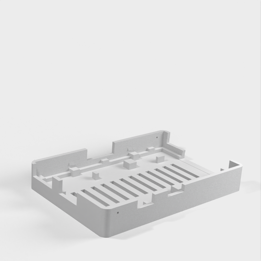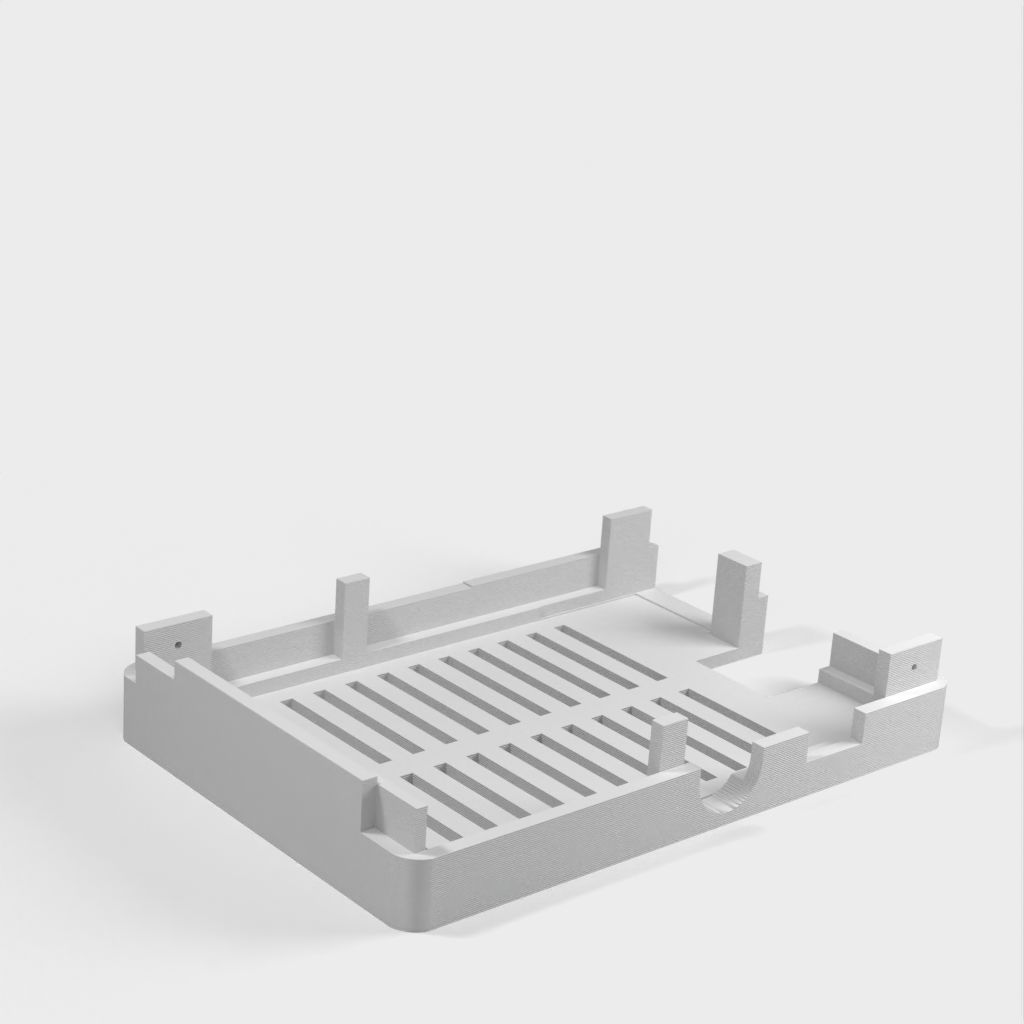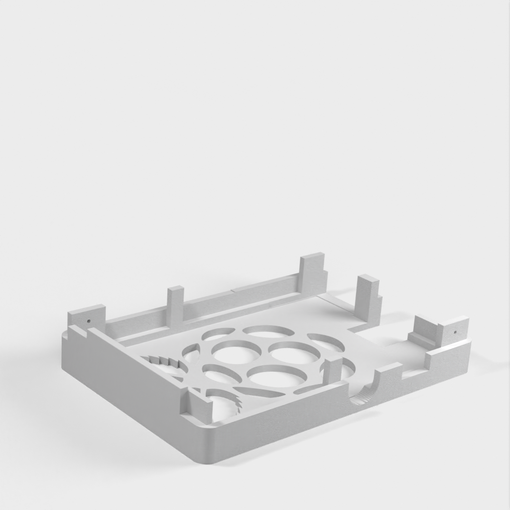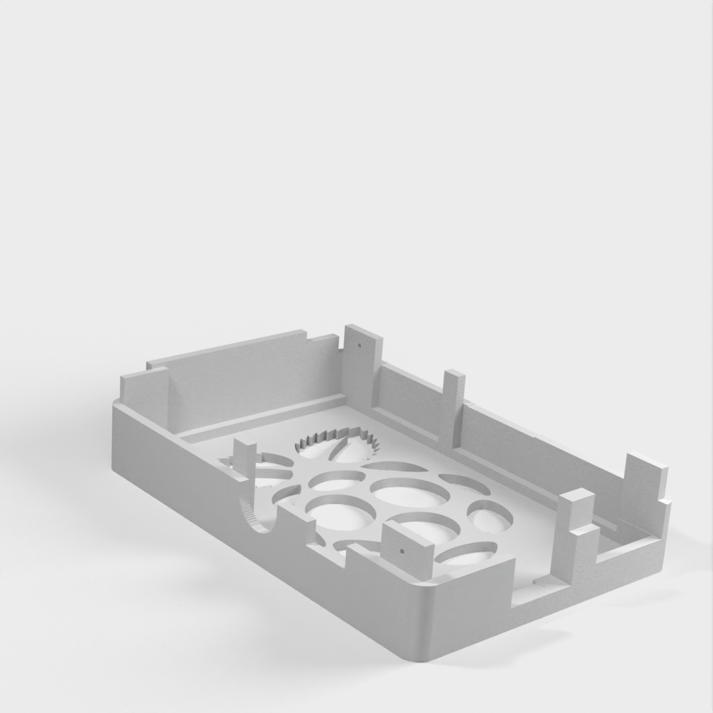 Dies ist ein Fall für den Raspberry Pi, einen Computer im Kreditkartenformat. Das Gehäuse ist mit mehreren Ebenen konzipiert und bietet Platz für Komponenten und GPIO-Anschlüsse. Indem wir bei den Löchern für die Komponenten einen kleinen Spielraum lassen, stellen wir sicher, dass diese immer passen. Es gibt auch die Option eines offenen Logos und eines Leiterplattenhalters.