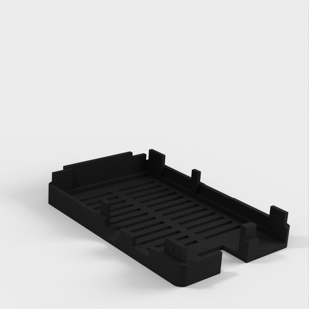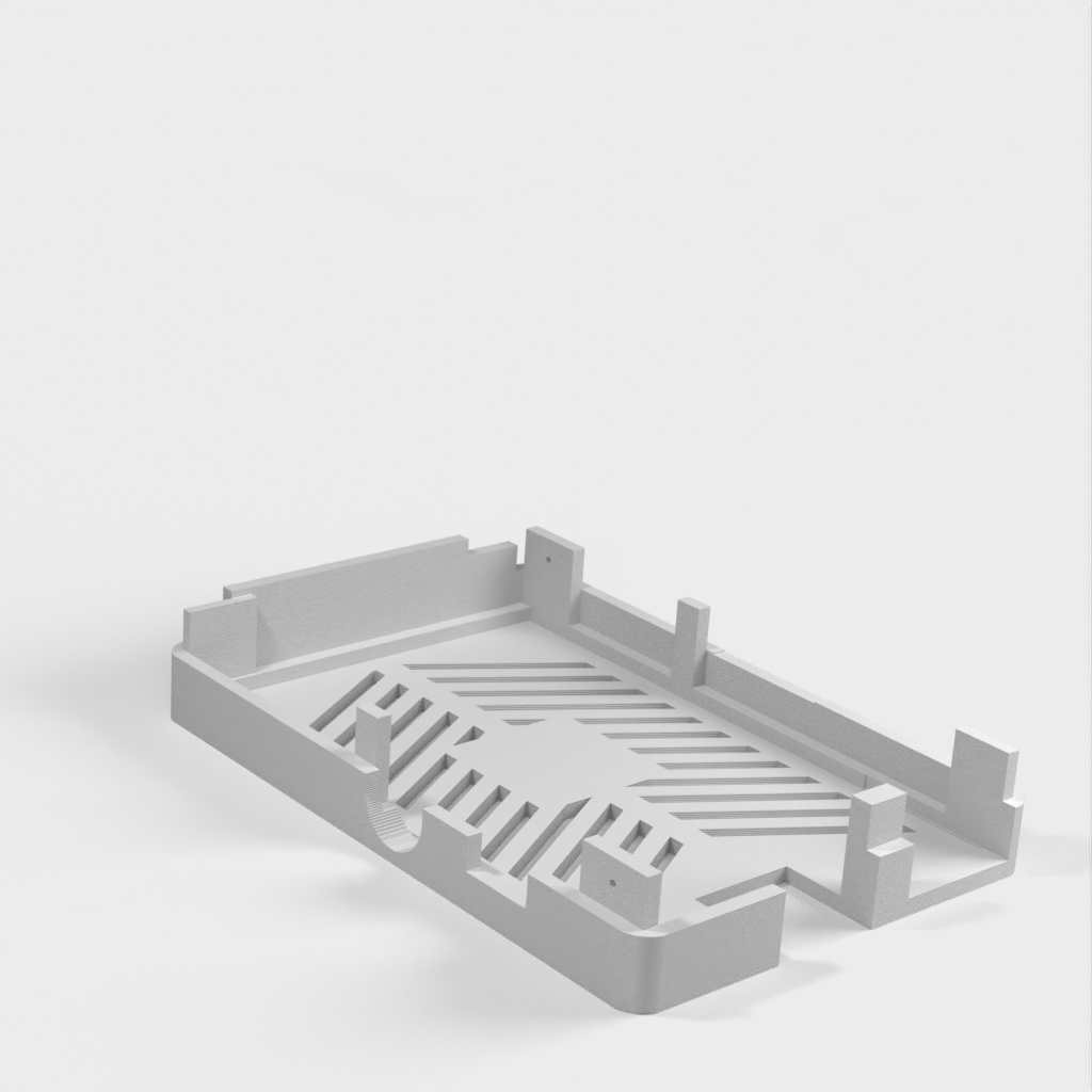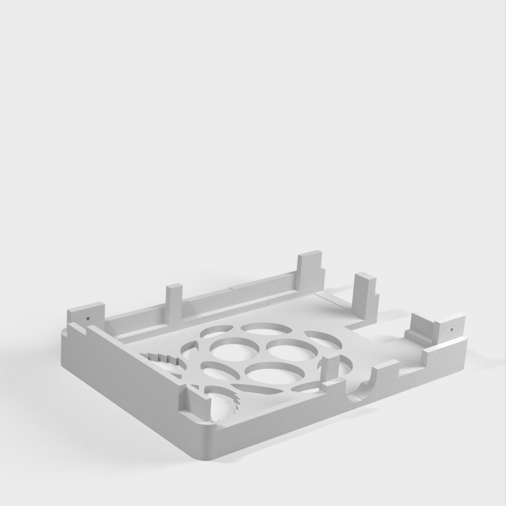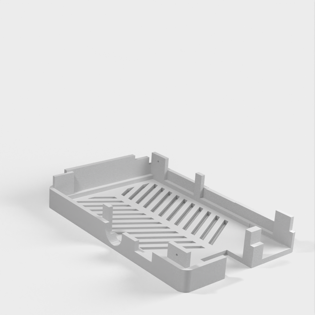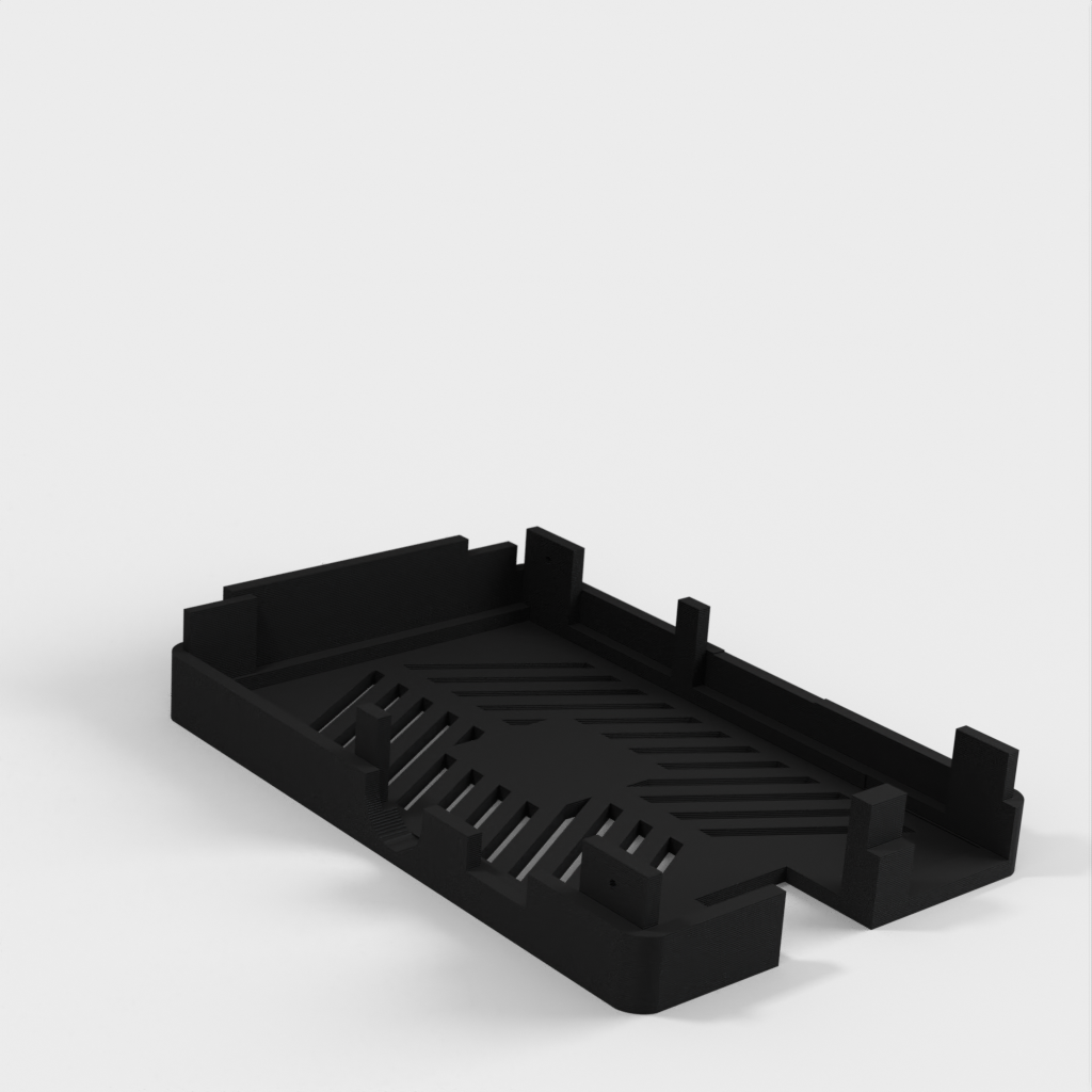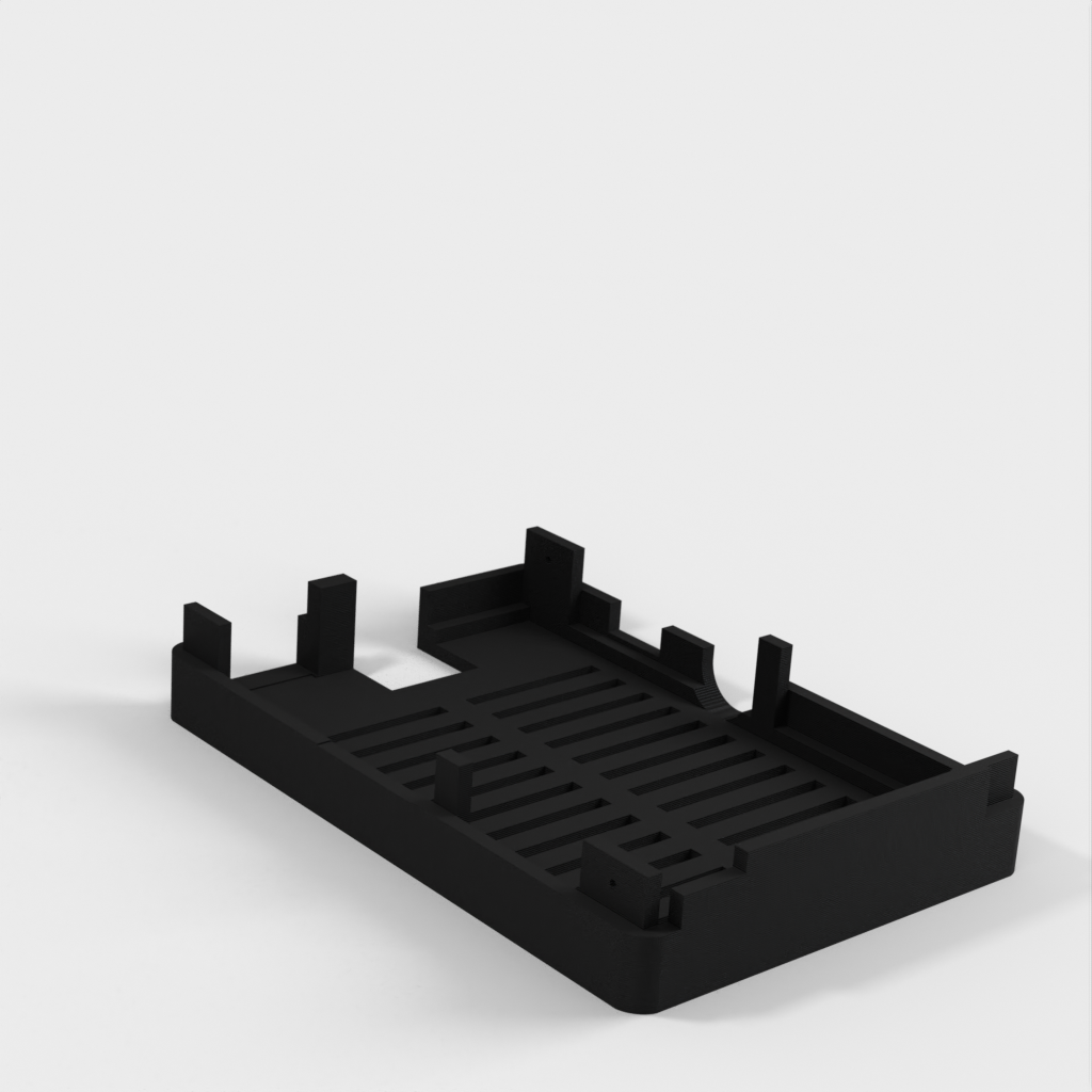 Dies ist ein Fall für den Raspberry Pi, einen Computer im Kreditkartenformat. Das Gehäuse ist mit mehreren Ebenen konzipiert und bietet Platz für Komponenten und GPIO-Anschlüsse. Indem wir bei den Löchern für die Komponenten einen kleinen Spielraum lassen, stellen wir sicher, dass diese immer passen. Es gibt auch die Option eines offenen Logos und eines Leiterplattenhalters.