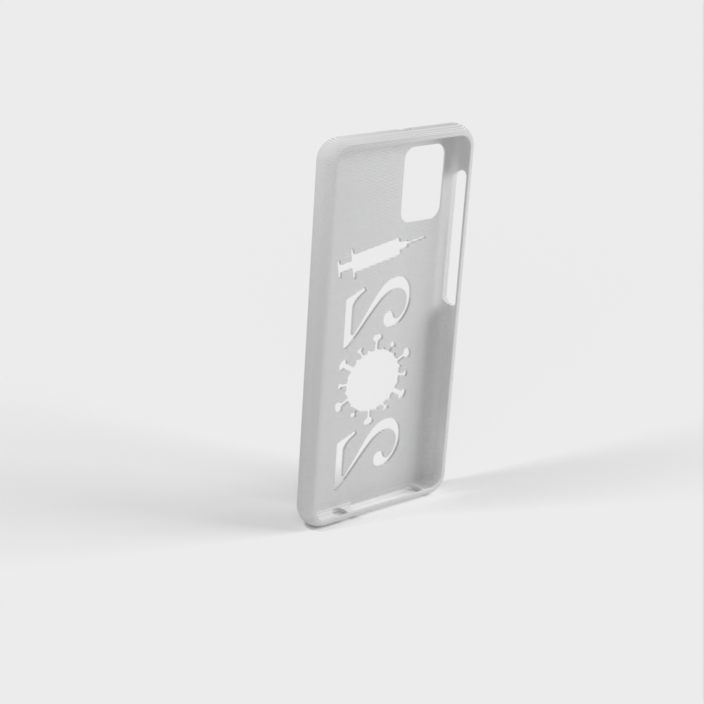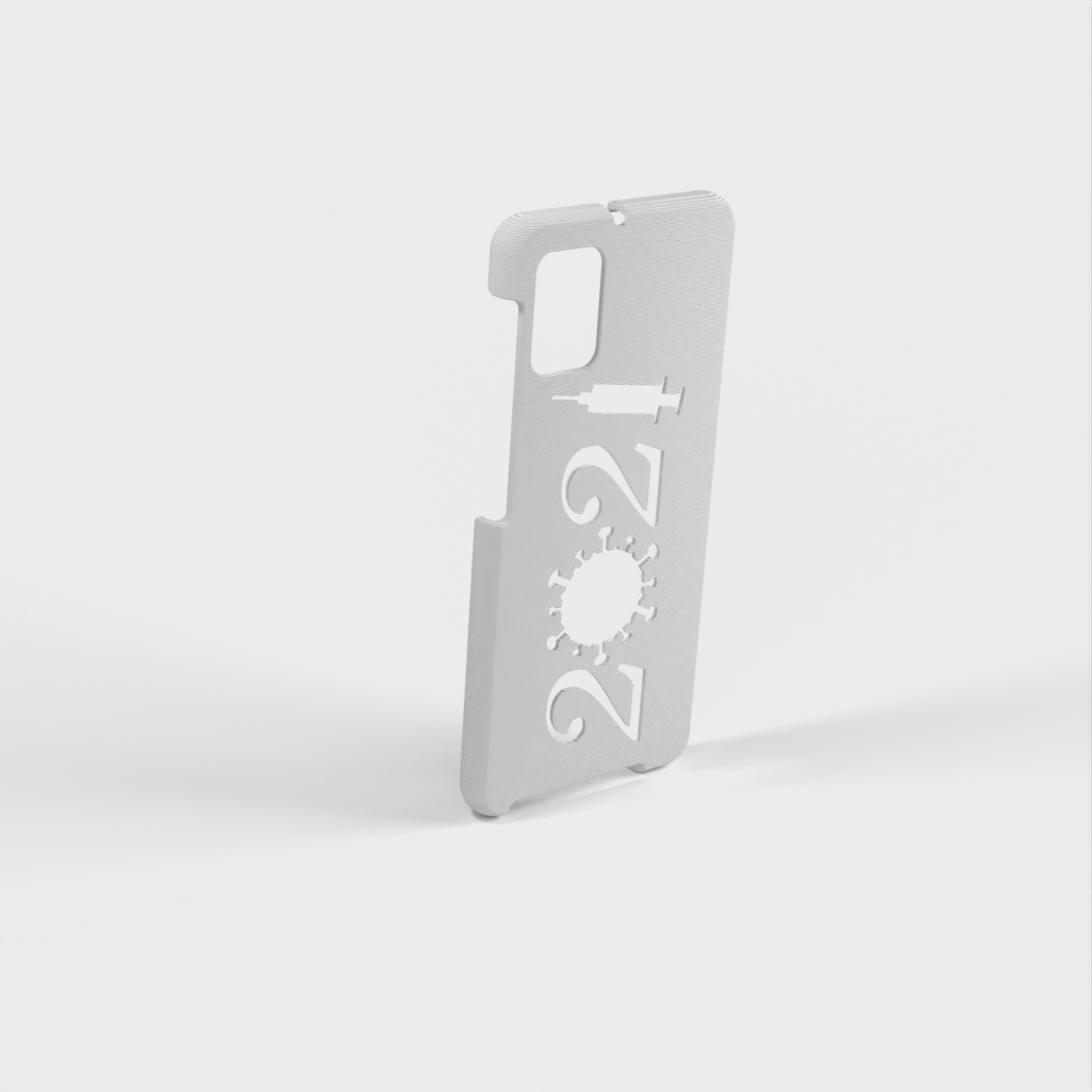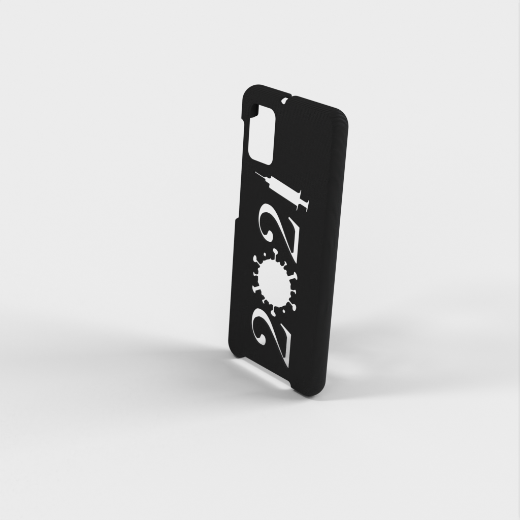 Eine Handyhülle für das Samsung Galaxy A31 a315. Die Hülle ist so konzipiert, dass sie perfekt um das Telefon passt, und es gibt Öffnungen für alle Tasten und Funktionen. Auf der Rückseite des Gehäuses befindet sich ein einzigartiges Design mit der Jahreszahl „2021“ in Form eines Virus und einer Spritze – ein Symbol der Covid-19-Impfung.