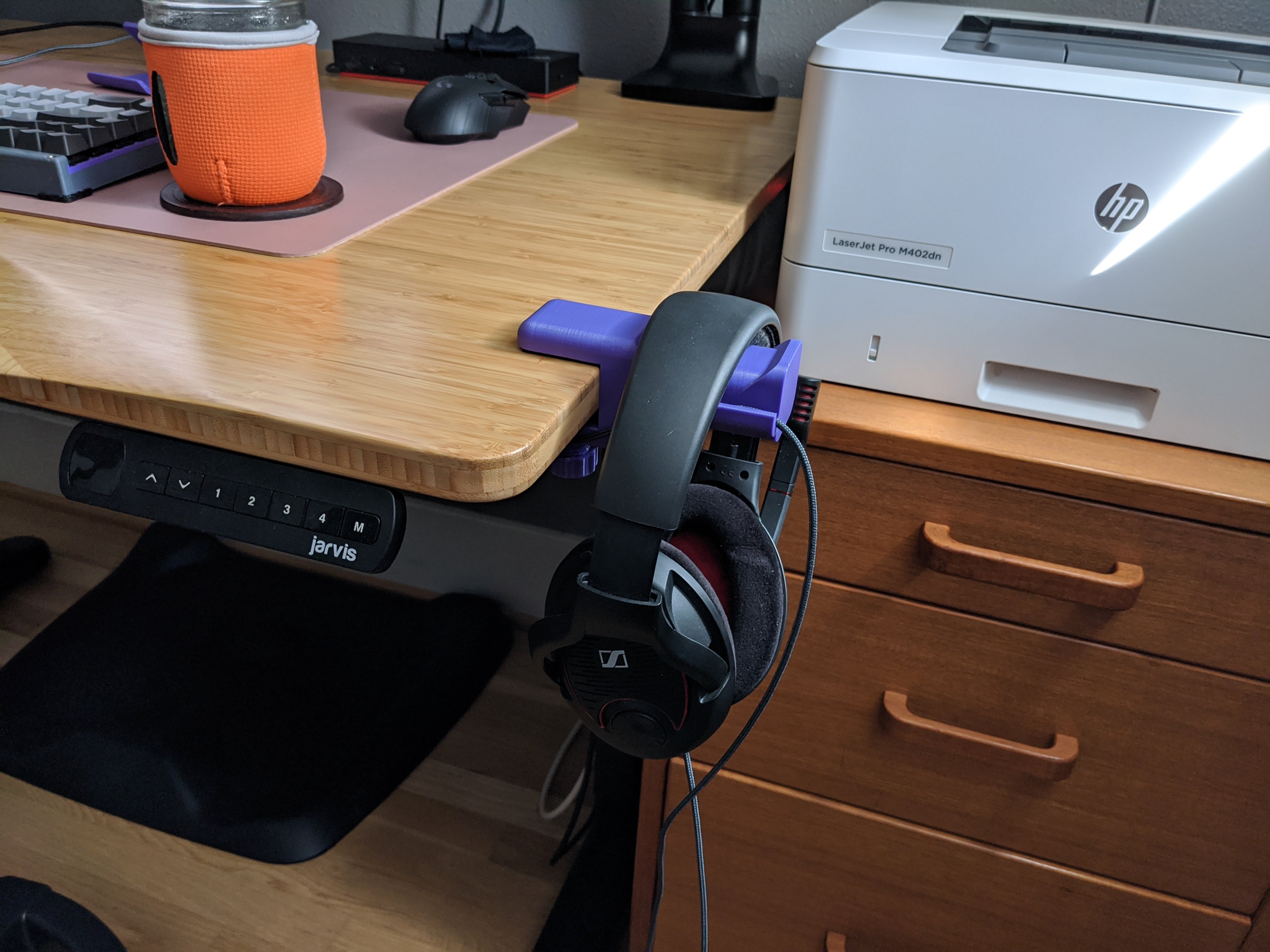 Dies ist ein Kopfhörer-Aufhänger, der auf einem Schreibtisch montiert werden kann. Es kann über Fusion 360 parametrisch an Ihre Bedürfnisse angepasst werden. Nach dem Drucken befestigen Sie am besten etwas mit etwas Halt auf den Oberflächen, die den Schreibtisch berühren. Dadurch wird sichergestellt, dass der Kleiderbügel fest am Schreibtisch befestigt bleibt und nicht verrutscht.
