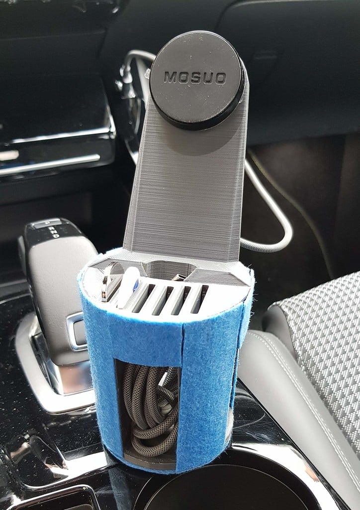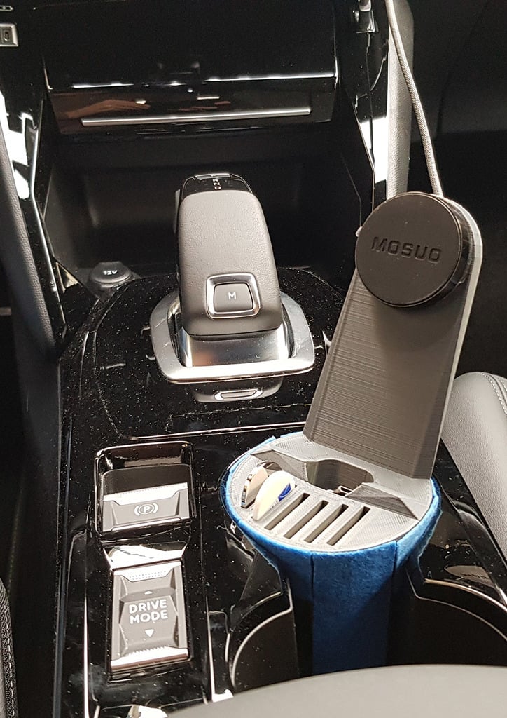 Neben der Handyablage verfügt das Design über sechs Münzfächer, in denen sich Kleingeld, beispielsweise für Parkgebühren oder Mautgebühren, bequem verstauen lässt. Das Produkt ist so konzipiert, dass es genau in den vorhandenen Getränkehalter des Fahrzeugs passt. Für eine noch optimalere Passform kann eine Filzplatte hinzugefügt werden.