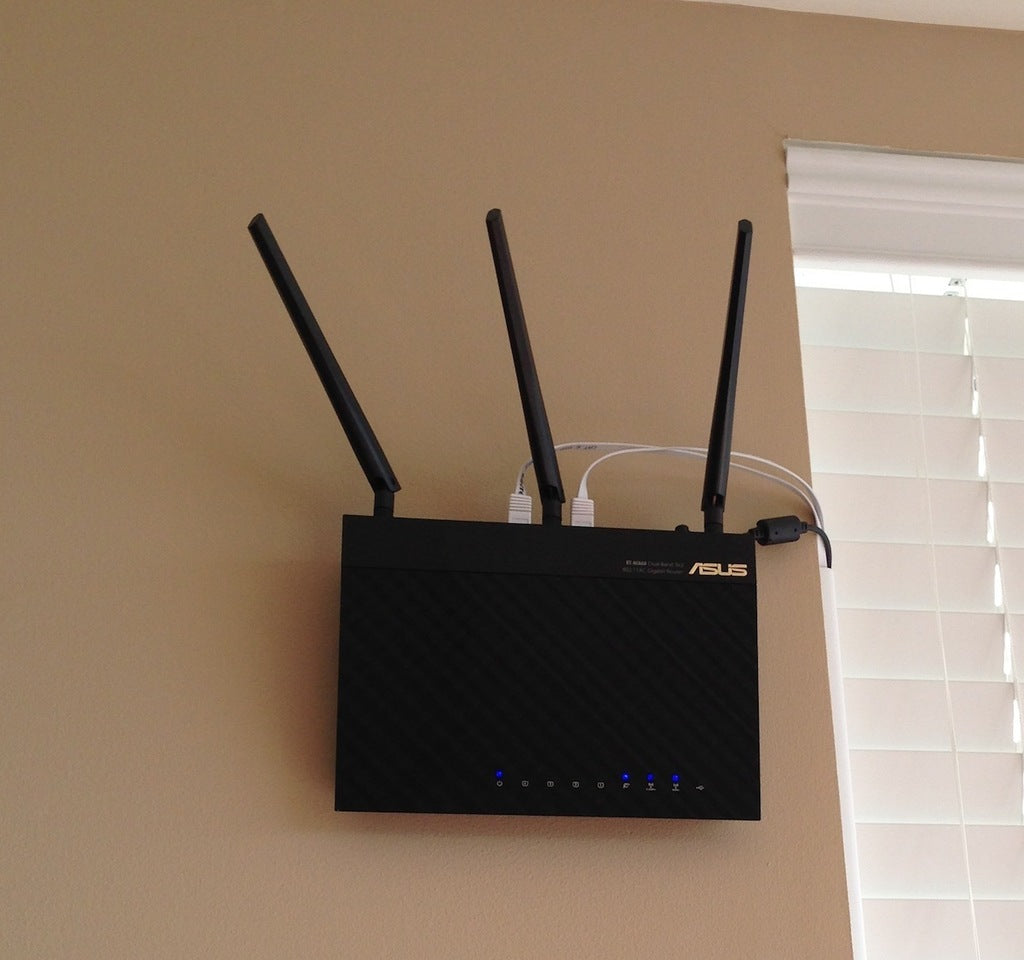 Es gibt zwei Löcher für Senkkopfschrauben, die in die Wand eingeführt werden, und die kleinen quadratischen Flansche greifen in die Löcher auf der Rückseite des Routers ein.