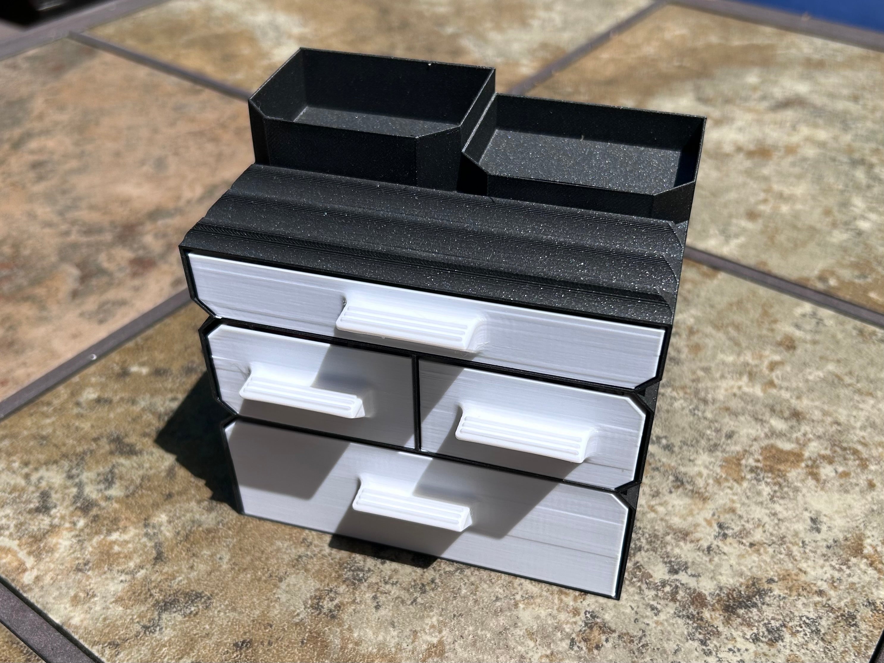 Der Mini Desk Organizer ist die ideale Lösung für die effiziente Aufbewahrung Ihres Schreibtisches. Mit drei verschiedenen Schubladengrößen können Sie kleine Gegenstände, von Büroklammern bis hin zu Haftnotizen, problemlos sortieren und aufbewahren, und die beiden Stift-/Bleistifthalter sorgen dafür, dass Ihre Schreibutensilien immer griffbereit sind. Die beiden oberen Behälter bieten zusätzlichen Platz, um Ihre Büroutensilien organisiert und griffbereit aufzubewahren.