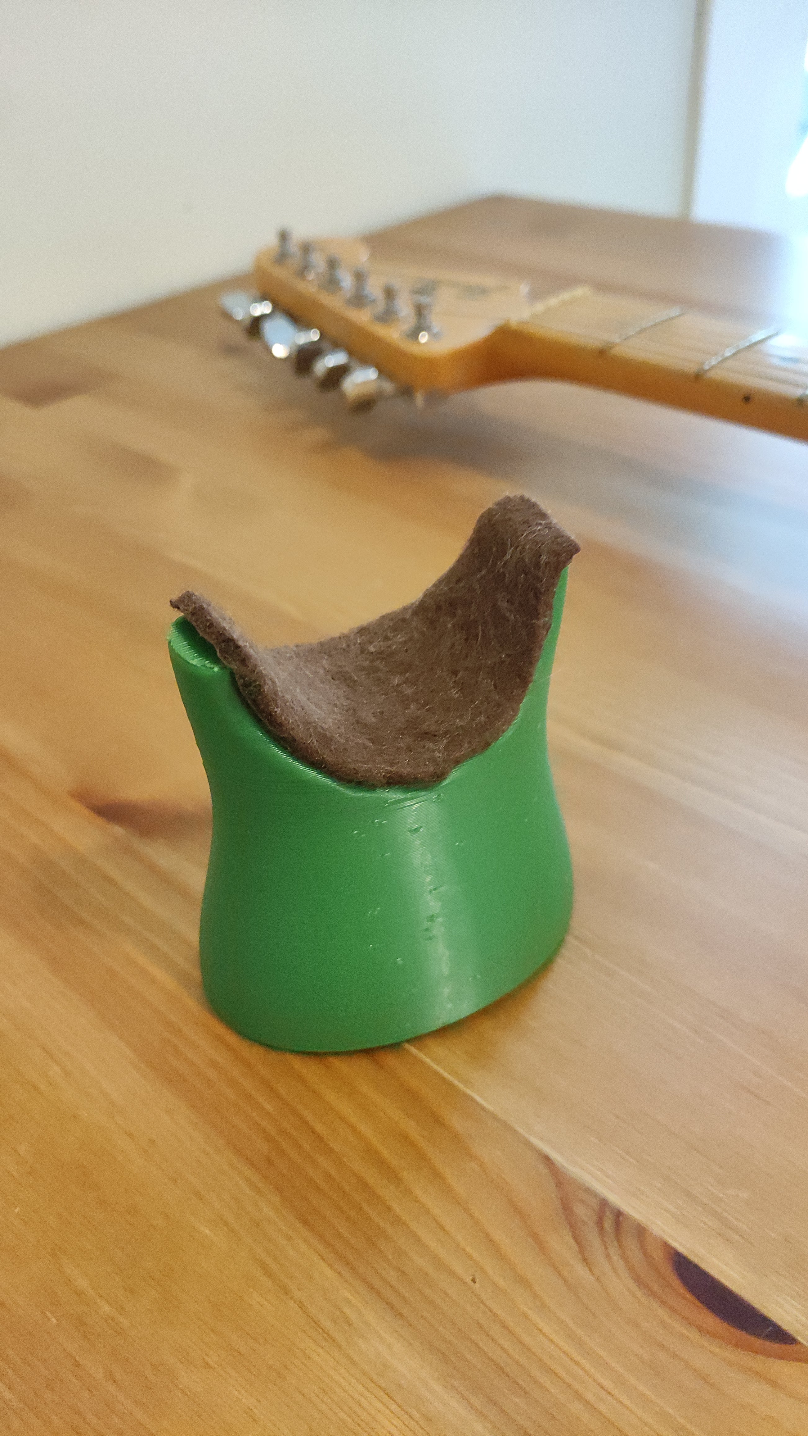 Die Halsstütze ist jedoch vielseitig einsetzbar und kann je nach Aufgabe auch weiter oben am Gitarrenhals eingesetzt werden. Zum Schutz von Lack und Holz empfiehlt es sich, die Auflagefläche mit einem weichen Material wie selbstklebendem Filz zu polstern. Die leicht gewölbte Basis sorgt für eine gute Balance und folgt dem natürlichen Winkel der Gitarre während der Arbeit, was zu erhöhter Stabilität beiträgt.