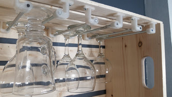 Dieser Weinglashalter bietet eine praktische und platzsparende Lösung zur Aufbewahrung Ihrer Weingläser – eine attraktive Wahl für alle, die nach effizienten Alternativen suchen. Er lässt sich diskret unter Regalen, Barschränken oder Küchenschränken montieren, wodurch wertvoller Platz im Schrank frei wird und Ihre Gläser übersichtlich und leicht zugänglich bleiben. Das System ist flexibel und ermöglicht es Ihnen, die Stangenlänge (Stange nicht im Lieferumfang enthalten) genau an Ihre Bedürfnisse anzupassen. Der Abstand zwischen den beiden Haltern kann so angepasst werden, dass er perfekt zum Boden Ihrer Weingläser passt und sicher und stabil hängt. Die Montage ist einfach und kann mit Standardschrauben erfolgen, was diesen Halter zu einer funktionalen und stilvollen Ergänzung für jedes Zuhause macht.