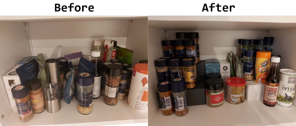 Dieses praktische Gewürzregal und Küchenschrank-Organizer wurde entwickelt, um die Übersicht und Zugänglichkeit Ihrer Küchenschränke zu verbessern. Indem Sie Ihre Gewürze oder andere kleine Gegenstände höher stellen, können Sie Gegenstände, die sonst hinten im Schrank versteckt sind, leichter sehen und erreichen.
