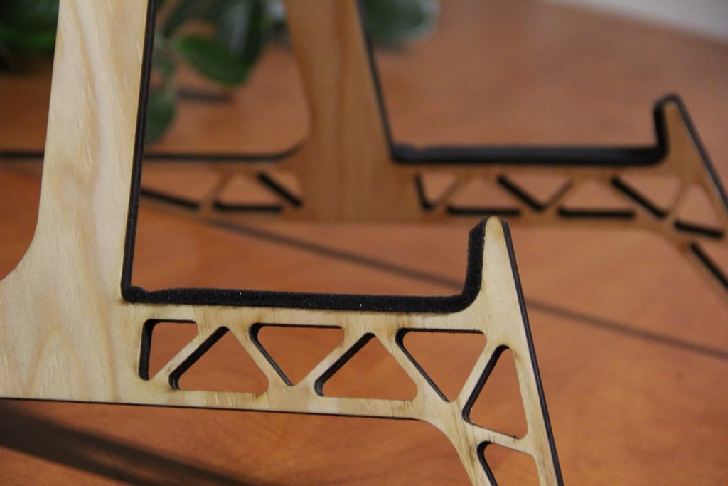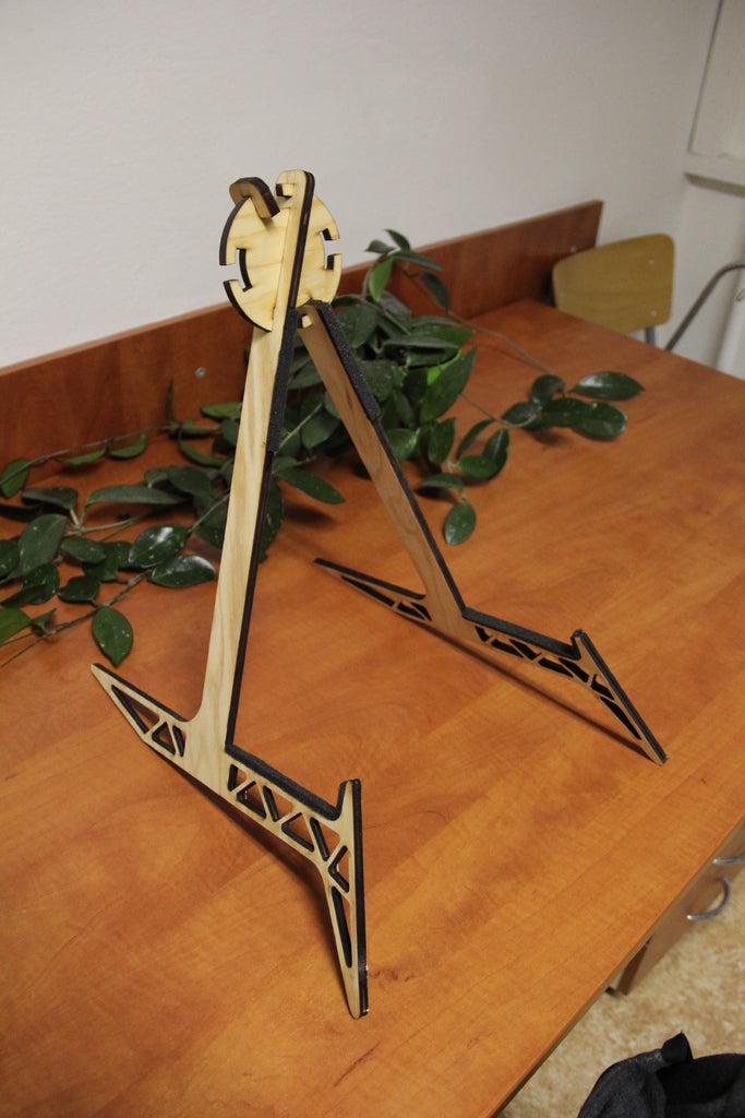 Dieser lasergeschnittene Gitarrenständer ist speziell für Akustikgitarren konzipiert und gewährleistet einen stabilen und sicheren Stand Ihres Instruments. Der Ständer ist für Gitarren mit den Abmessungen 500 x 440 x 110 mm und einem Schwerpunkt in ca. 400 mm Höhe ausgelegt. Die zentrale runde Halterung ermöglicht eine Winkelverstellung der Beine auf 30 oder 45 Grad und bietet so Flexibilität beim Aufstellen. Um Ihre Gitarre vor Kratzern zu schützen, empfiehlt es sich, die Kanten mit einem weichen Material, wie z. B. Akustikschaum, auszukleiden. Dieser Ständer aus 8 mm starkem Kiefernsperrholz bietet eine stabile und stilvolle Lösung zur Aufbewahrung Ihrer Akustikgitarre.