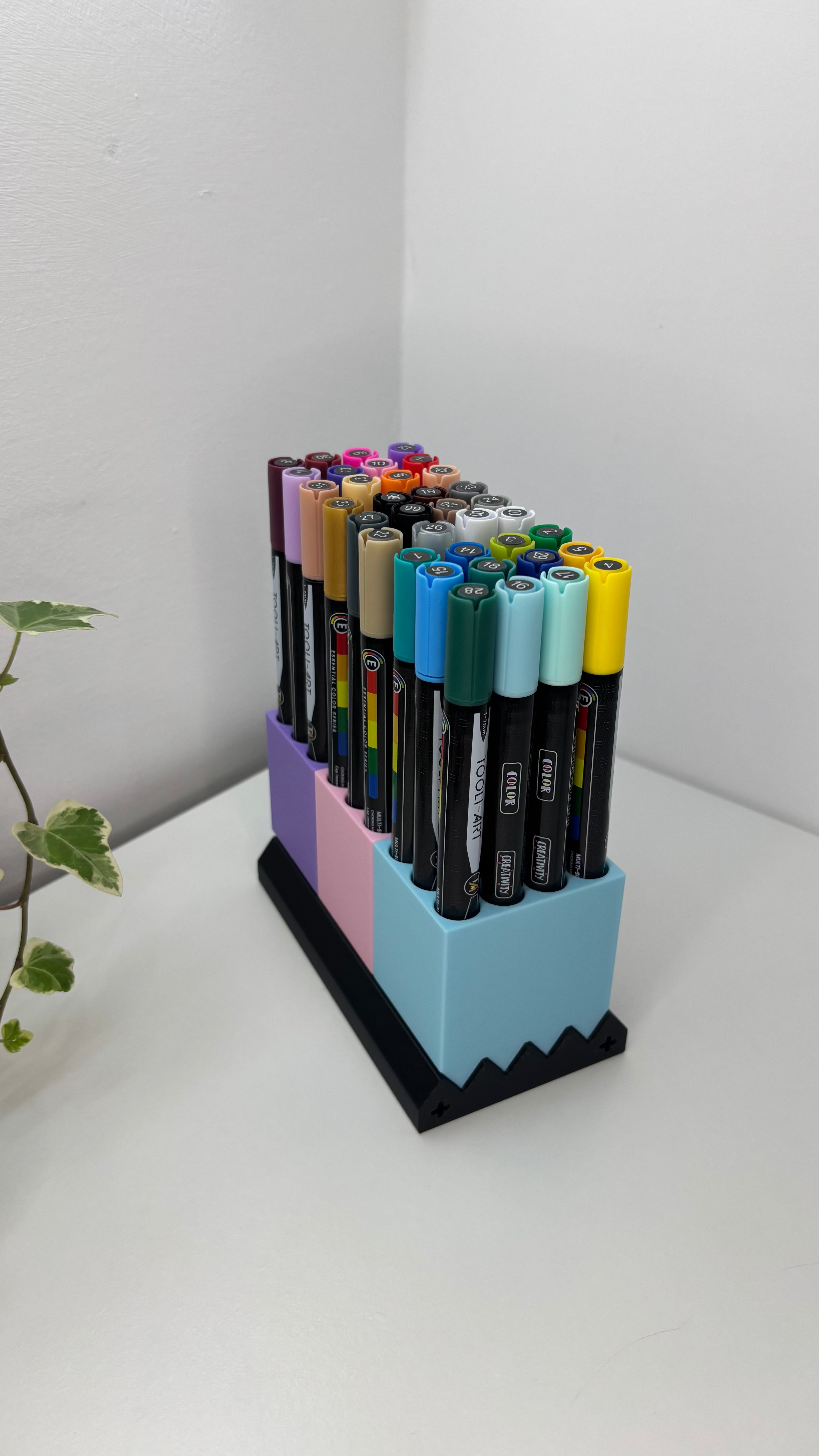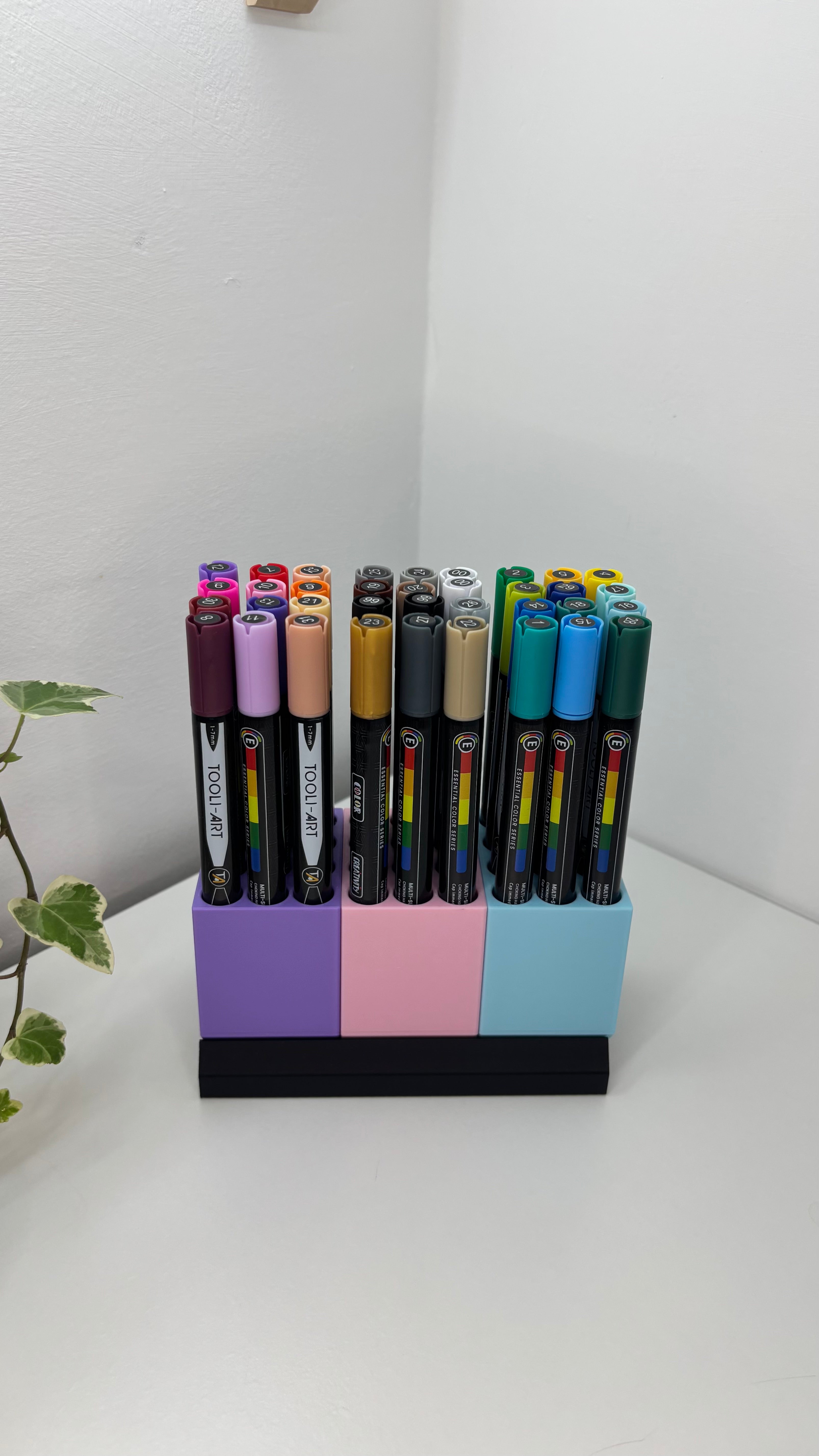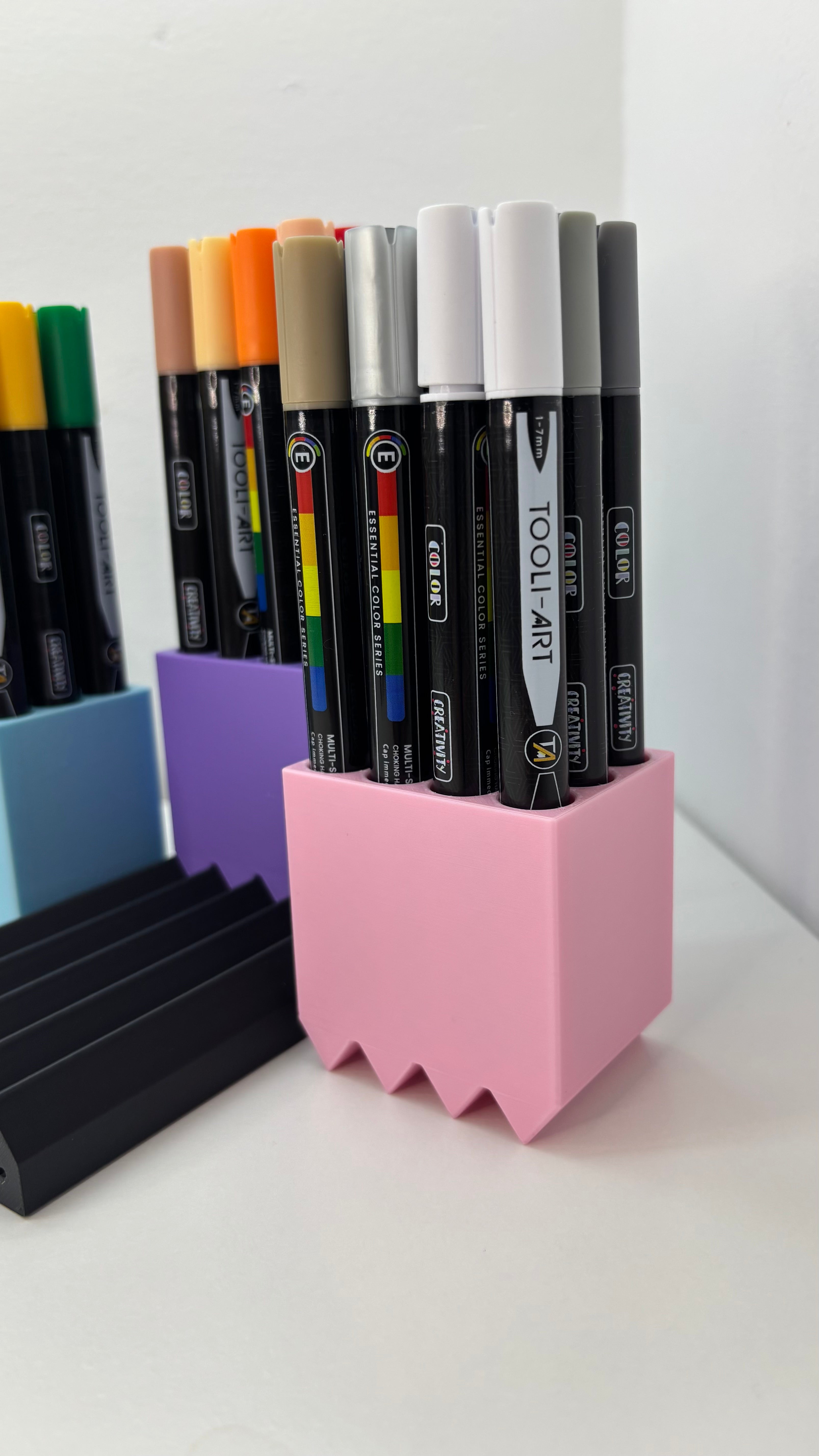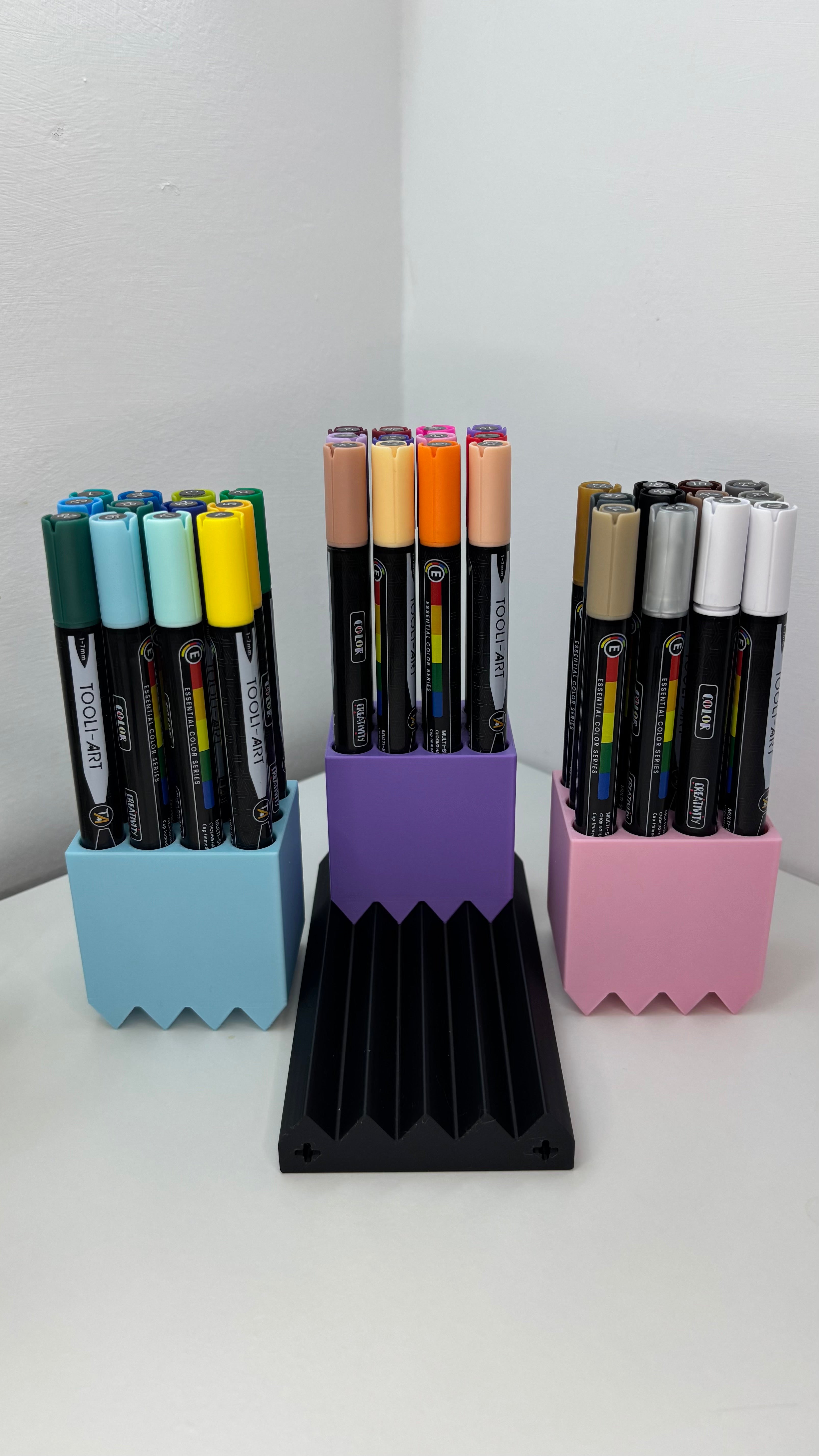 Jeder Stifthalter bietet Platz für 12 Stifte oder Marker, und die untere Basis bietet Platz für bis zu drei Halter. So entsteht eine Stiftaufbewahrungslösung für bis zu 36 Schreibgeräte. Der anpassbare Stifthalter und das skalierbare Design machen ihn zu einem vielseitigen Büro-Organizer und einem unverzichtbaren Schreibtisch-Accessoire für jedes Homeoffice, jeden Kunstarbeitsplatz oder jede kreative Umgebung. Er fungiert als moderner Schreibtisch-Organizer , der zu einem aufgeräumten und funktionalen Arbeitsplatz beiträgt – ideal für Künstler, Studenten und Berufstätige, die eine modulare Aufbewahrungslösung suchen.