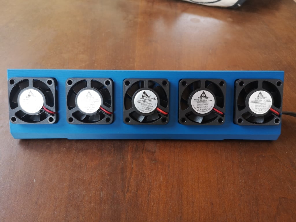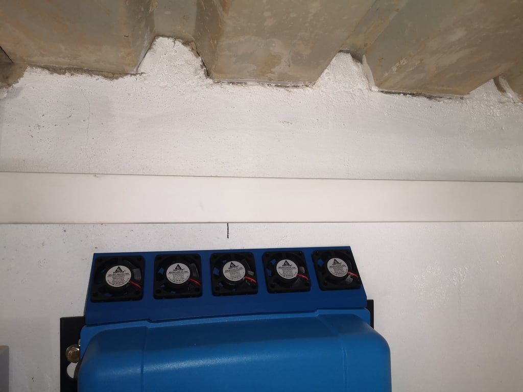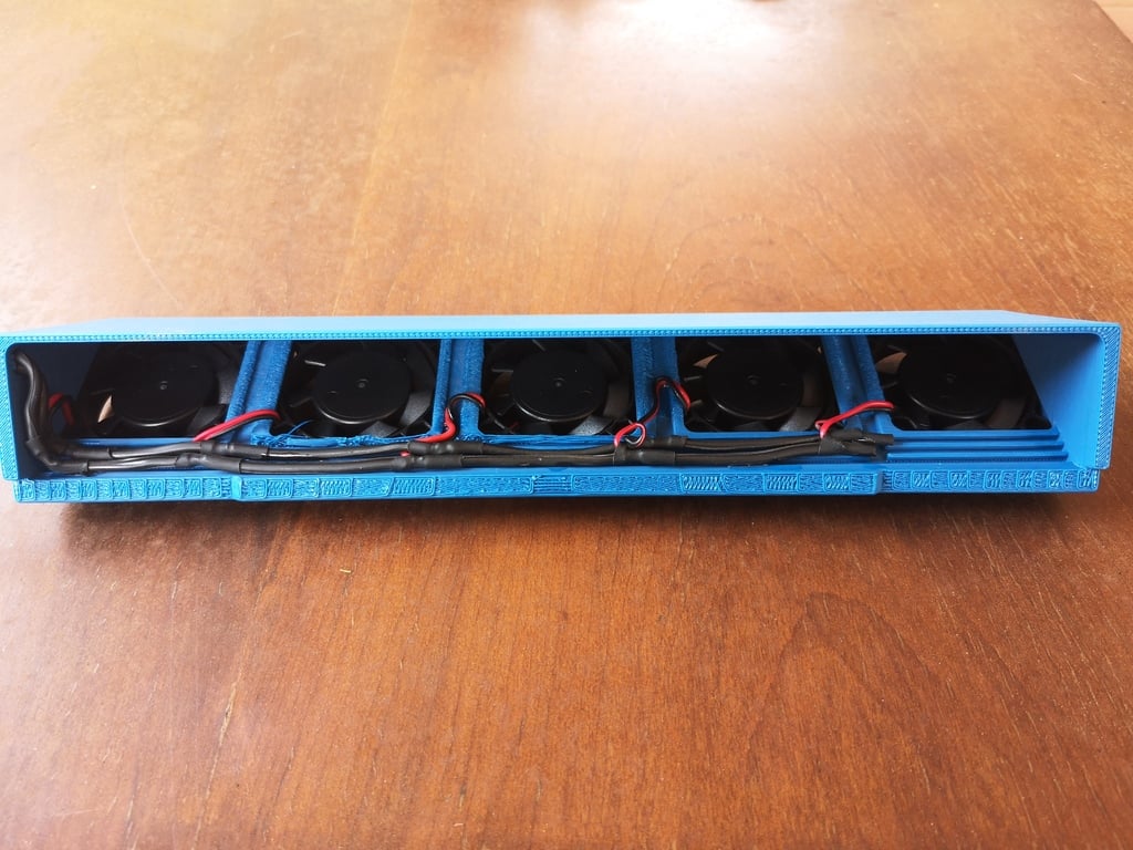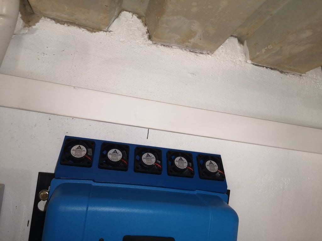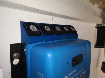 Eine Dunstabzugshaube für 5 x 40-mm-Lüfter an einem Victron 250/100 MPPT. Diese Abdeckung verbessert die Kühlung des Kühlkörpers hinter dem Ladegerät erheblich.