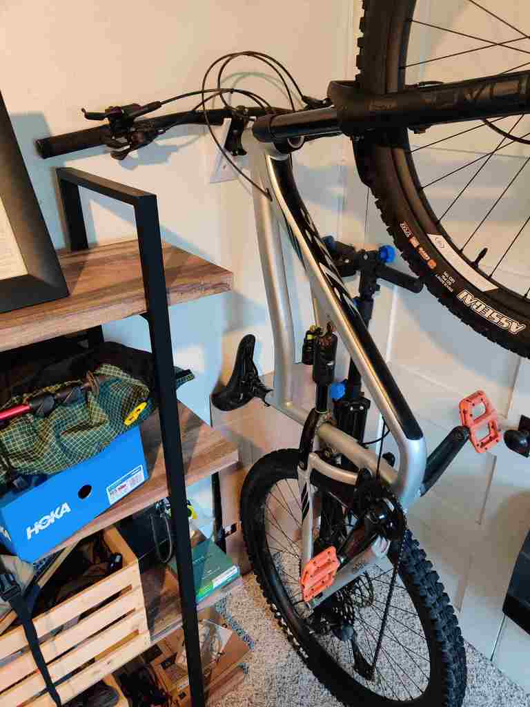 Wandhalterung für ein 2020 Ibis Ripmo AF Mountainbike. Diese Halterung ist so konzipiert, dass das Fahrrad nahe an der Wand ruht, während das Hinterrad auf dem Boden ruht. Es handelt sich um ein robustes Gerät, das dem Gewicht Ihres Fahrrads problemlos standhält. Kann mit den seitlichen Halterungen montiert werden. Kompatibel mit den Ripmo AF-Modellen.