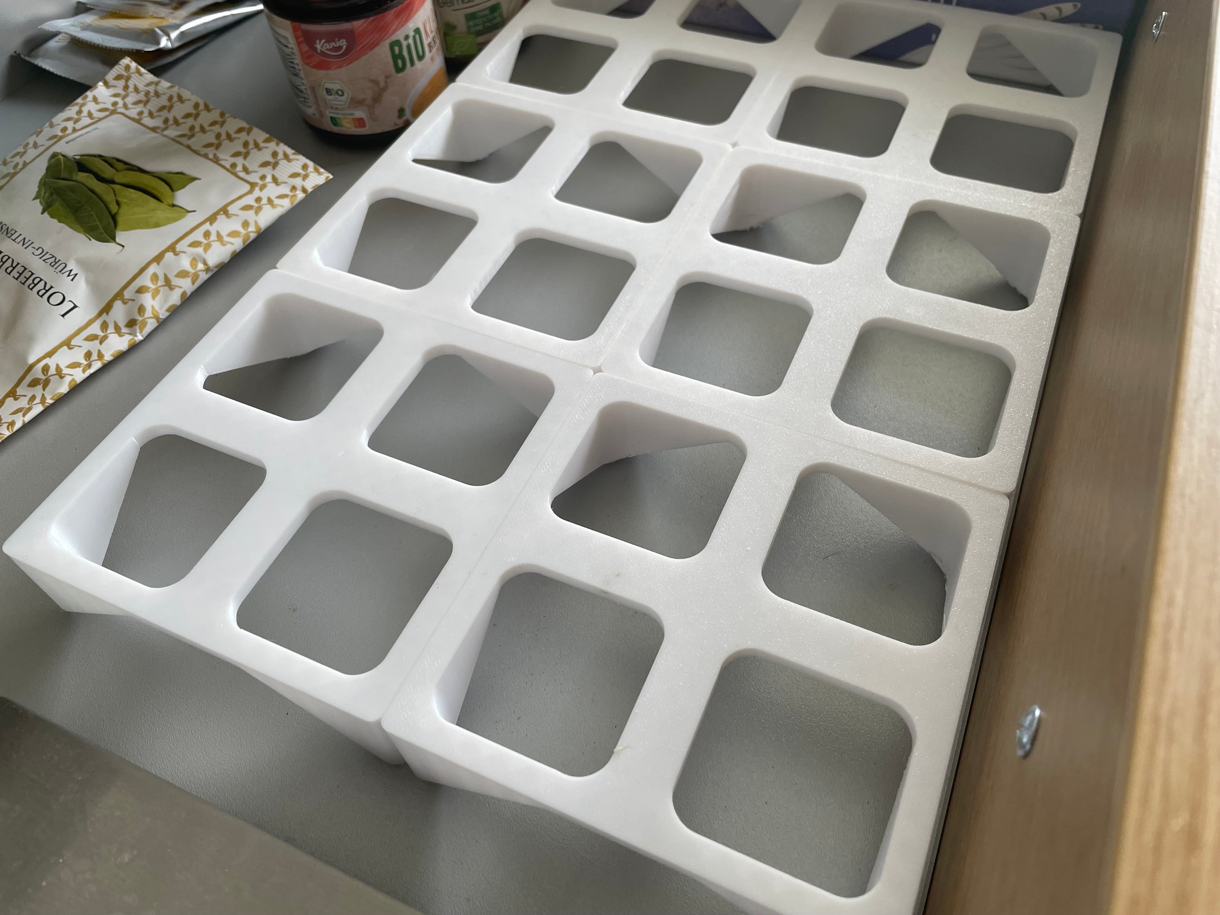 Die Gewürzaufbewahrung kann in verschiedenen Größen bedruckt werden, damit sie in Ihre Schublade passt. Mit Steckplätzen an der Unterseite können Sie problemlos mehrere Geräte anschließen, um ein größeres System zu erstellen und so Ihre Speicherkapazität zu erhöhen. Fügen Sie Fußpolster hinzu, um Ihren Oberflächen zusätzliche Stabilität und Schutz zu verleihen.