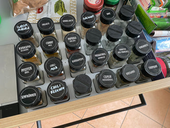 Organisieren Sie Ihre Gewürze mit diesem praktischen Gewürzdosen-Organizer für Schubladen. Es bietet eine effiziente Möglichkeit, Ihre Gewürze an Ort und Stelle und leicht zugänglich aufzubewahren. Diese Variante ist ideal für rechteckige Gewürzdosen, kann aber auch an runde Gewürzdosen angepasst werden und ist somit flexibel für verschiedene Aufbewahrungsbedürfnisse.