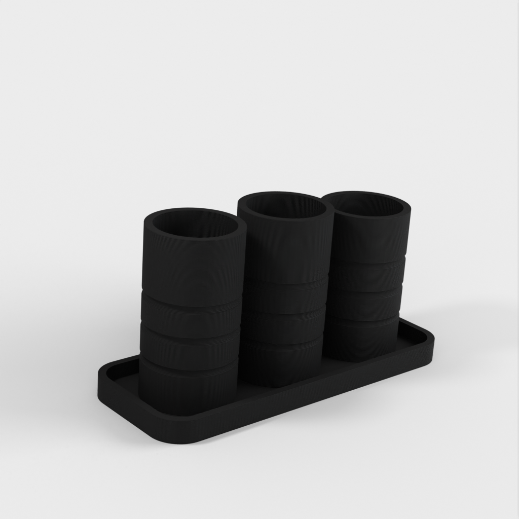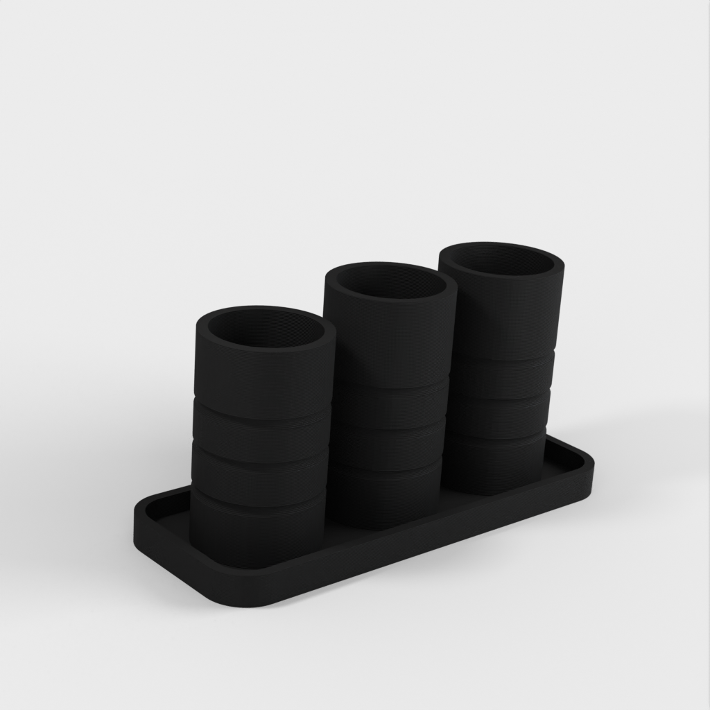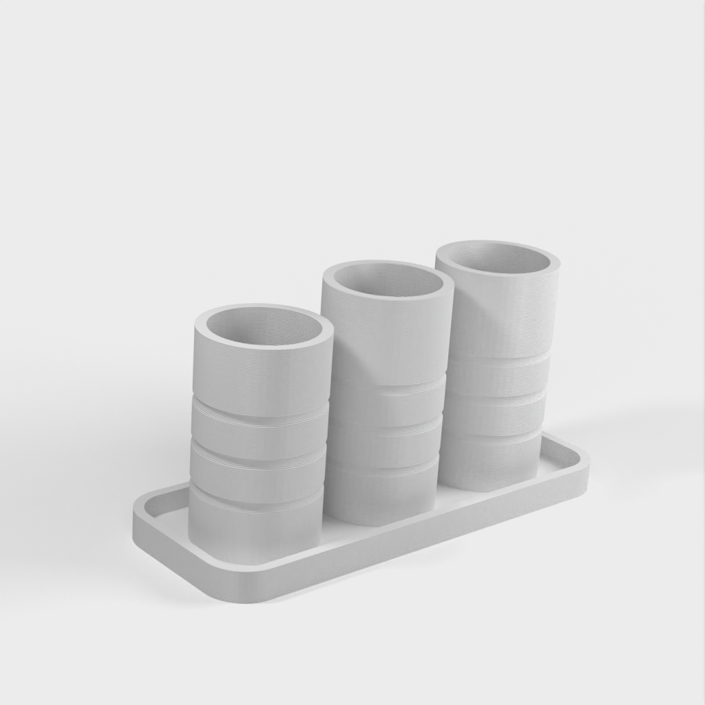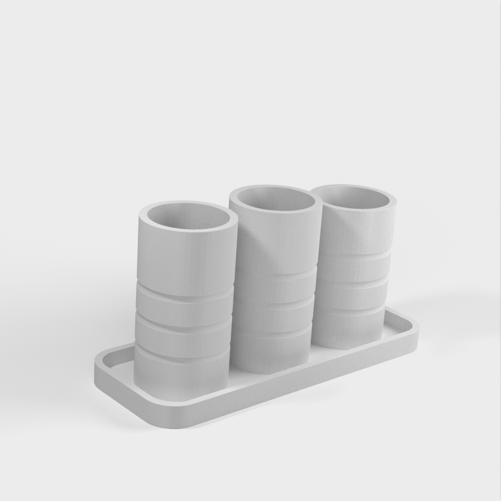Ein einfacher Badezimmer-Organizer mit zwei Haupthaltern für Zahnbürsten und einem dritten für Wattestäbchen oder andere Gegenstände. Helfen Sie dabei, Ihr Badezimmer aufgeräumt und organisiert zu halten.