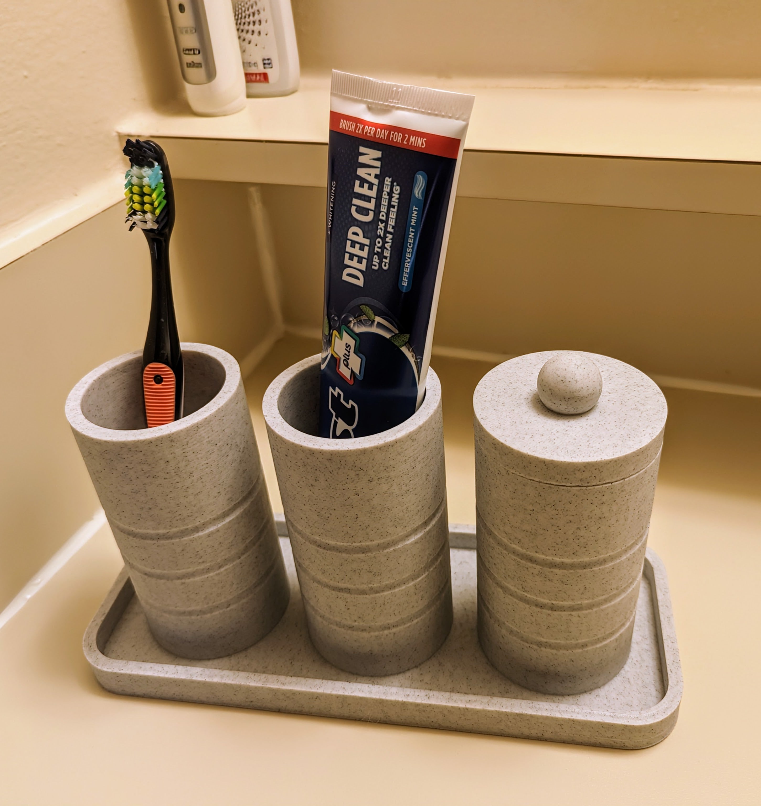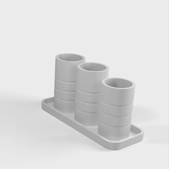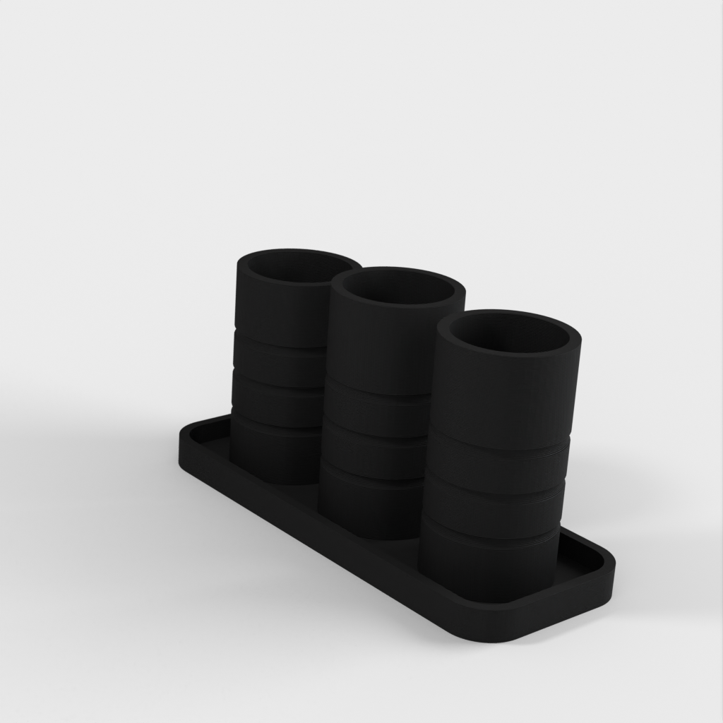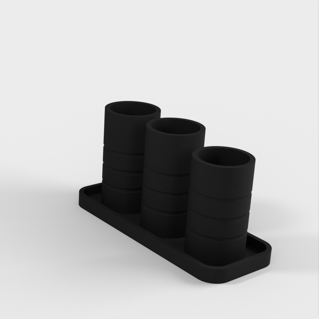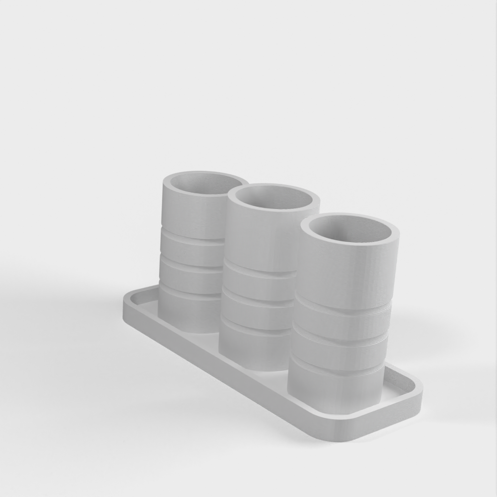 Ein einfacher Badezimmer-Organizer mit zwei Haupthaltern für Zahnbürsten und einem dritten für Wattestäbchen oder andere Gegenstände. Helfen Sie dabei, Ihr Badezimmer aufgeräumt und organisiert zu halten.