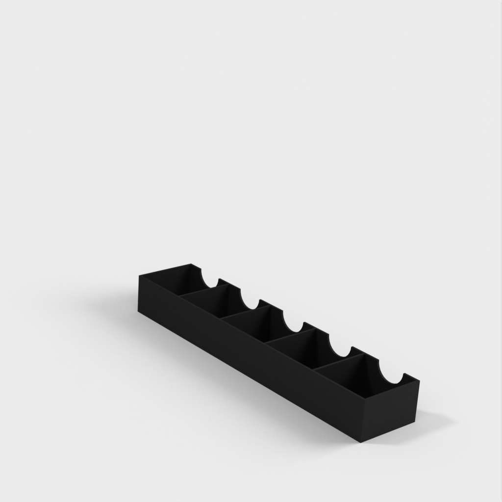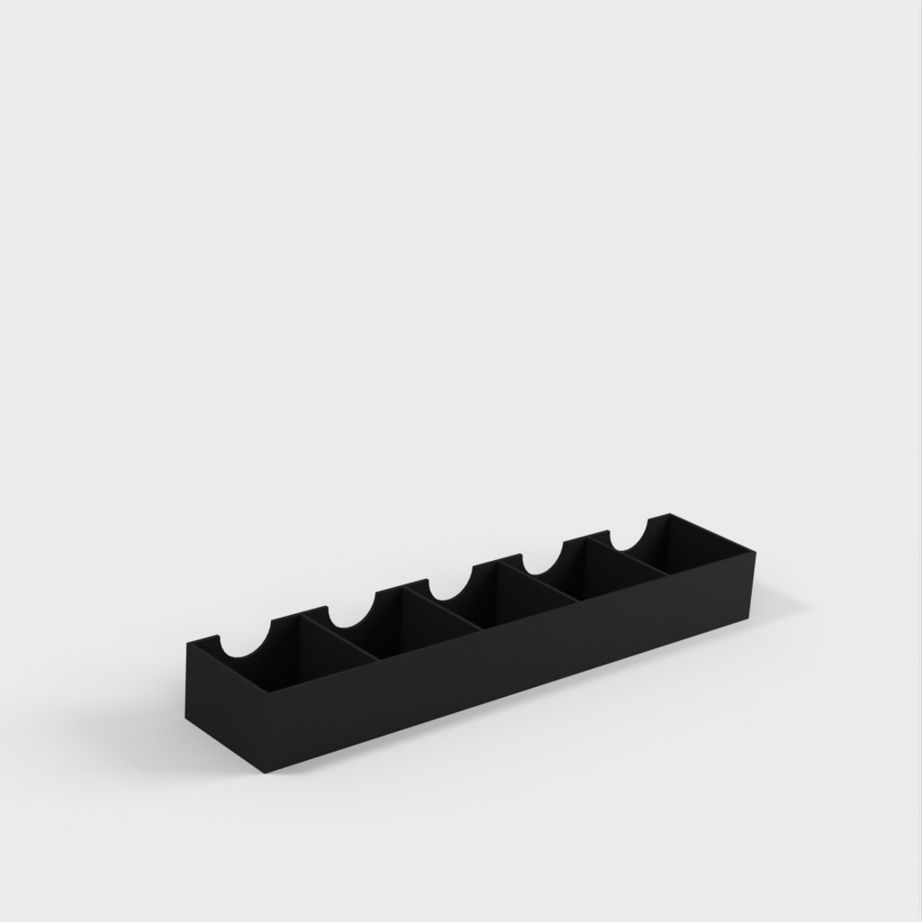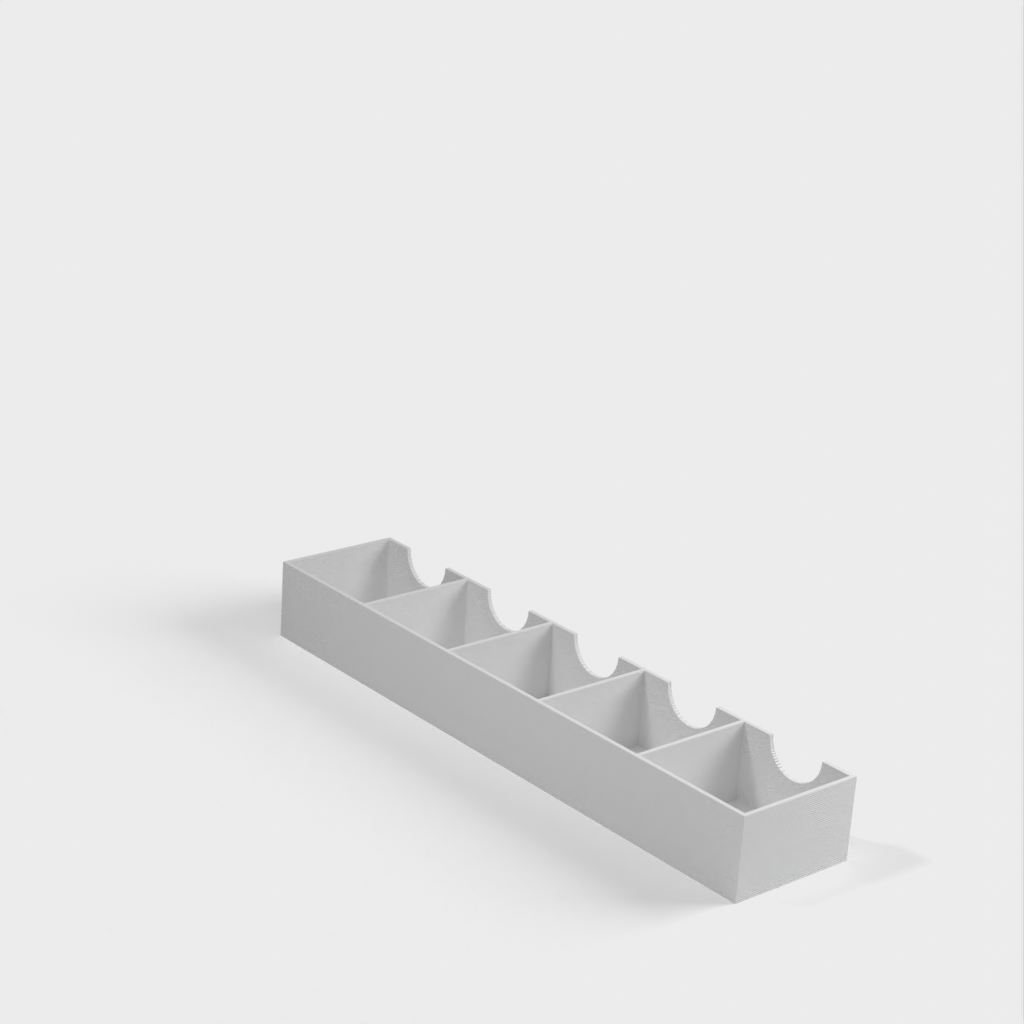 Dieser Halter kann zur einfachen und bequemen Aufbewahrung einfach mit doppelseitigem Klebeband an Schranktüren befestigt werden. Es kann mit OpenSCAD an Ihre spezifischen Bedürfnisse angepasst werden und bietet Platz für quadratische 45-mm-Flaschen.