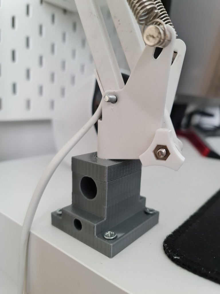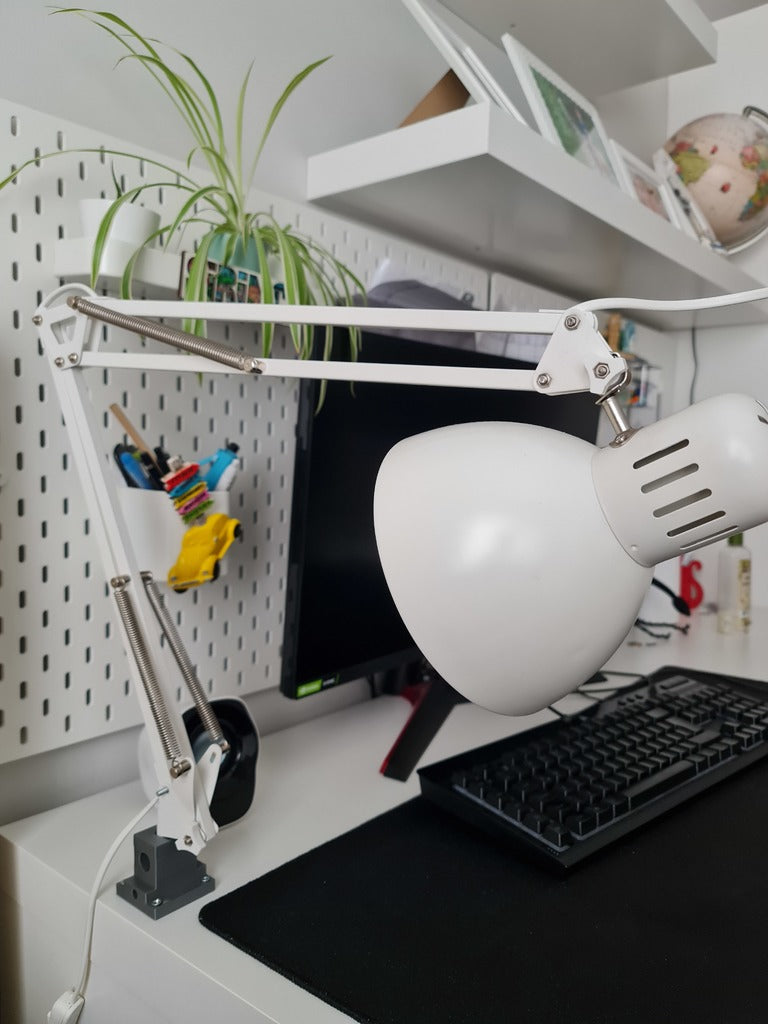 Eine Tischhalterung für die IKEA Tertial-Lampe. Für maximale Stabilität und minimale Bewegung kann die Halterung direkt am Schreibtisch befestigt werden. Geeignet für jedes Büro oder jeden Arbeitsbereich für optimale Beleuchtung. Für einen sauberen und aufgeräumten Arbeitsplatz lässt sich die Tertial-Leuchte einfach in die Halterung einhängen.