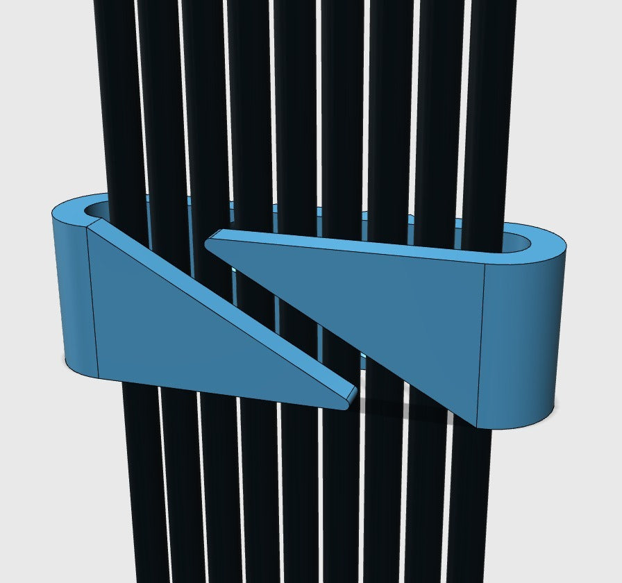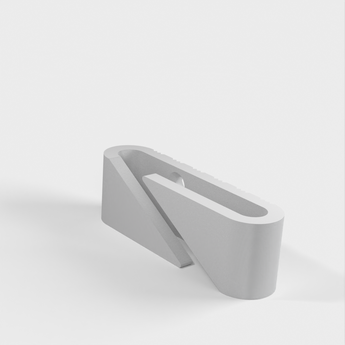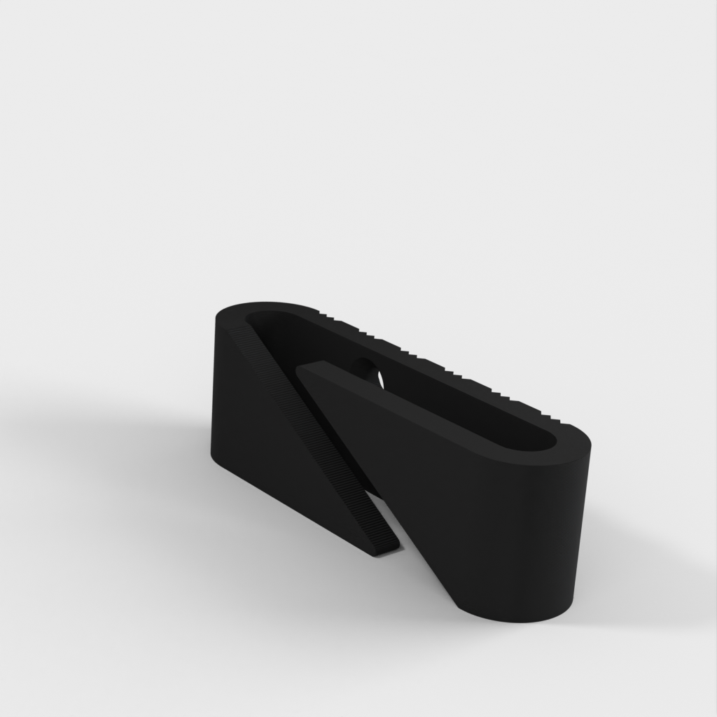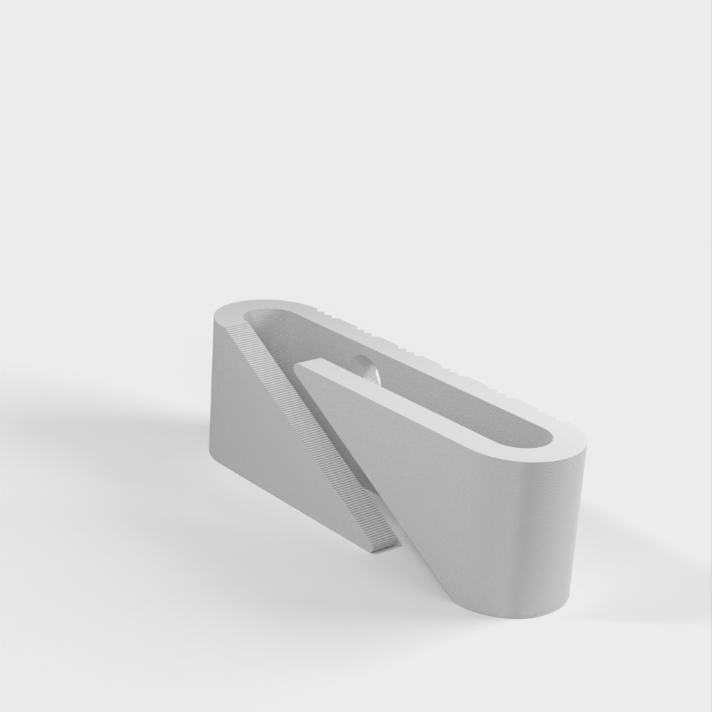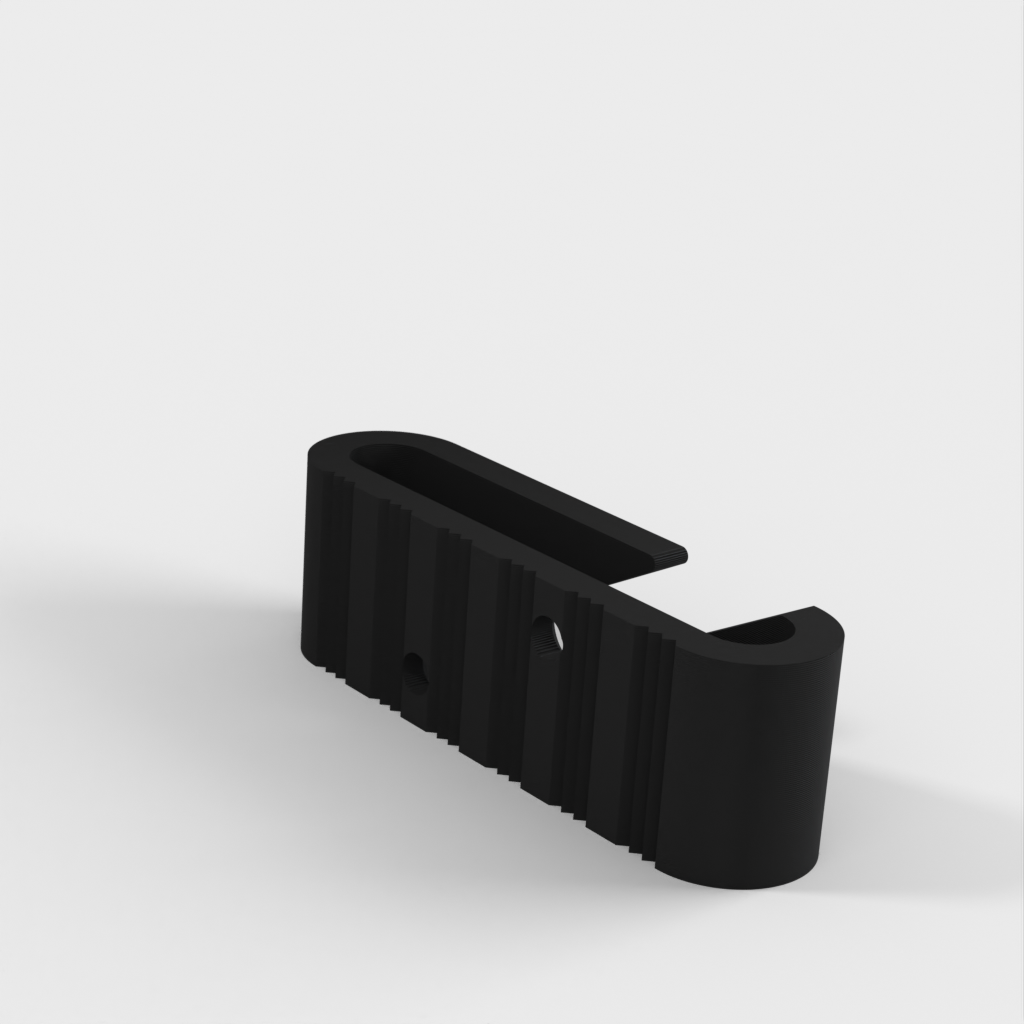 Ein Kabelhalter, der über die Senklöcher mit Schrauben oder aufgrund seiner Rillen auch mit Heißkleber an einer Oberfläche befestigt werden kann.