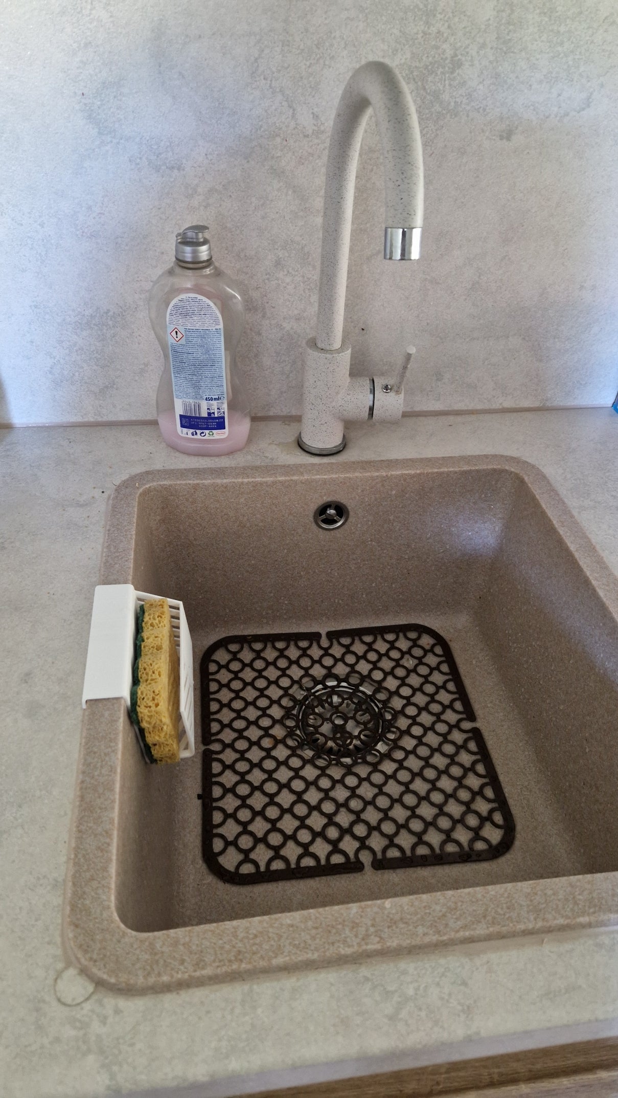 Der Schwammhalter ist speziell für den Rand von Keramik- oder Steinspülen mit einer Breite von 25 mm konzipiert. Seine praktischen Abflusslöcher im Chevron-Muster sorgen für einen effizienten Abfluss, sodass Ihr Schwamm trocken und frisch bleibt.