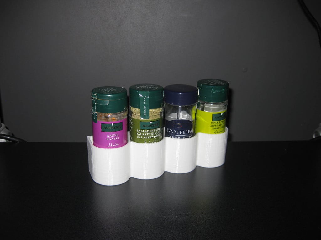 Ein einfacher Halter für vier Gewürzdosen. 42 mm hoch und 183 mm breit mit einem maximalen Durchmesser von 43 mm Dosen. Mit diesem Halter können Sie Ihre Gewürze einfach aufbewahren und eine aufgeräumte Küchenumgebung schaffen.
