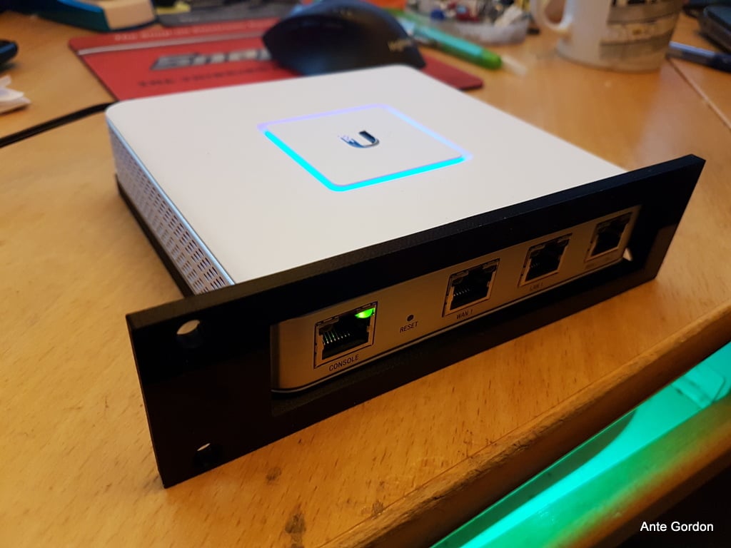 Rechteckige 19-Zoll-Montagehalterung, die speziell für das Ubiquiti Security Gateway (USG) entwickelt wurde. Diese Halterung bietet eine sichere und stabile Möglichkeit, Ihren Router in einem Rack zu montieren. Dies ist ideal für professionelle und private Benutzer, die ihre Netzwerkkonfigurationen effizient organisieren möchten. Die Halterung ist für die Aufnahme des USG ausgelegt und stellt sicher, dass Ihr Gerät gut gestützt und leicht zugänglich ist.