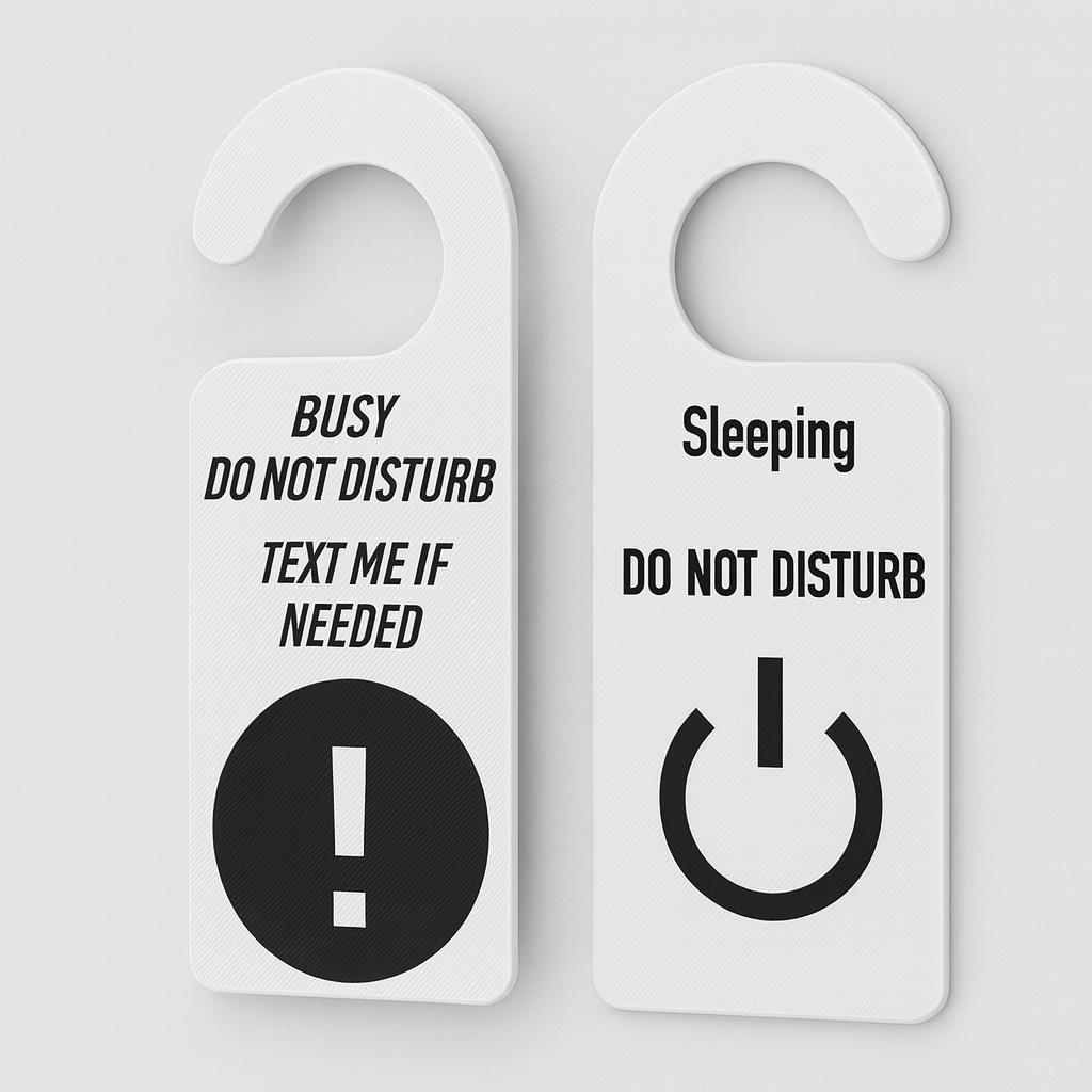 Dieses Zeichen ist eine höfliche Möglichkeit, den Leuten mitzuteilen, dass Sie konzentriert sind, arbeiten oder einfach nur für den Moment in Ruhe sein möchten. Das Zeichen schafft es, Ihren Wunsch, in Ruhe gelassen zu werden, auf eine feste und gleichzeitig höfliche Weise zum Ausdruck zu bringen, sodass Sie Frieden und Harmonie bewahren.