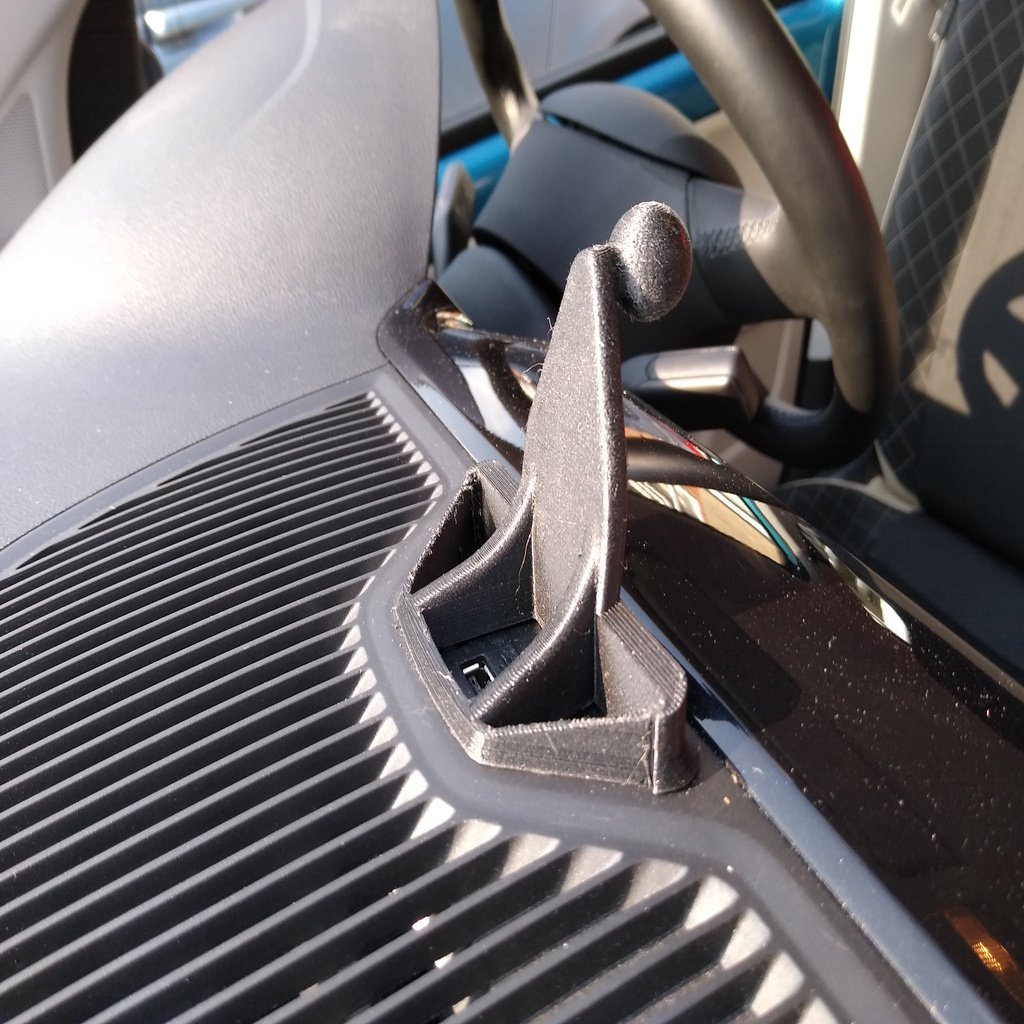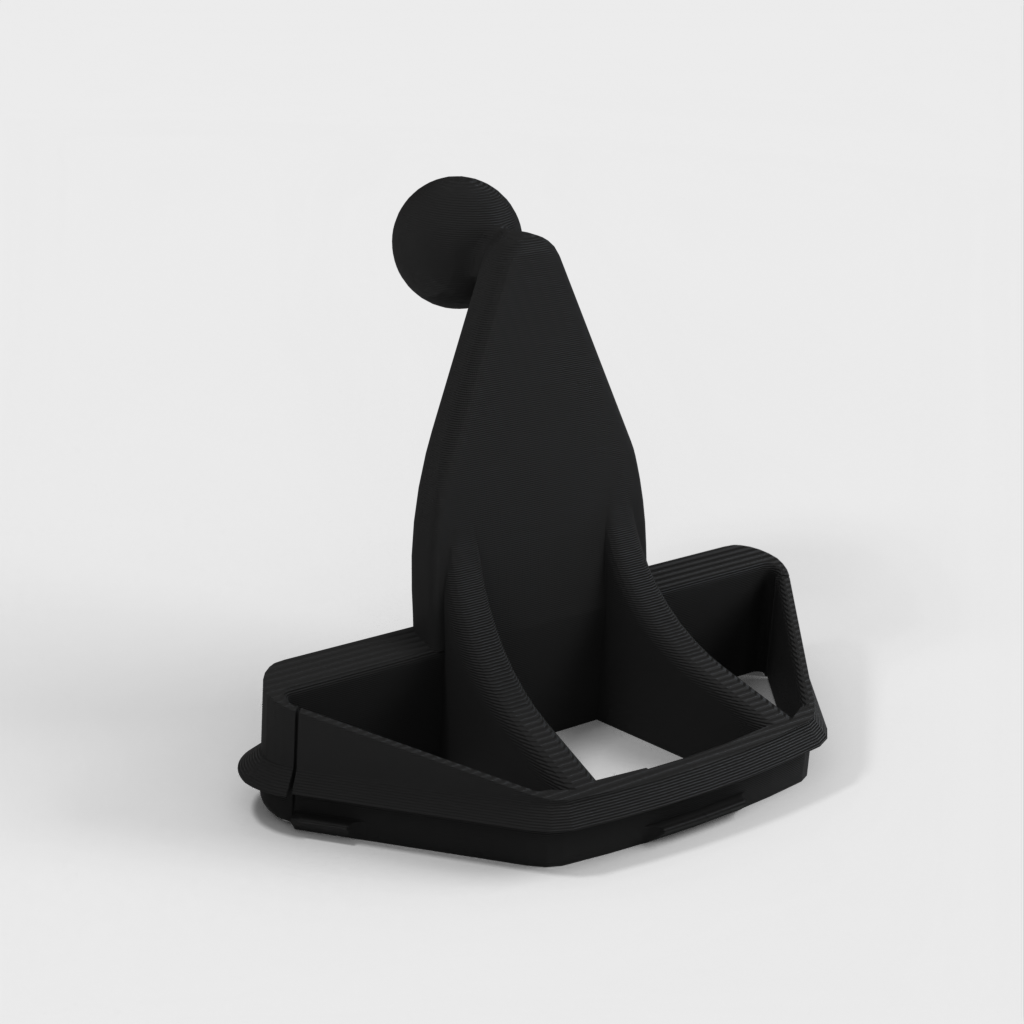 Dies ist eine Garmin-GPS-Halterung für die späteren Halterungen des Citigo, Up und Mi 2017, die über einen USB-Anschluss unter der Basis verfügt. Der Montagehals verfügt über eine Kugel mit einem Radius von 17,4 mm, die auf den Standardanschluss von Garmin-GPS-Halterungen passt. Es musste groß genug sein, um bis zu 6-Zoll-GPS-Geräte aufzunehmen.
