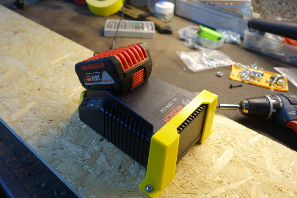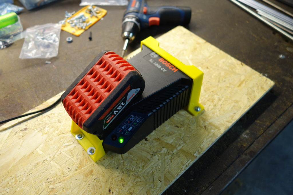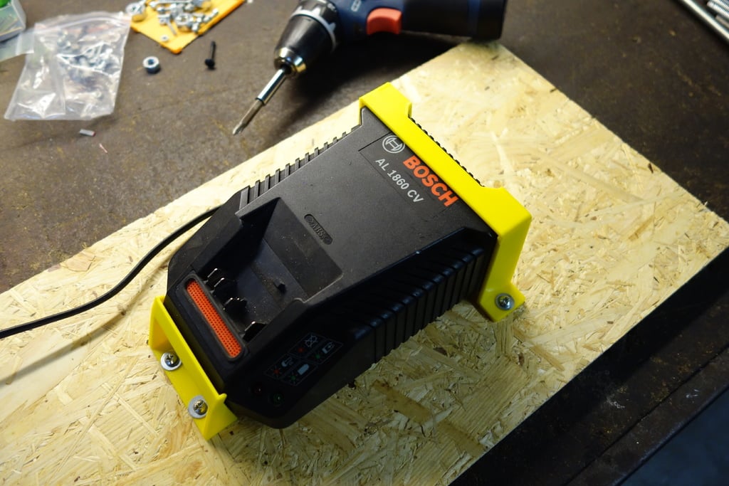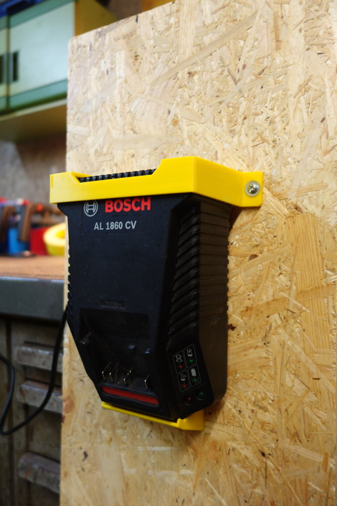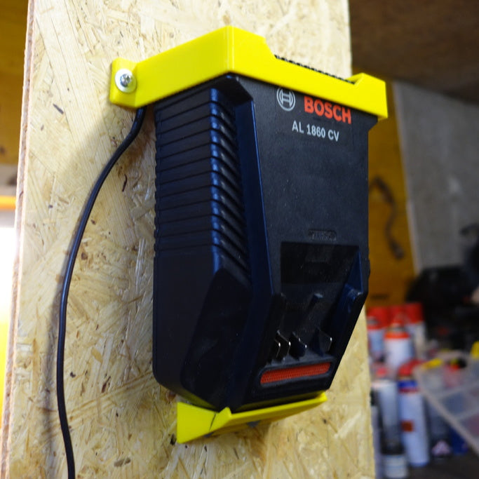 Diese Wandhalterung ist für mein Bosch Ladegerät AL 1860 CV (BC 630 US-Version) konzipiert, sodass ich mein Ladegerät an einer Wand montieren kann. Dadurch nimmt es weniger Platz auf meinem Schreibtisch ein.