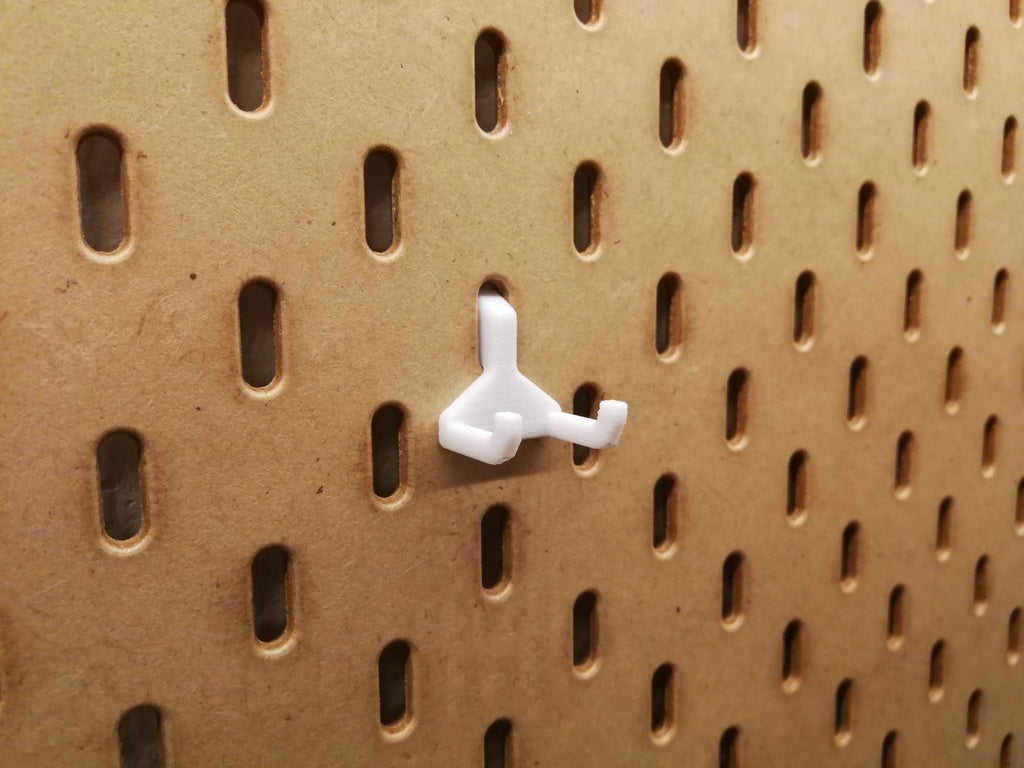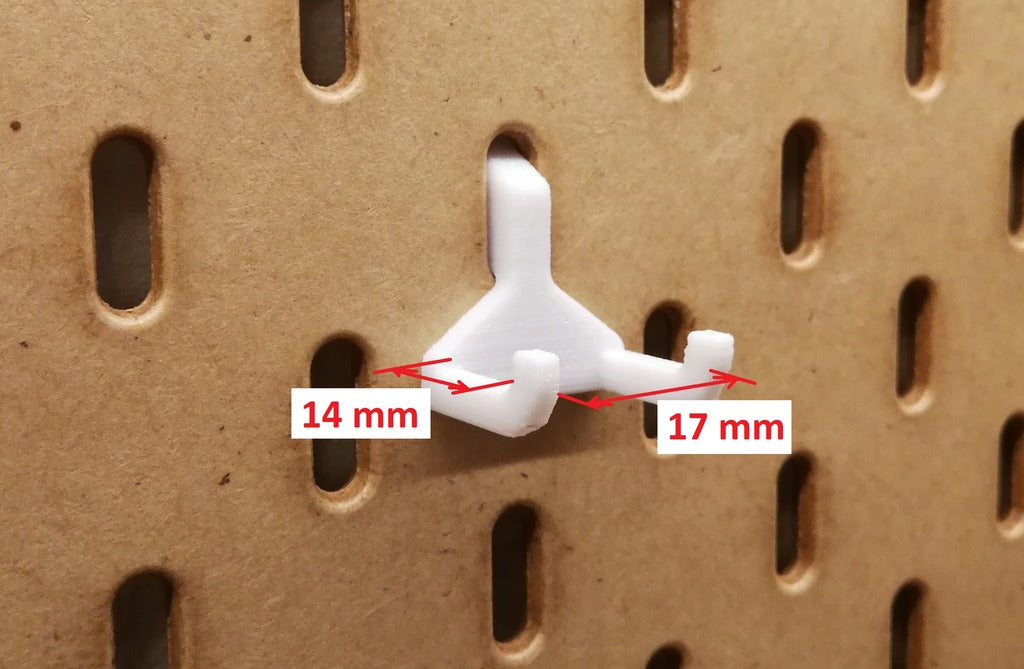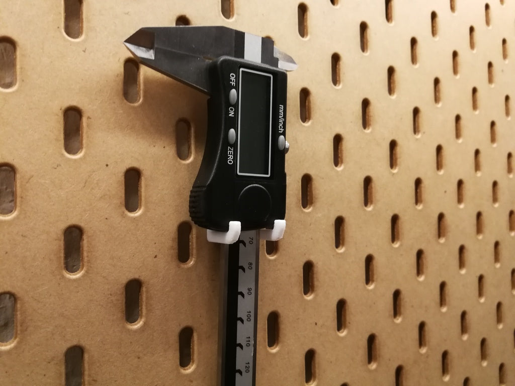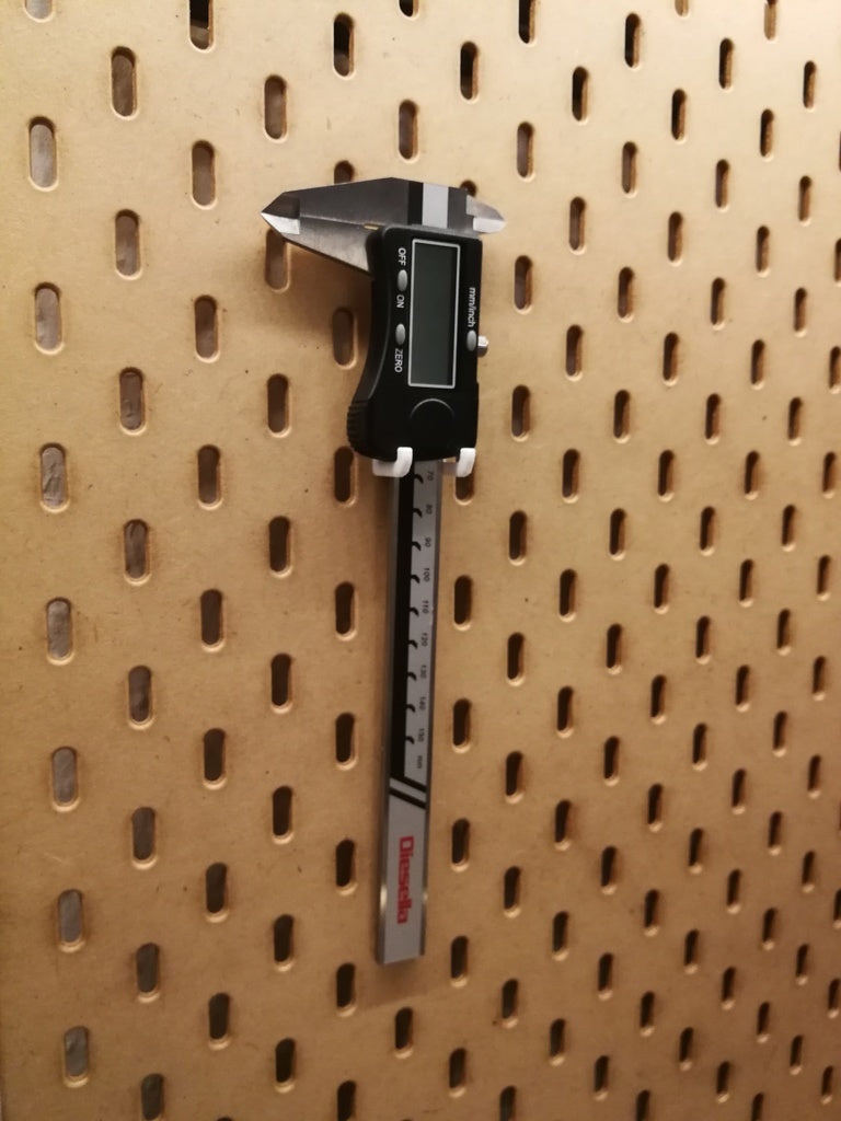 Bremssattelhalter für IKEA Skådis. Dieser Halter dient zur Aufbewahrung eines Messschiebers auf einem IKEA Skådis Steckbrett. Der Halter misst zwischen den beiden Haken 17 mm und ist 14 mm tief, wie auf einem der Bilder angegeben.