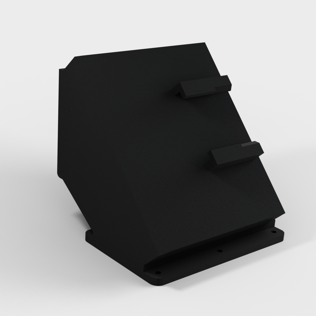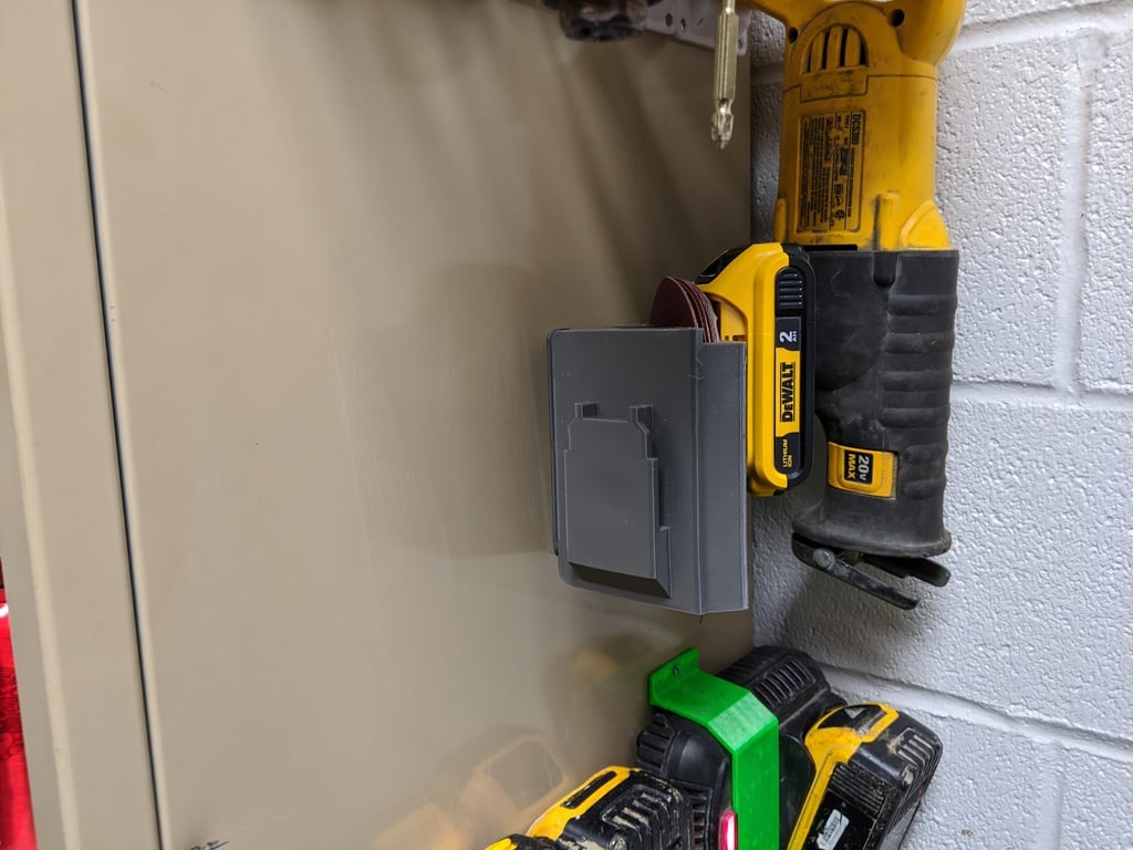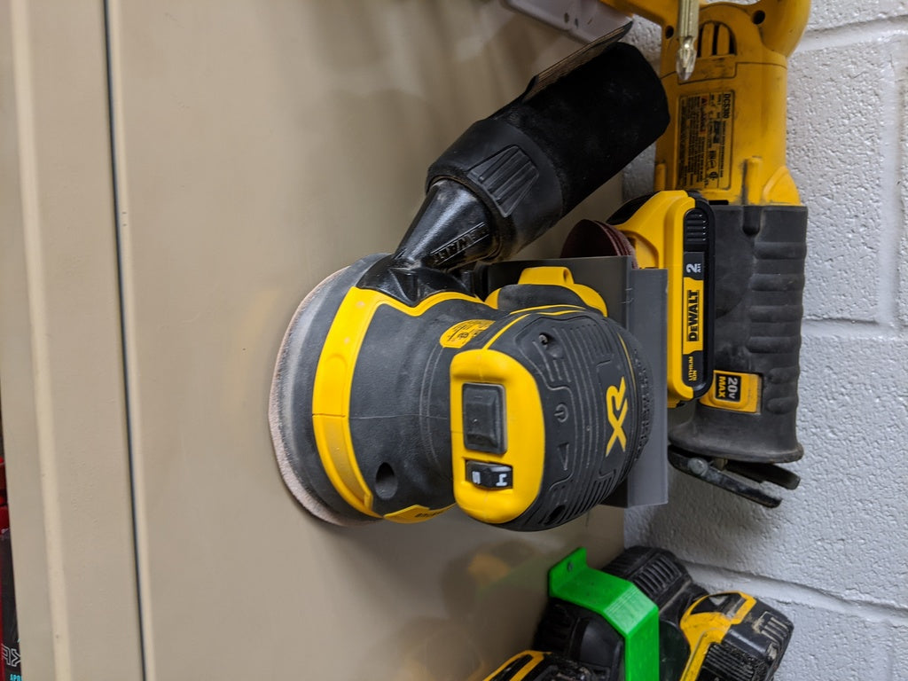 Es handelt sich um eine 90°-Montagehalterung für den Dewalt Exzenterschleifer. Dieses Produkt ist mit einem an der Rückseite montierten Dewalt 20-V-Batteriehalter und Platz für die Aufbewahrung von Schleifpapier ausgestattet.