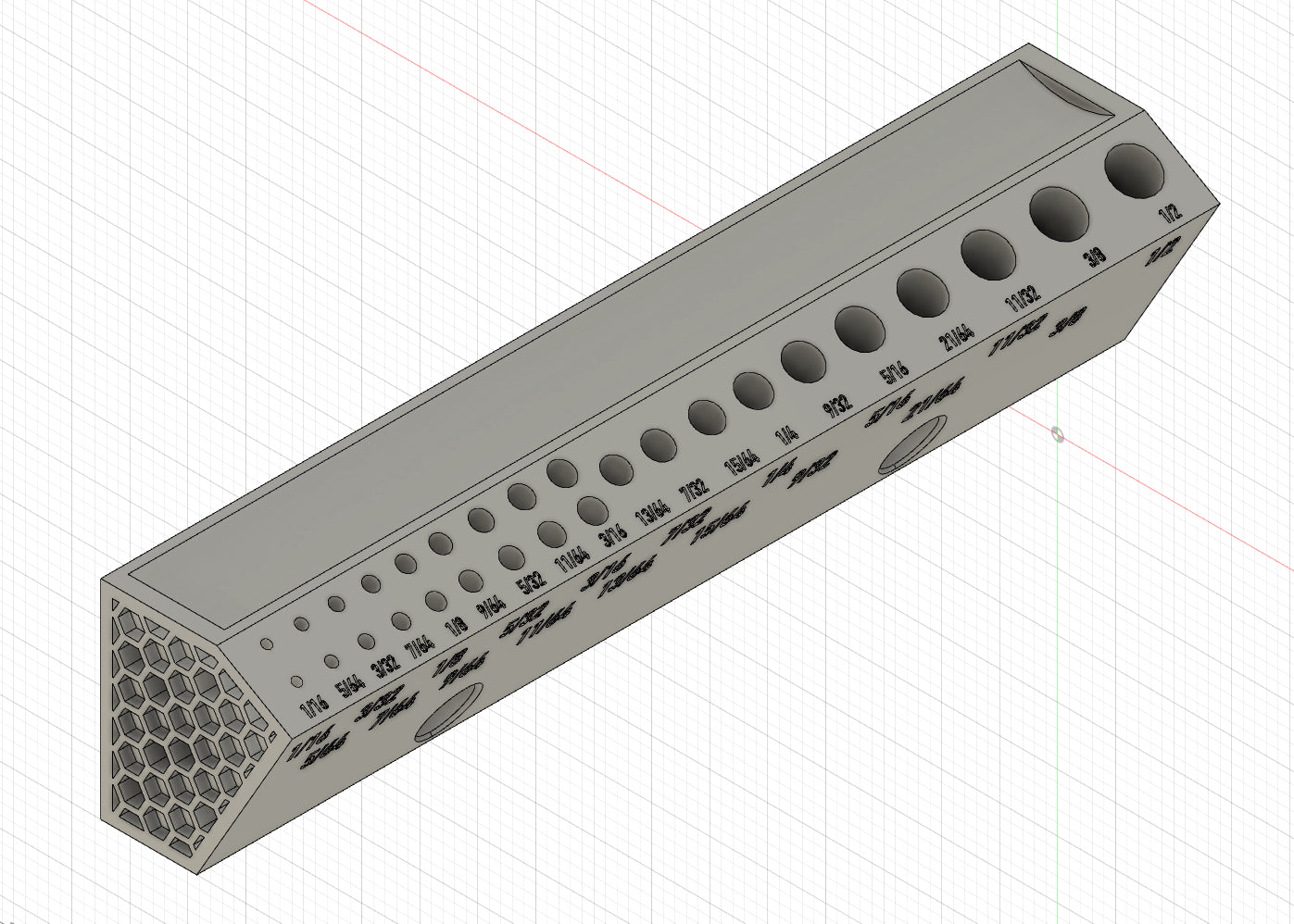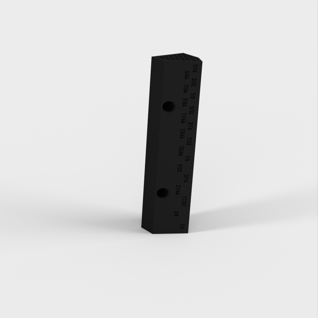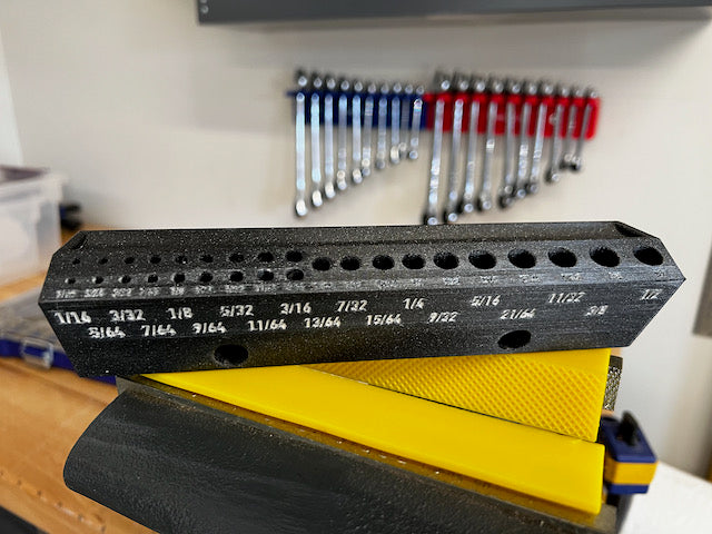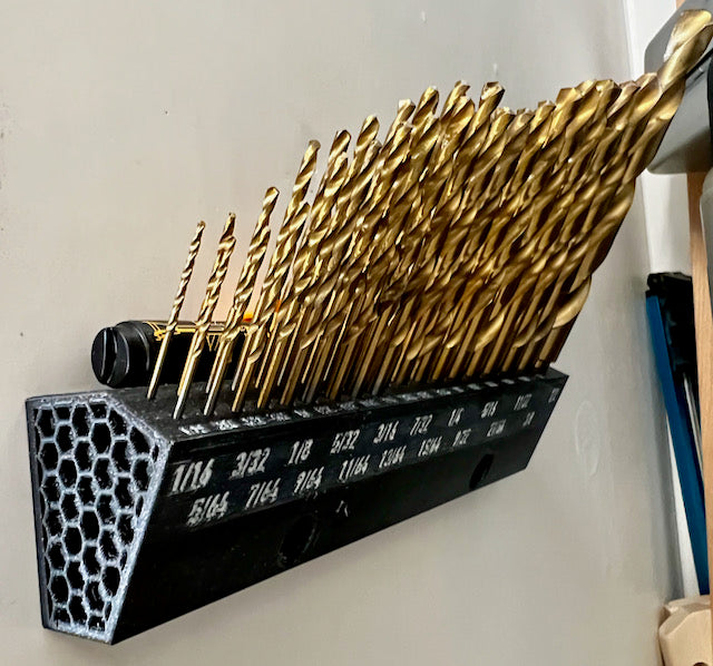 Dies ist ein kompakter, wandmontierter Bohrerhalter für Bits der Größen 1/16" bis 1/2" in 1/64"-Schritten. Der Halter ist 8" lang und hält Bits in einem 30°-Winkel für schnellen und einfachen Zugriff. Für kleinere Bitgrößen (1/16 Zoll bis 3/16 Zoll) gibt es zwei Schlitze, sodass Sie einen Ersatzbit zur Hand haben, falls einer kaputt geht. Hinter den Bits befindet sich eine versenkte Ablage zum Aufbewahren von Stiften, Bleistiften oder sogar zusätzlichen Bits, die Sie während eines Projekts verwenden.