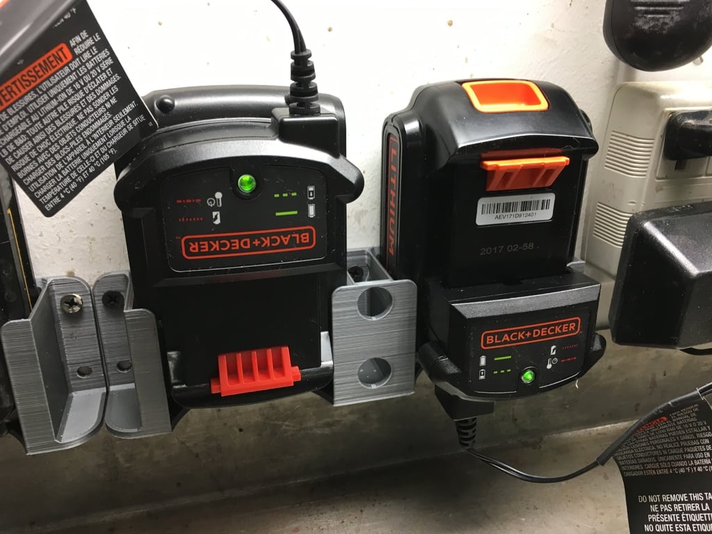 Einzelne oder doppelte Batteriehalter halten Black & Decker-Batterien (und Aftermarket-Batterien) bei Verwendung der mitgelieferten Ladehalterung. Batterien können verkehrt herum oder kopfüber befestigt werden.