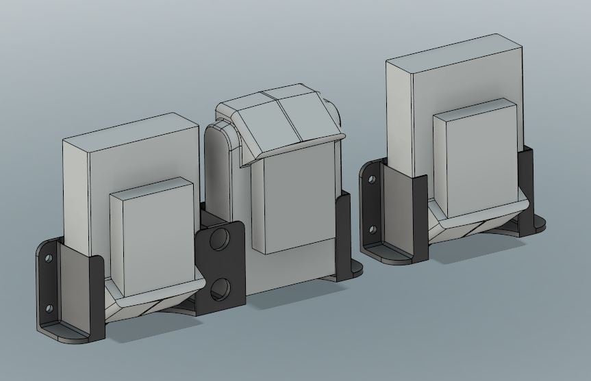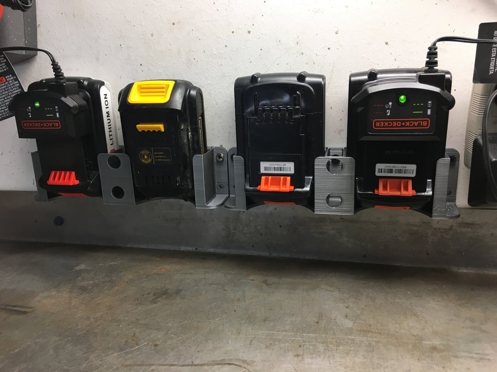 Da sie nur zu Ladezwecken und zur Berücksichtigung von Druckertoleranzen vertikal gehalten werden sollen, sind die Halterungen etwas schlampig konstruiert. Ich lade die DeWalt-Akkus nicht in den Halterungen auf, aber sie passen, sodass ich sie auch nicht im Weg habe.