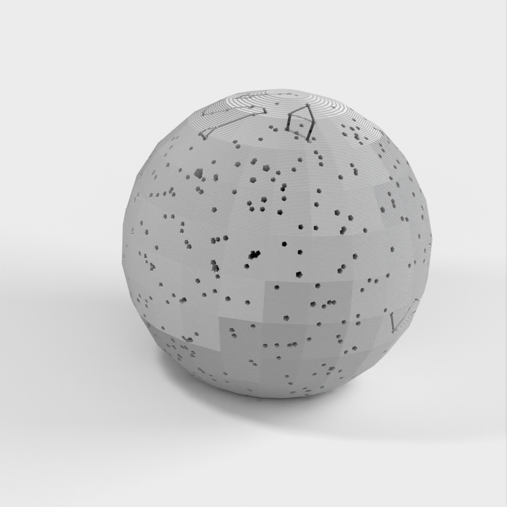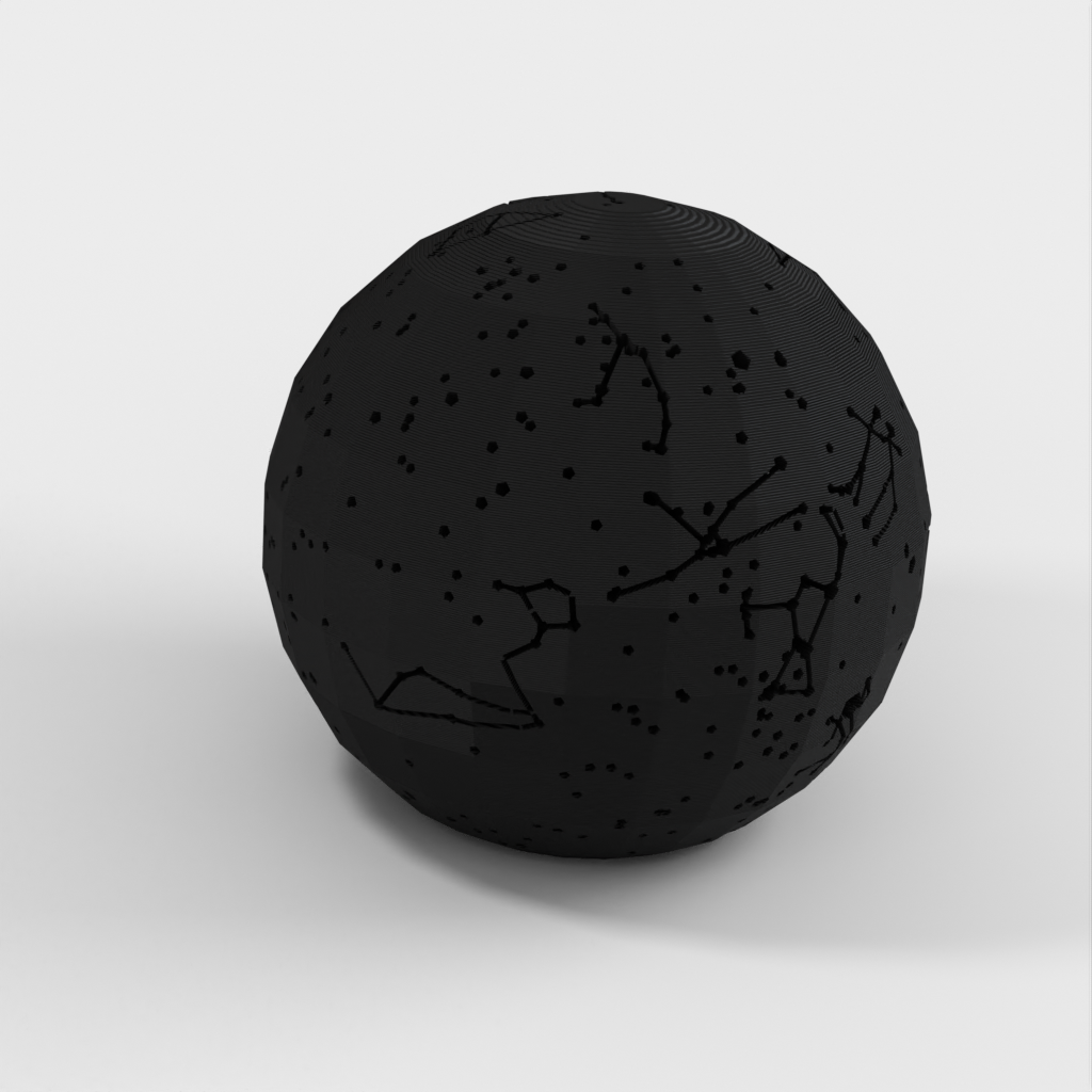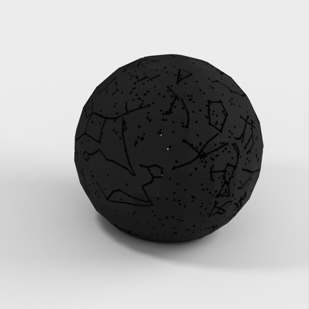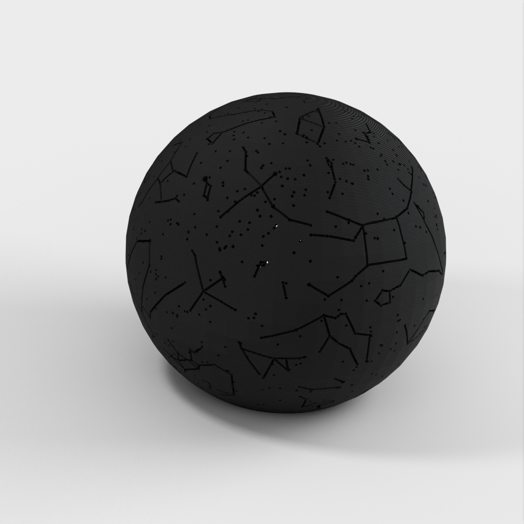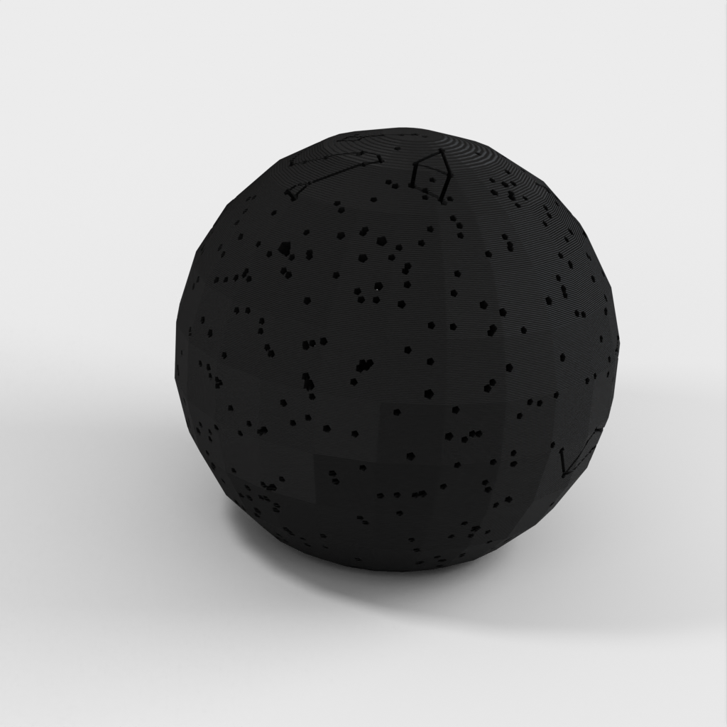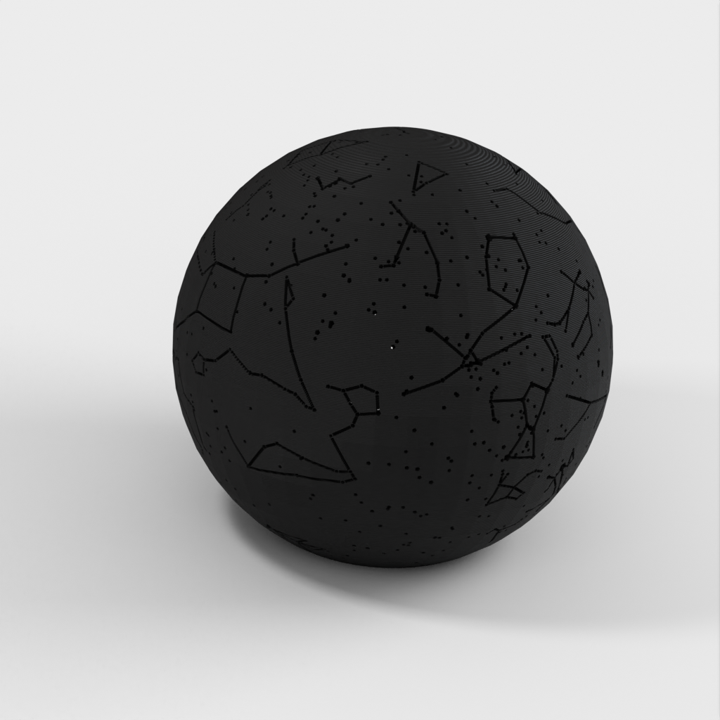 Dieses Produkt ist eine Erweiterung der Celestial Sphere-Modelle und kann STL-Dateien für eine Himmelssphäre generieren. Mit Openscad können Sie viele Parameter ändern und ein 3D-Modell der Himmelssphäre erstellen, das mehr als 1700 der hellsten Sterne und bis zu 50 Sternbilder umfassen kann. Das Modell enthält auch Pläne für eine äquatoriale Montierung, einschließlich der Möglichkeit einer LED-Beleuchtung im Inneren der Kugel.