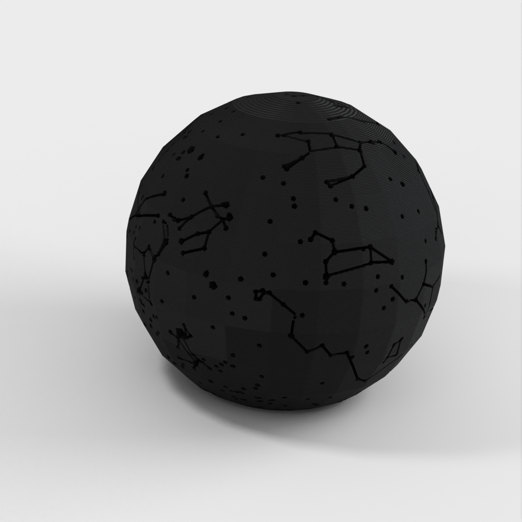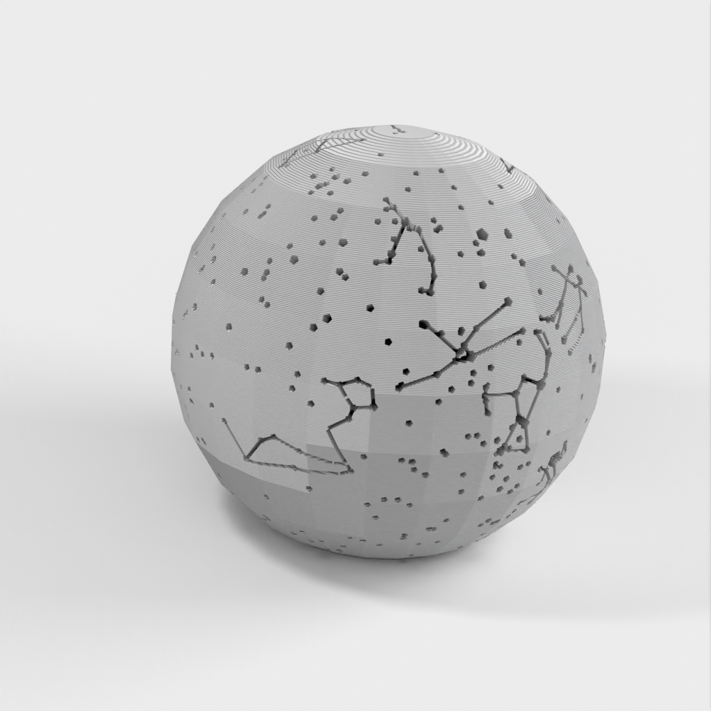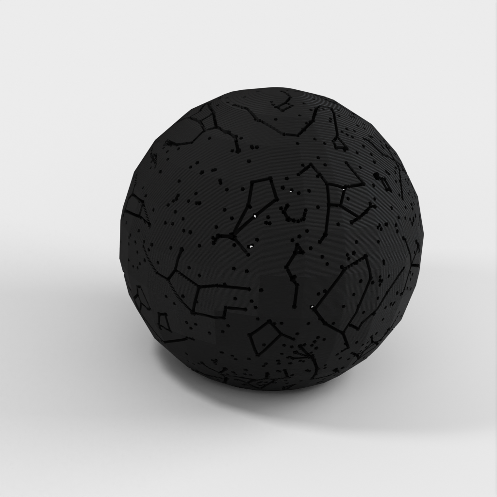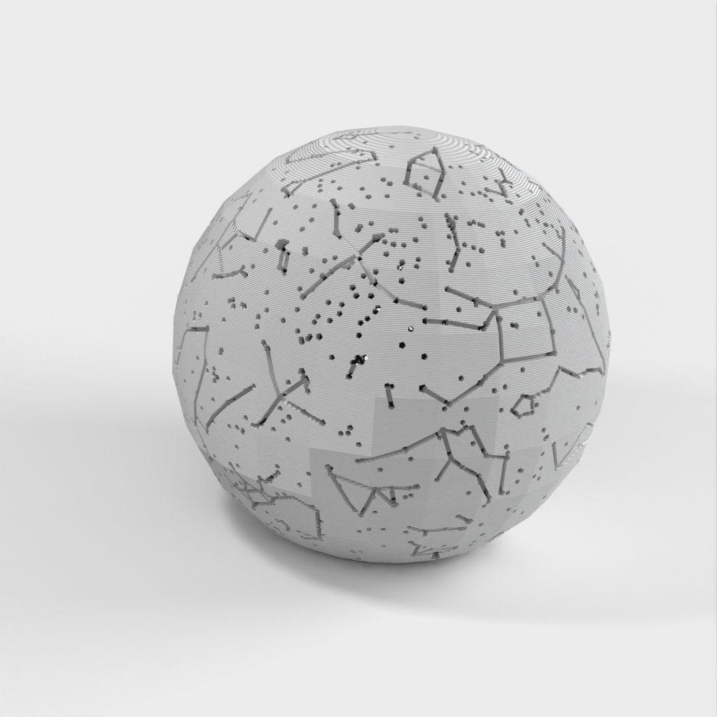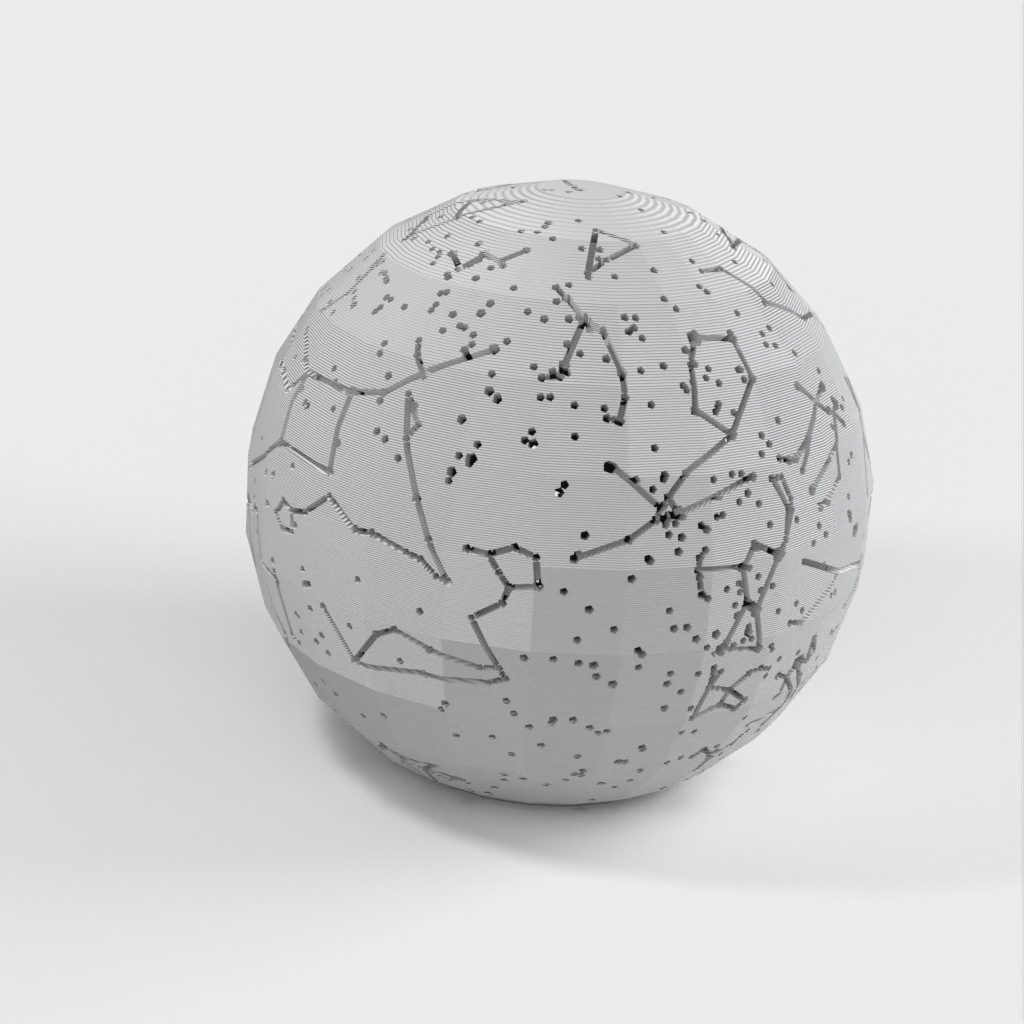 Dieses Produkt ist eine Erweiterung der Celestial Sphere-Modelle und kann STL-Dateien für eine Himmelssphäre generieren. Mit Openscad können Sie viele Parameter ändern und ein 3D-Modell der Himmelssphäre erstellen, das mehr als 1700 der hellsten Sterne und bis zu 50 Sternbilder umfassen kann. Das Modell enthält auch Pläne für eine äquatoriale Montierung, einschließlich der Möglichkeit einer LED-Beleuchtung im Inneren der Kugel.