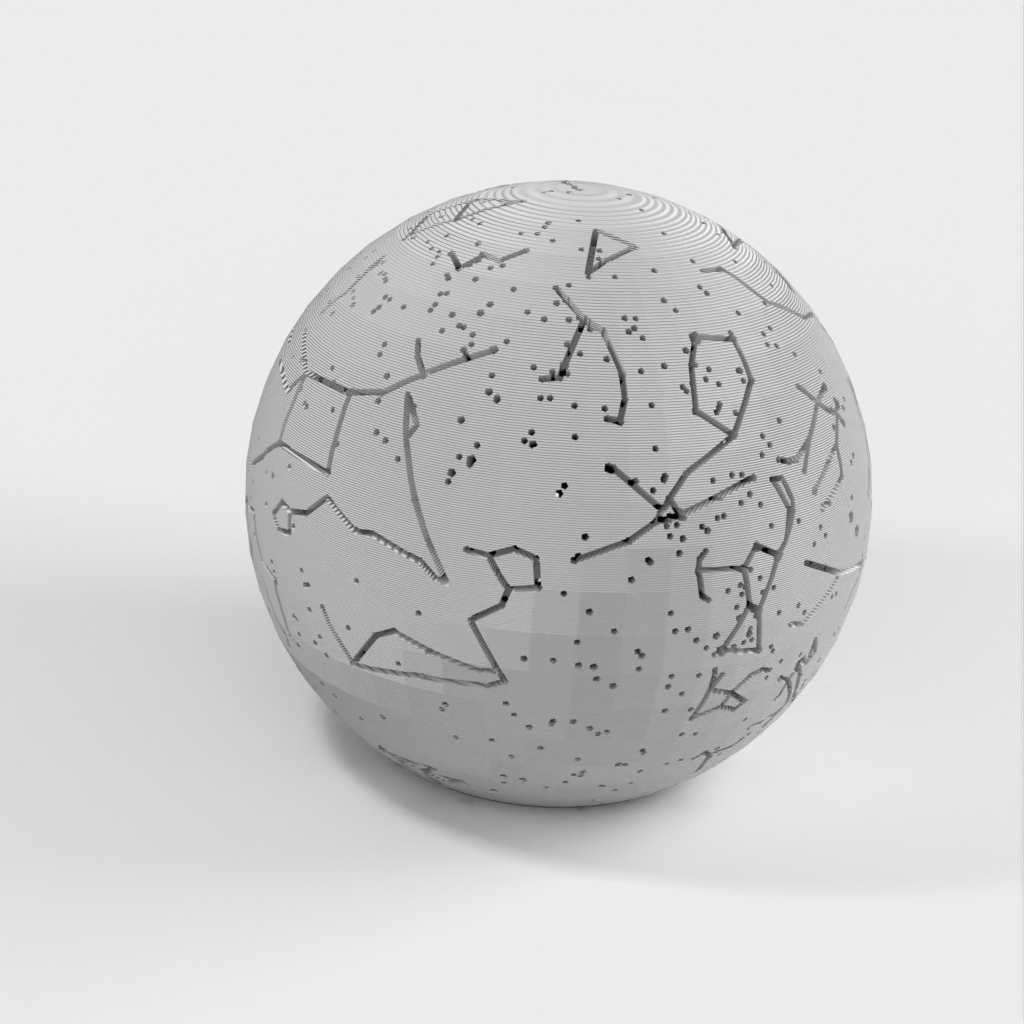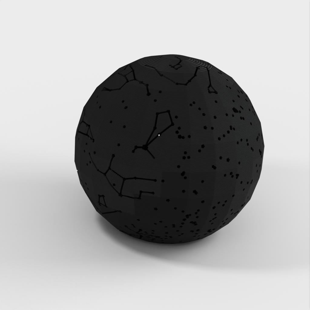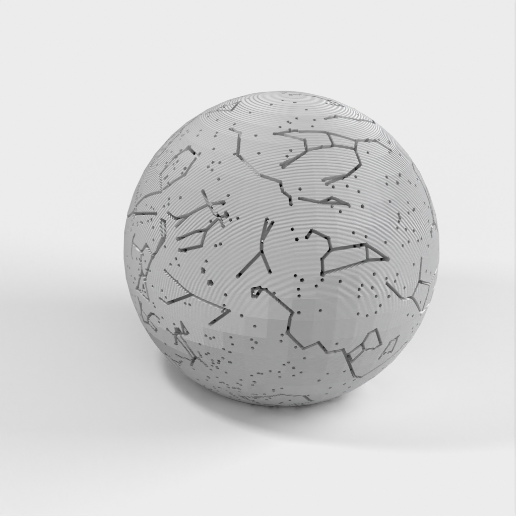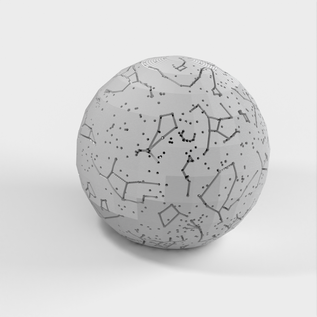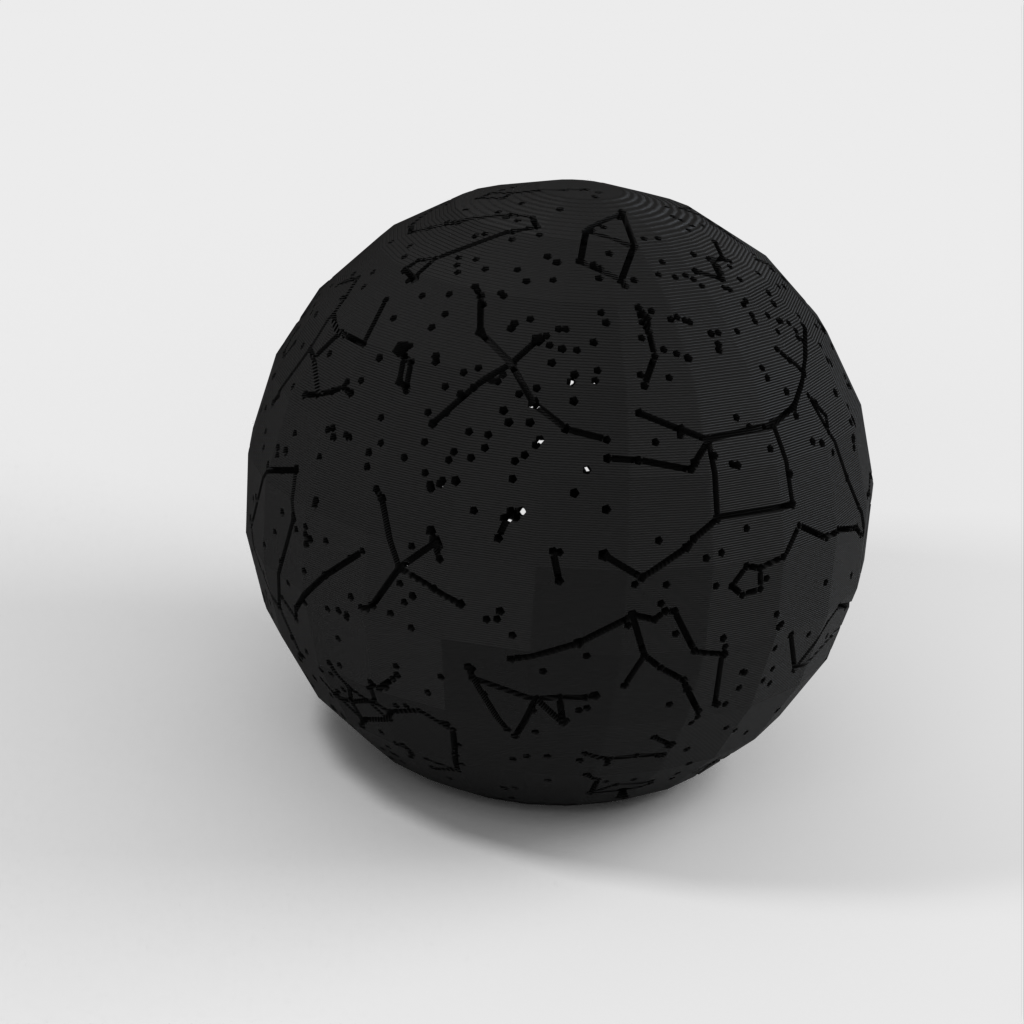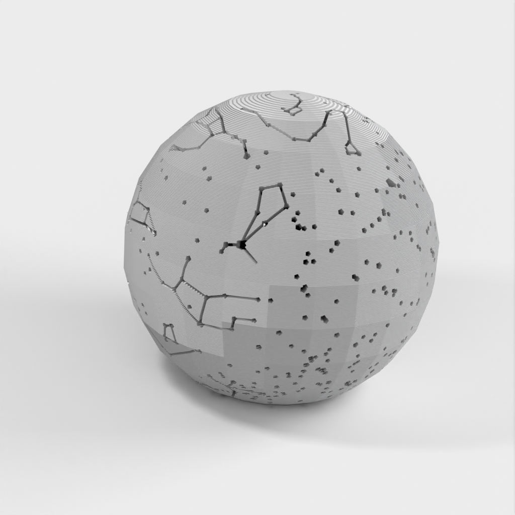 Dieses Produkt ist eine Erweiterung der Celestial Sphere-Modelle und kann STL-Dateien für eine Himmelssphäre generieren. Mit Openscad können Sie viele Parameter ändern und ein 3D-Modell der Himmelssphäre erstellen, das mehr als 1700 der hellsten Sterne und bis zu 50 Sternbilder umfassen kann. Das Modell enthält auch Pläne für eine äquatoriale Montierung, einschließlich der Möglichkeit einer LED-Beleuchtung im Inneren der Kugel.